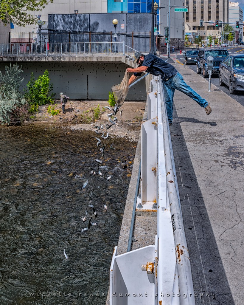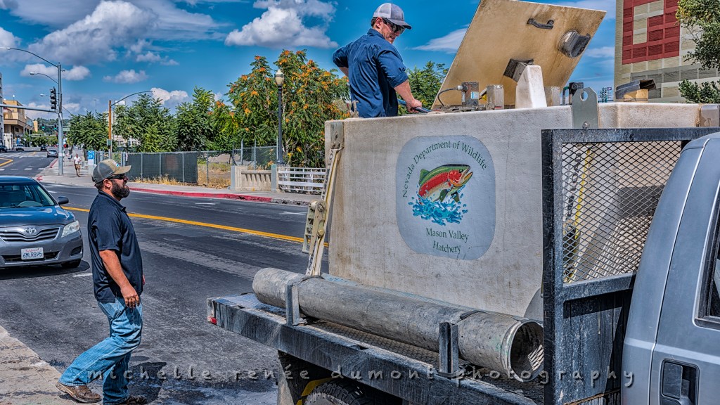 I always thought that Mother Nature provided the fish in the river naturally. Evidently not. The Nevada Department of Wildlife was busy stocking the Truckee River with young trout, tossed from the Lake Street bridge….