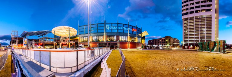 A 180 degree panoramic view of the Greater Nevada Field stadium with the Ice Skating Rink in the foreground.