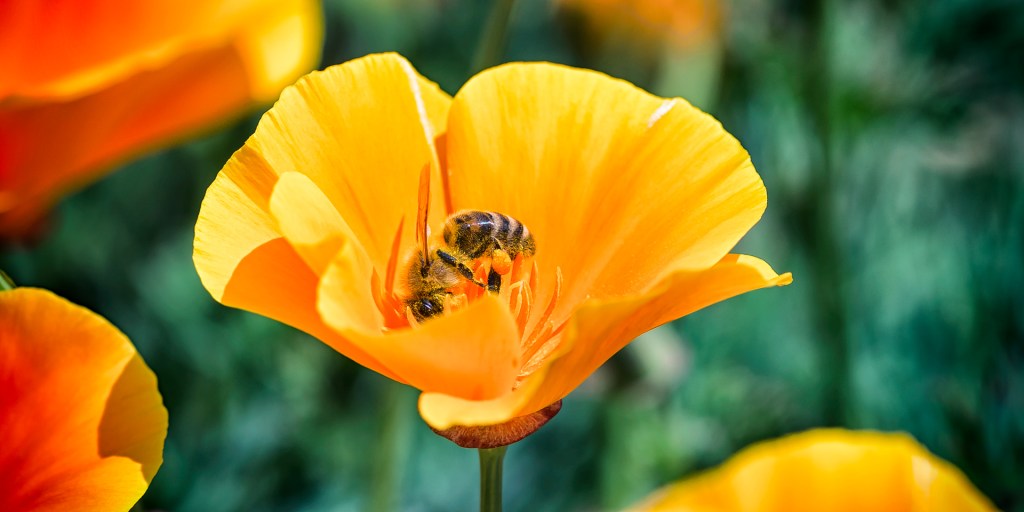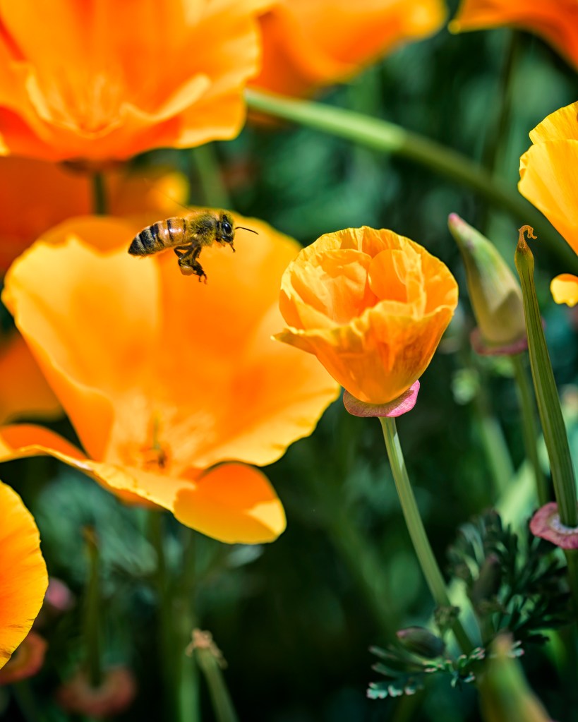 Bees were busy gathering pollen from the bright orange poppies swaying happily in the slight breeze. Dashing from one blossom to the next. Adding to their bounty…