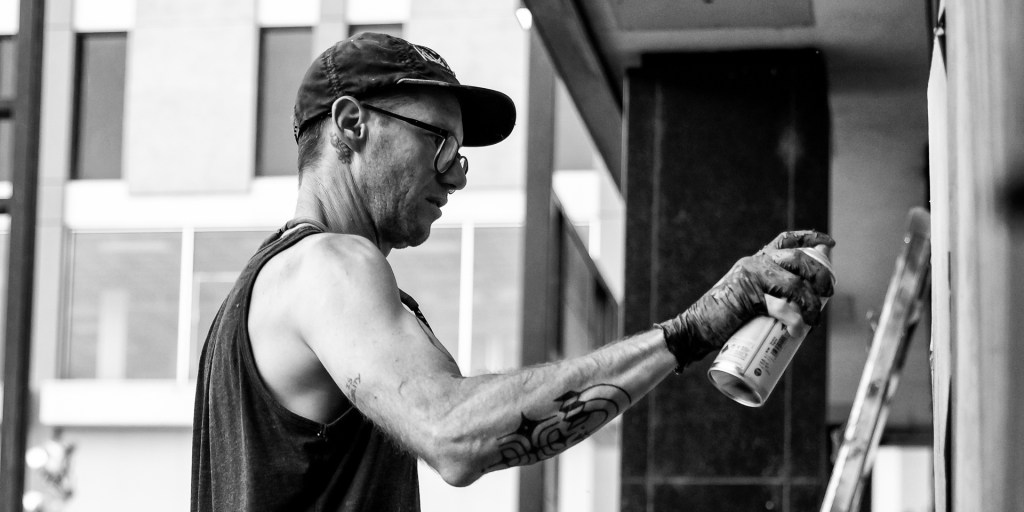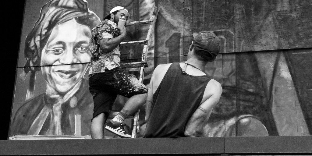 Local Reno muralists Joe C Rock and Erik T Burke hard at work finishing the Black Lives Matter mural painted on sheets of plywood covering the broken out windows of City Hall. Several large windows were smashed during the Black Lives Matter riots.