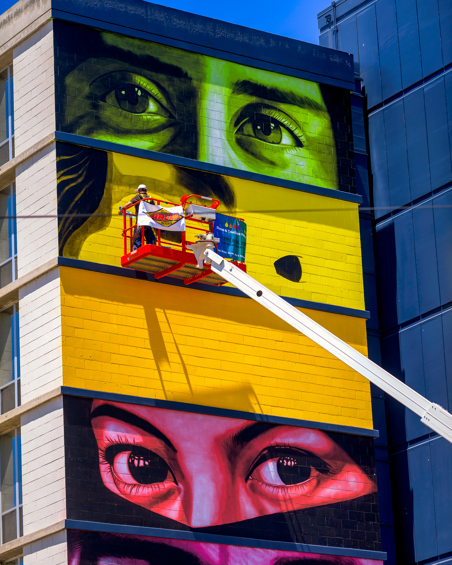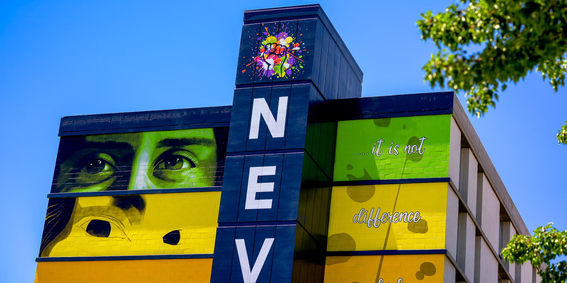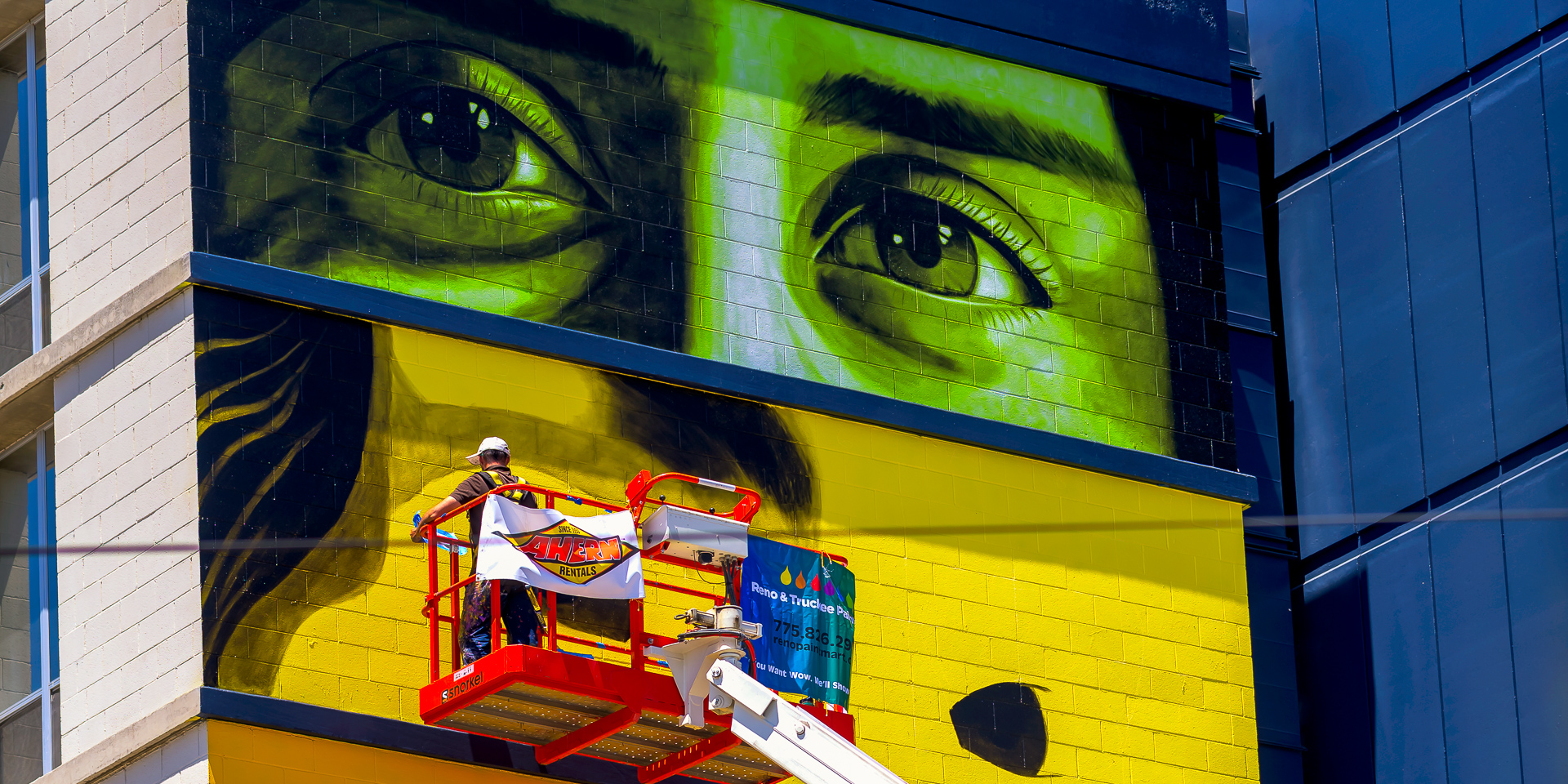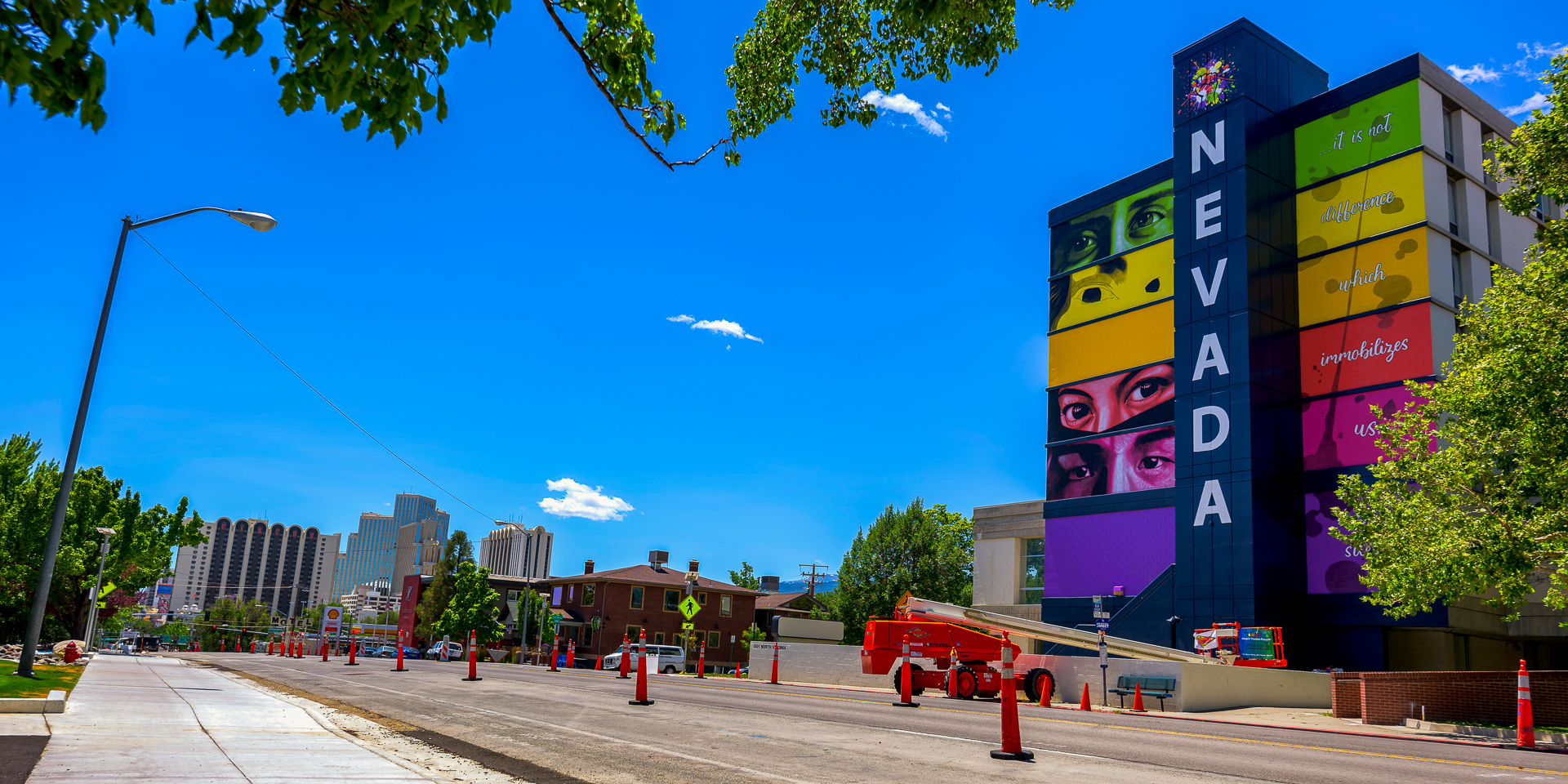 The University of Nevada, Reno is in the process of getting two new art murals. One on Sierra Hall and the other on the Ansari Business Building. Artist and UNR alumnus Rafael Blanco has been commissioned to create the large scale art. This mural, going up on the east facing wall of Sierra Hall along Virginia Street, represents the diversity of races, ethnicities, religions and genders of the World, painted in bright colors. The eyes are meant to engage all who pass by.