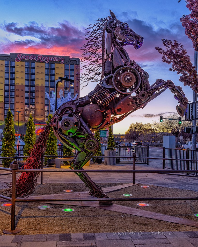 One of a number of one time Burning Man sculptures added to the Reno Neon Line District by Jacobs Entertainment. This sculpture sits on one of the many properties owned by Jacobs Entertainment situated along Fourth Street. In constant motion, this moving sculpture is constructed of various recycled metal auto parts and seems to move to the music that fills the air.