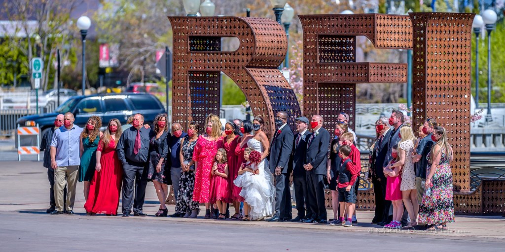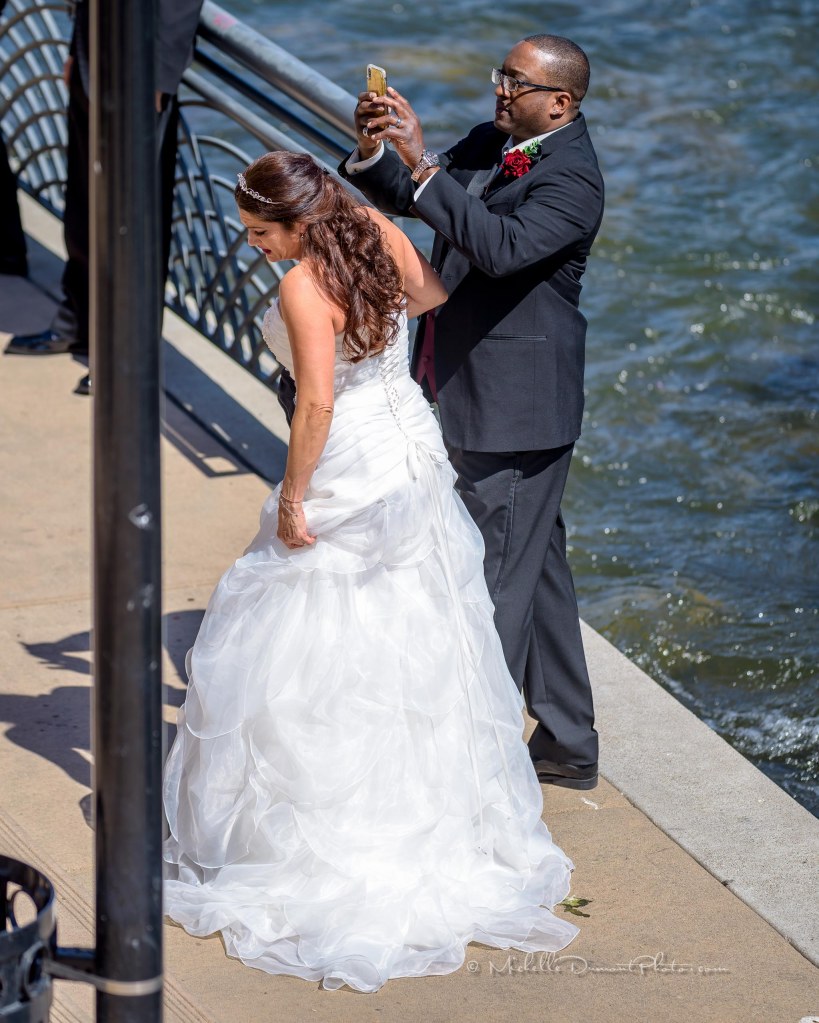 The happy couple was having their photos taken on the City Plaza, including their entire wedding party