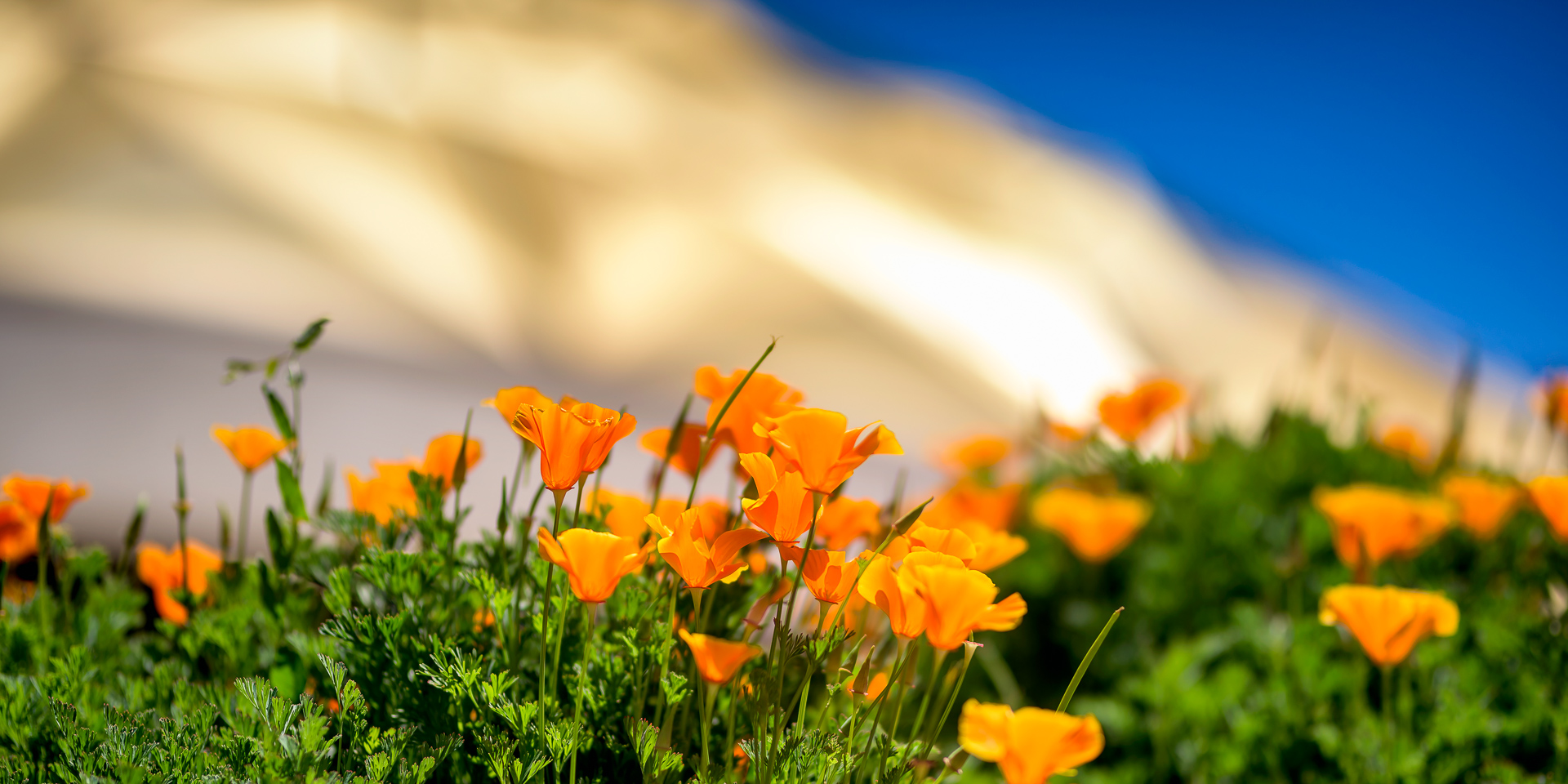 The unique Pioneer Center for the Performing Arts dome appears just beyond the colorful California Poppies