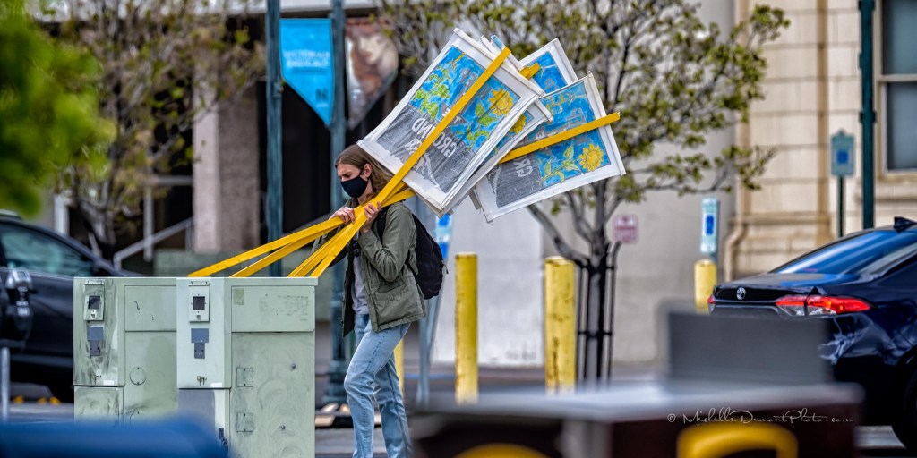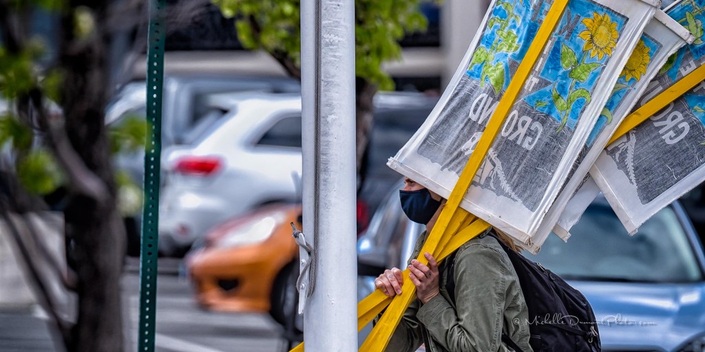 Not certain if this fella was coming from or going to a protest. His signs appear to be protesting the extraction of fossil fuels from the ground…