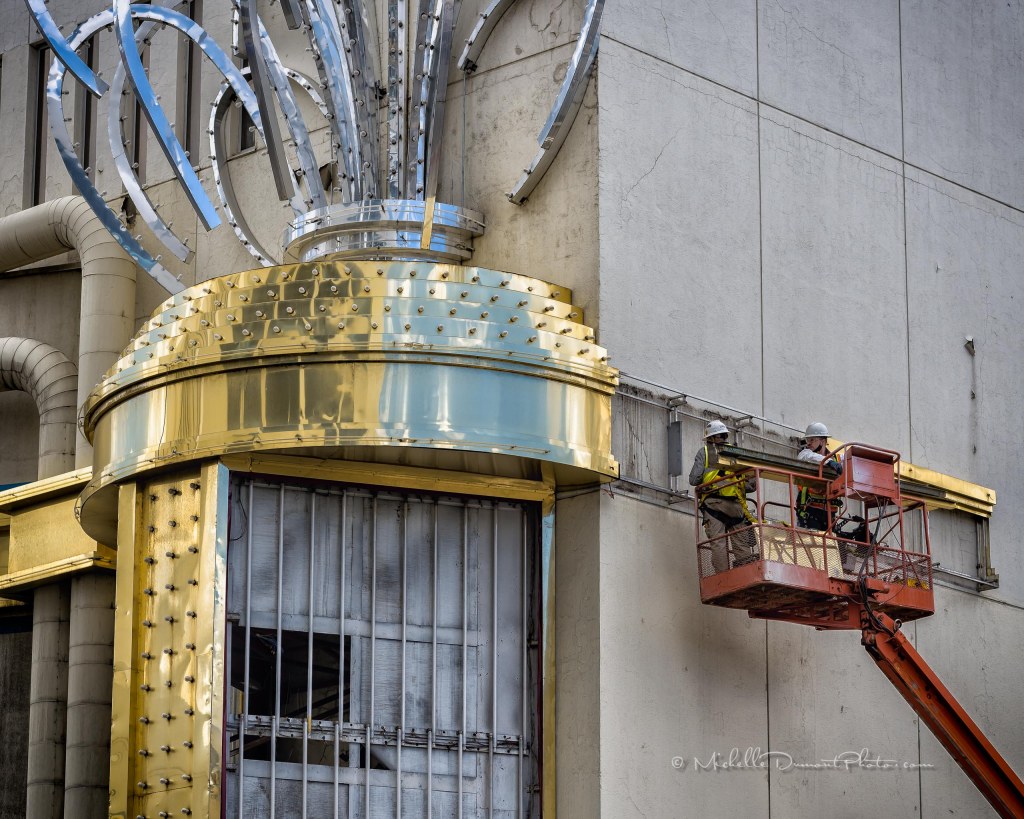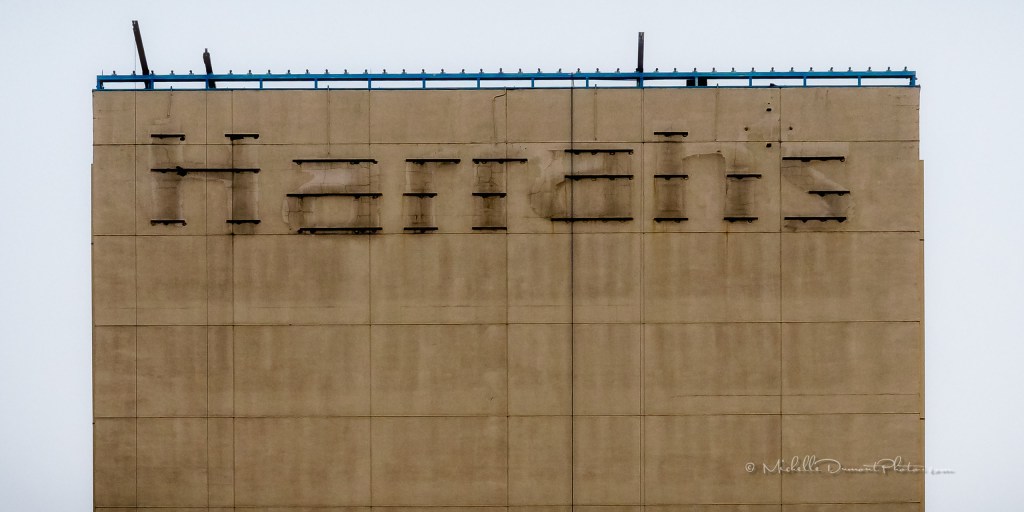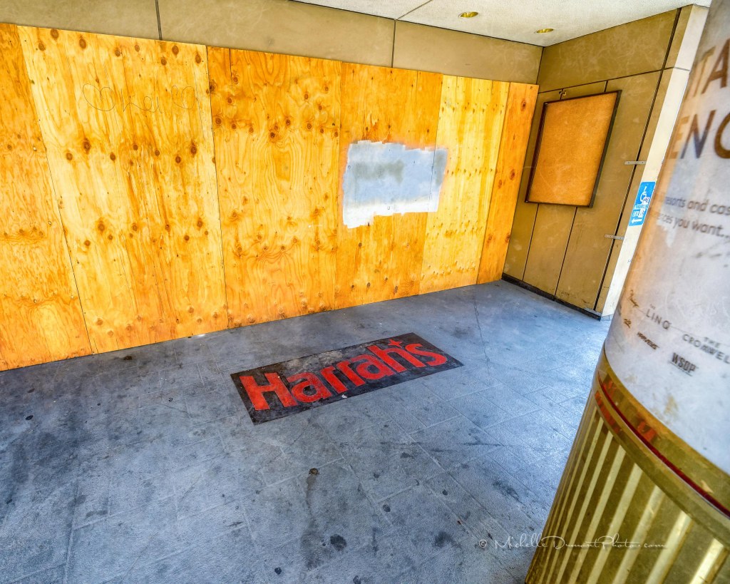 Harrah’s Resort Casino was once a Reno destination and one of the biggest casinos in downtown. Because of the slowdown in Nevada casino revenue and competition from other casinos, they were forced to shut down last year. Today, a new owner is in the process of repurposing the entire property to high end condominium apartments and more. This sign is one of the last of the company’s insignias left on the property.