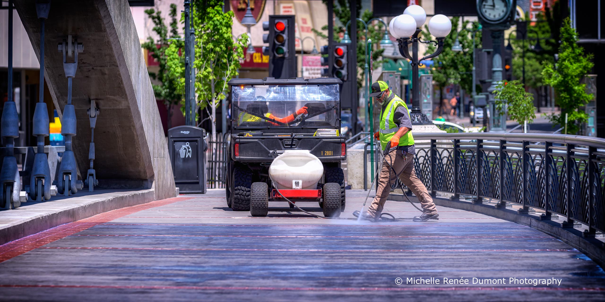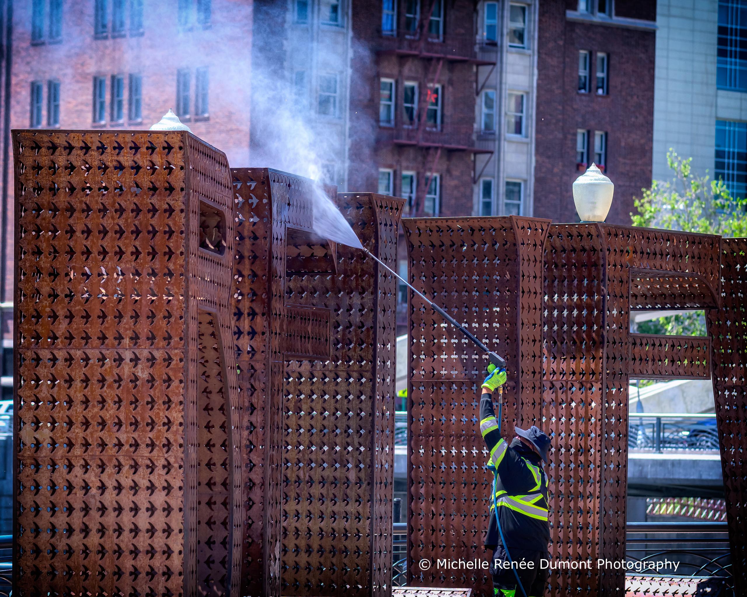 City workers were busy pressure washing sidewalks and sculptures and laying down a protective concrete coating on the sidewalks and bridges today, hopefully in anticipation of things to come. Our usual downtown events and celebrations following a year of isolation
