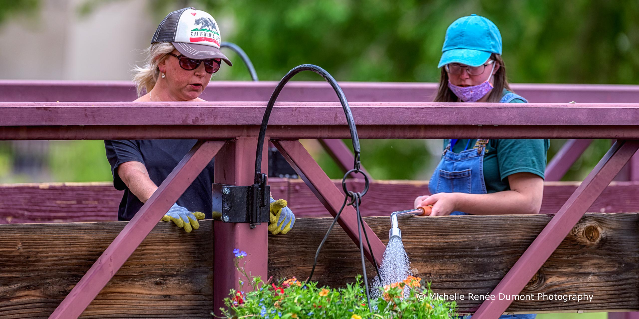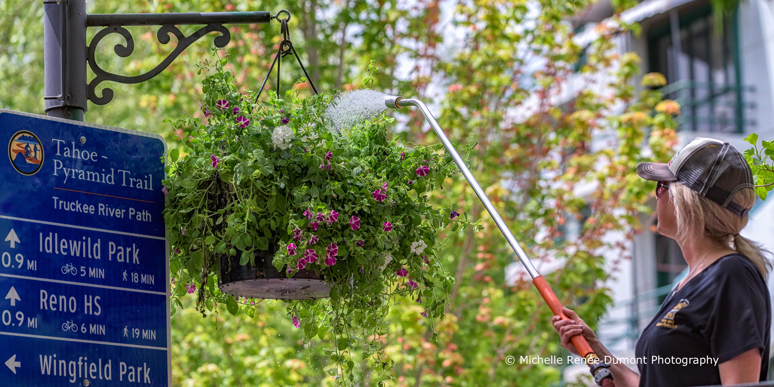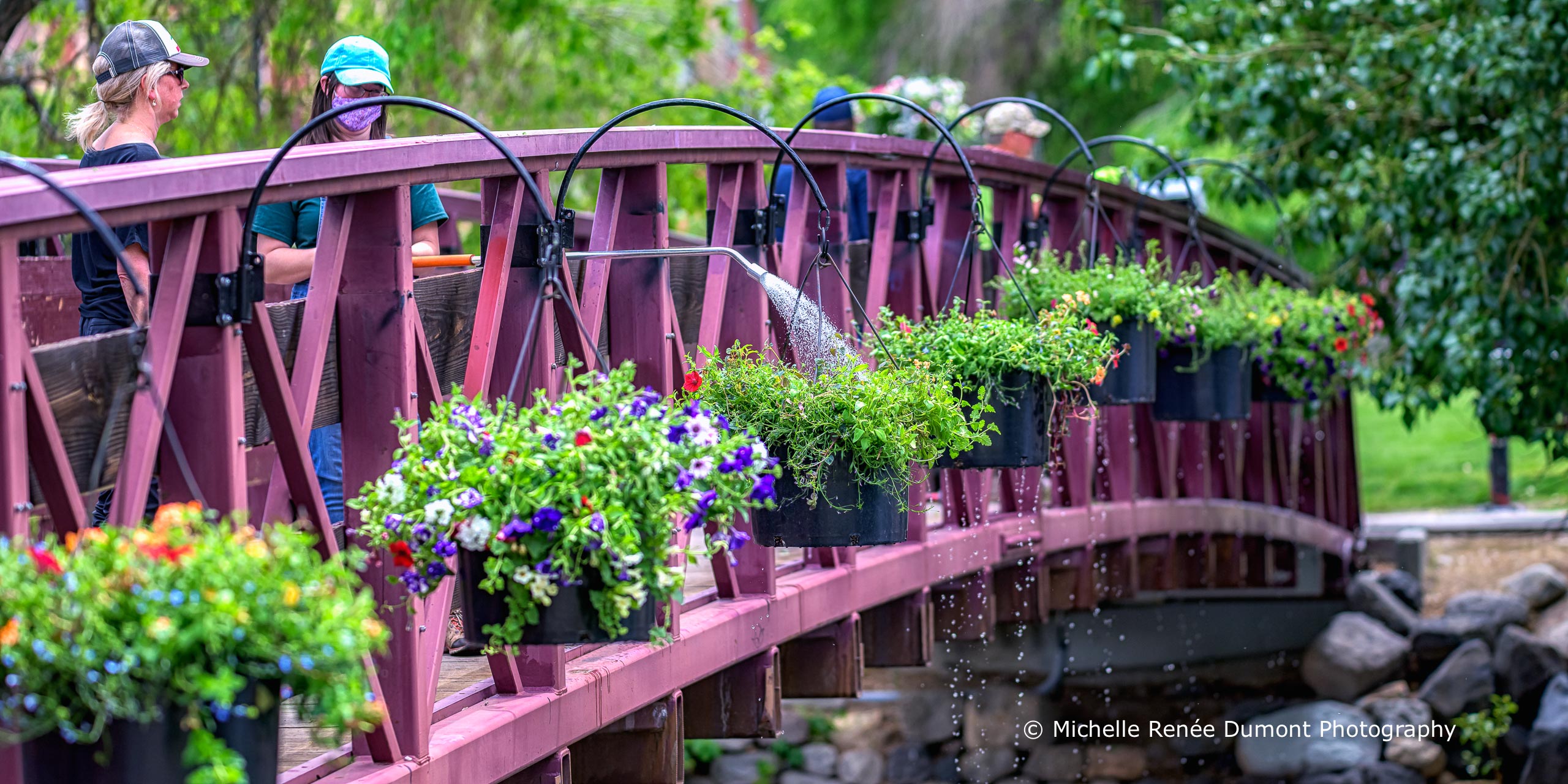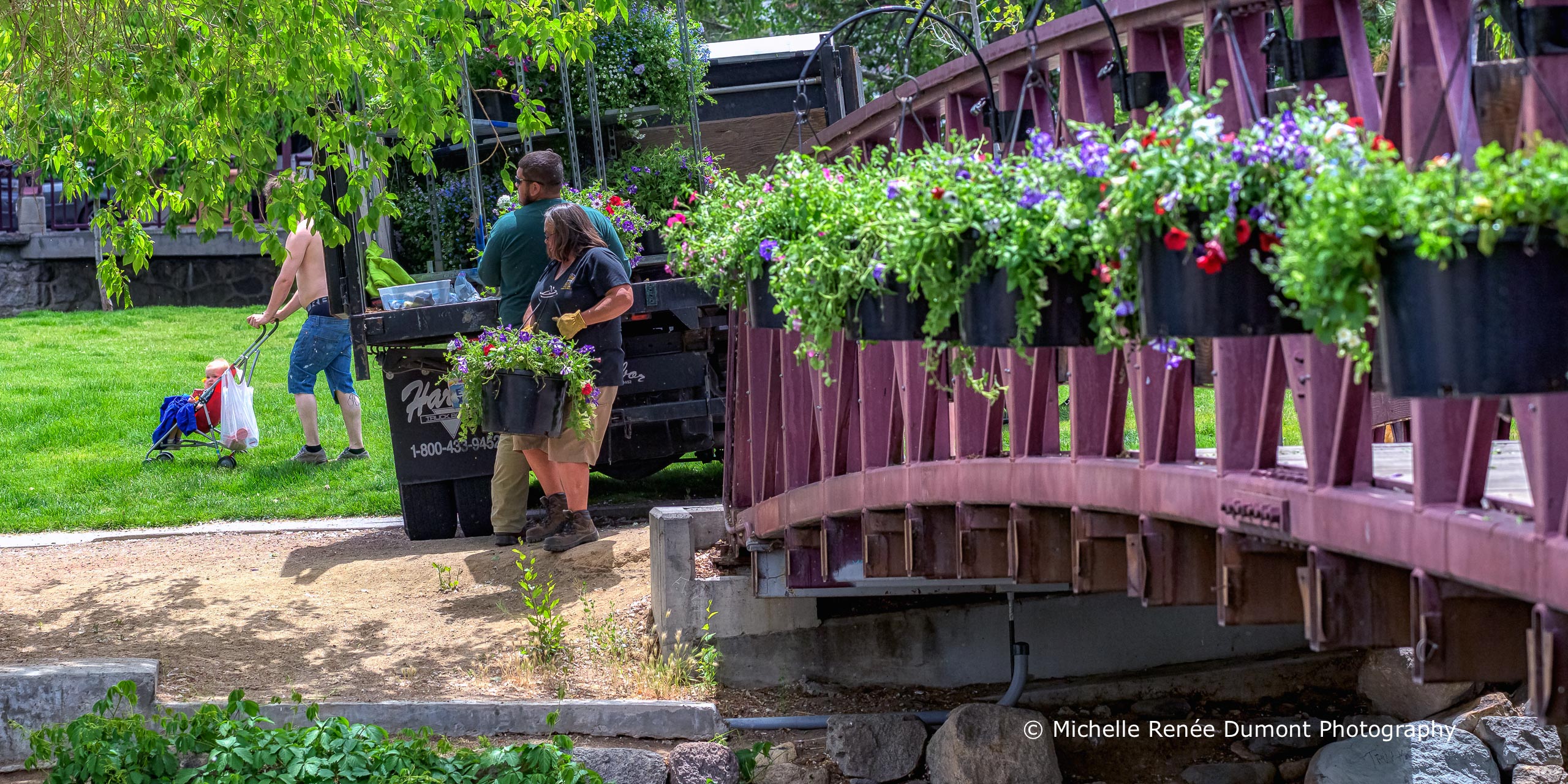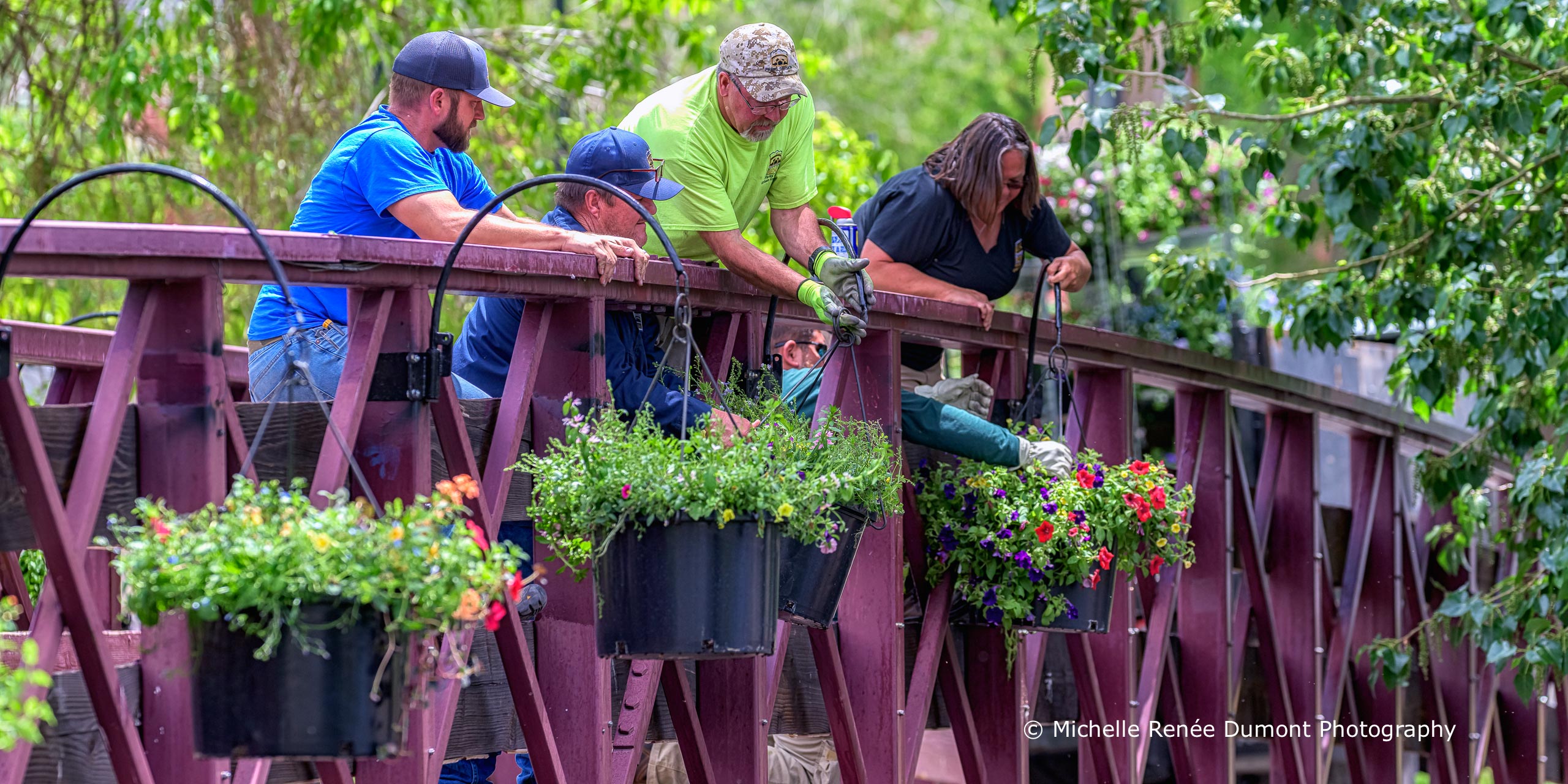 …when the Parks and Recreation crew hang the flower pots along the Riverwalk and along the path in Wingfield Park. The pots will be watered weekly and the flowers will end up hanging down over the edge approx 6 feet by season’s end.