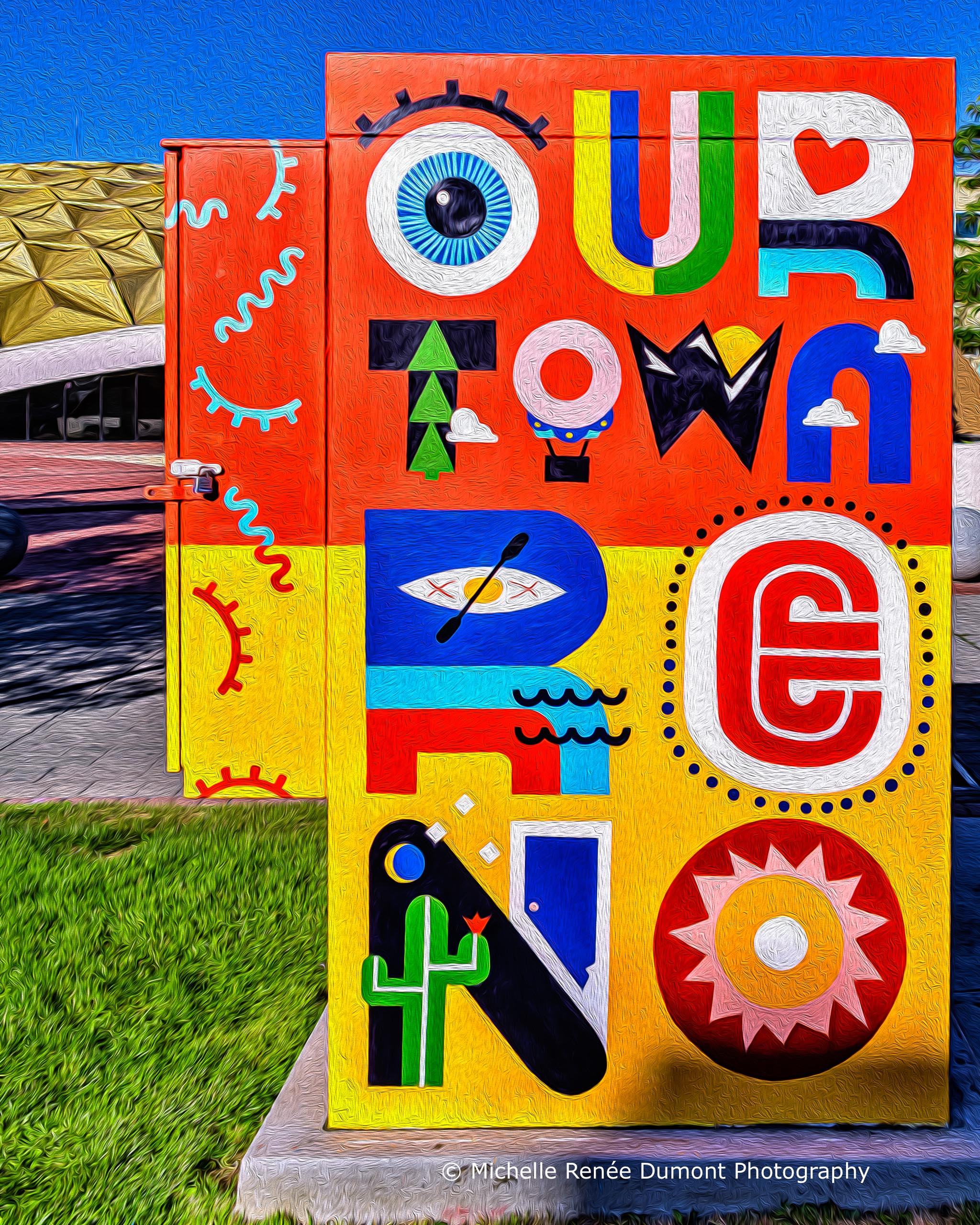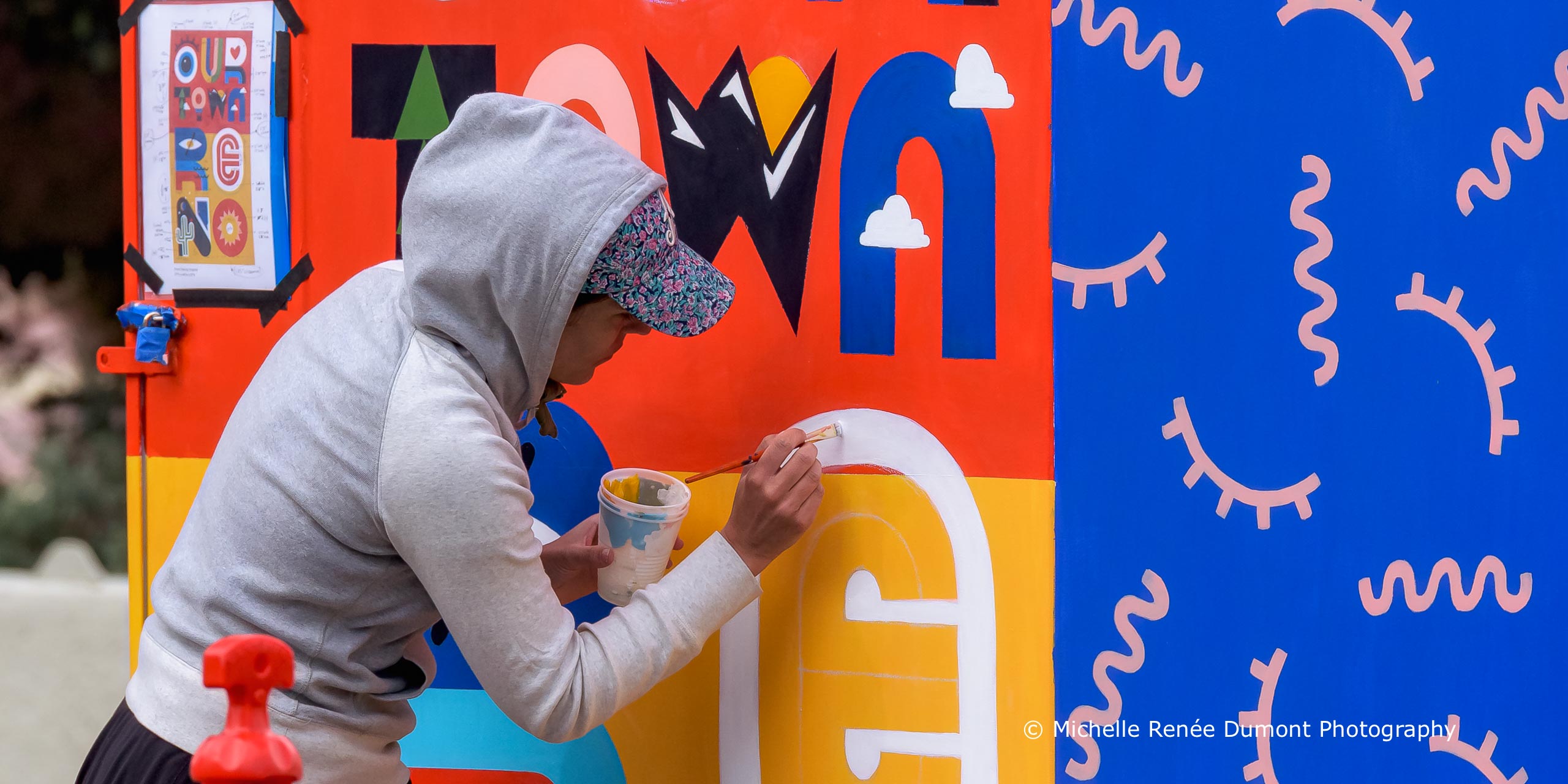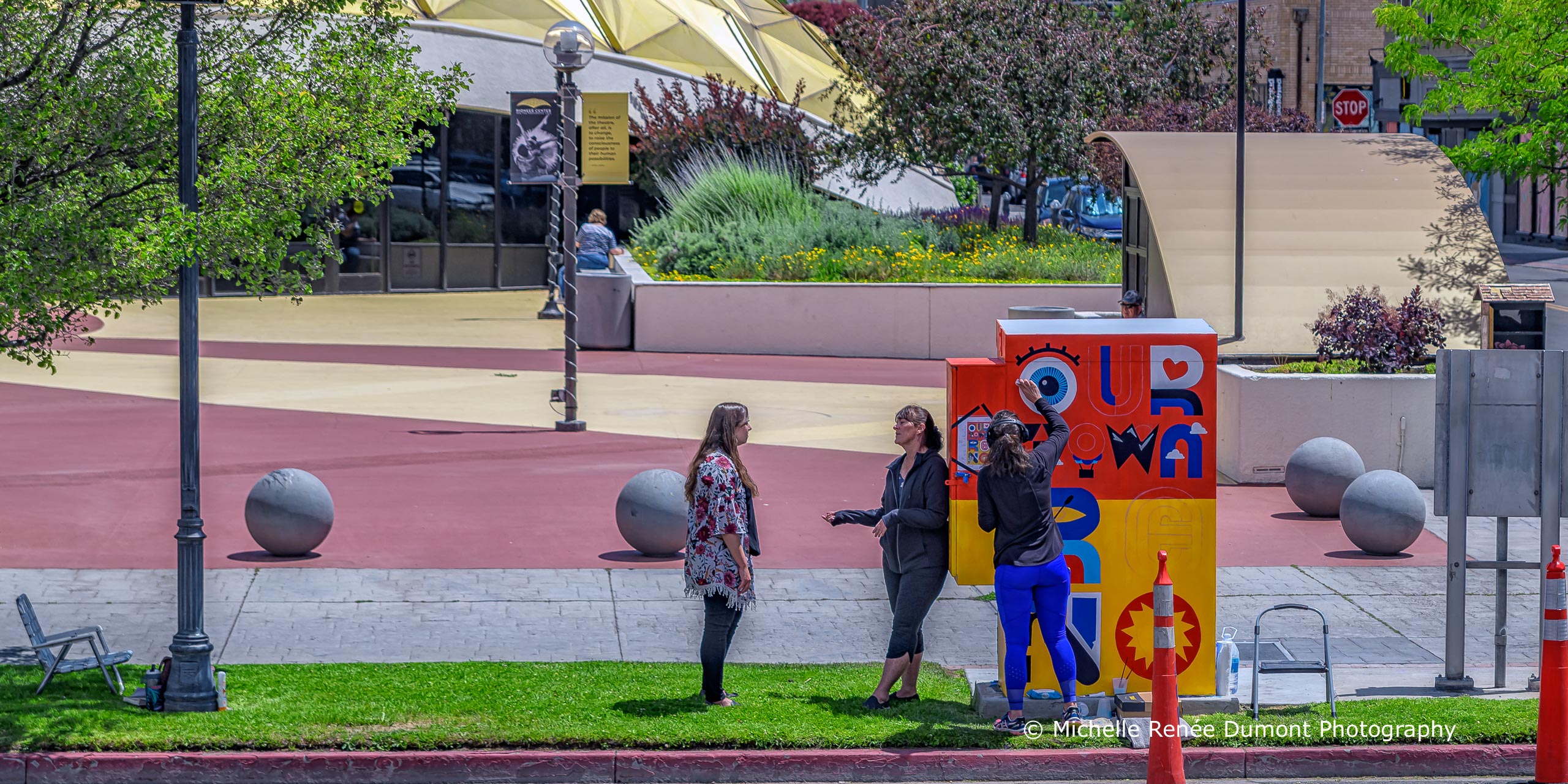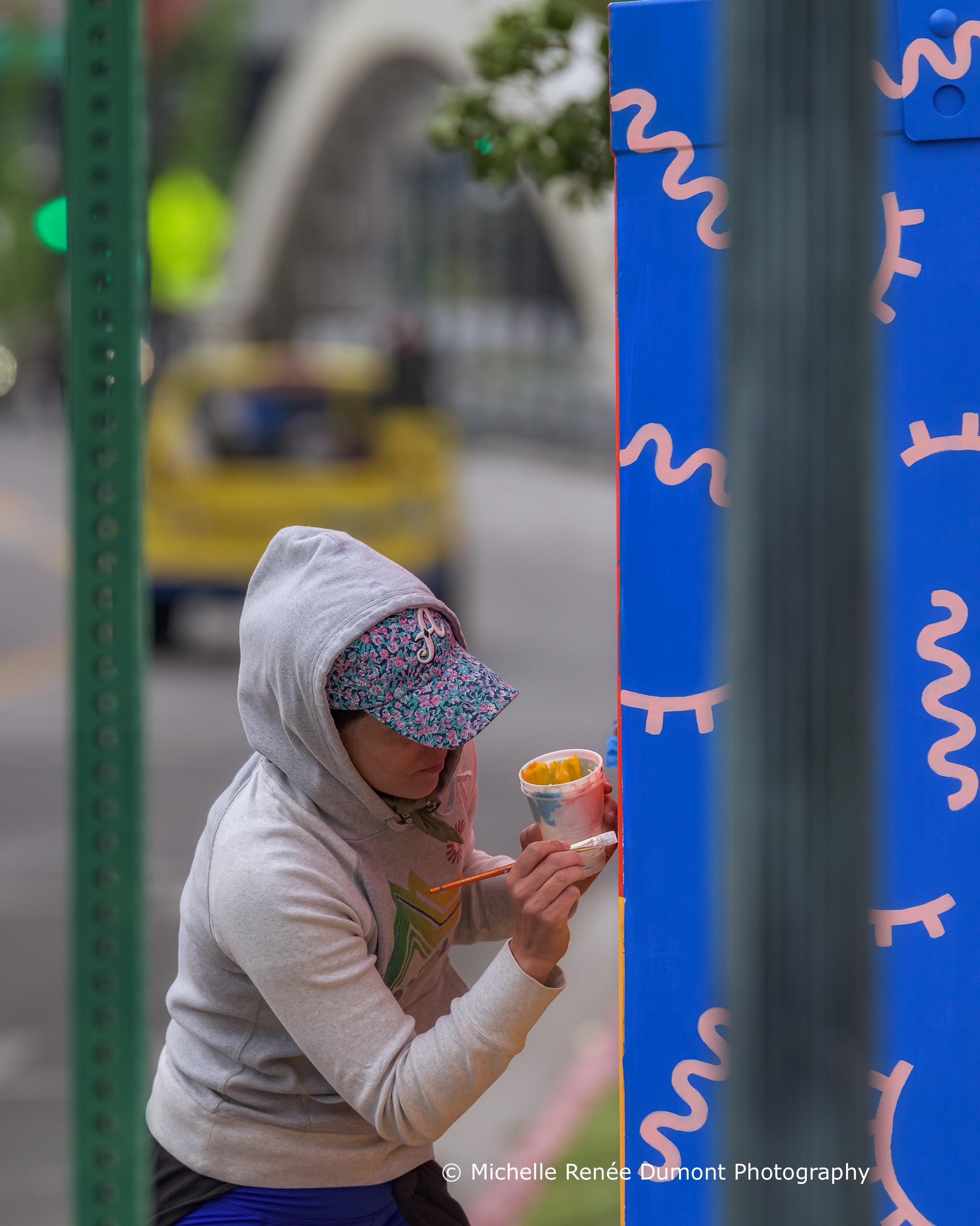 …a Designer and Illustrator by trade and an up and coming Muralist from Chicago was busy applying her artistry to the normally drab gray utility box in front of the Pioneer Center…