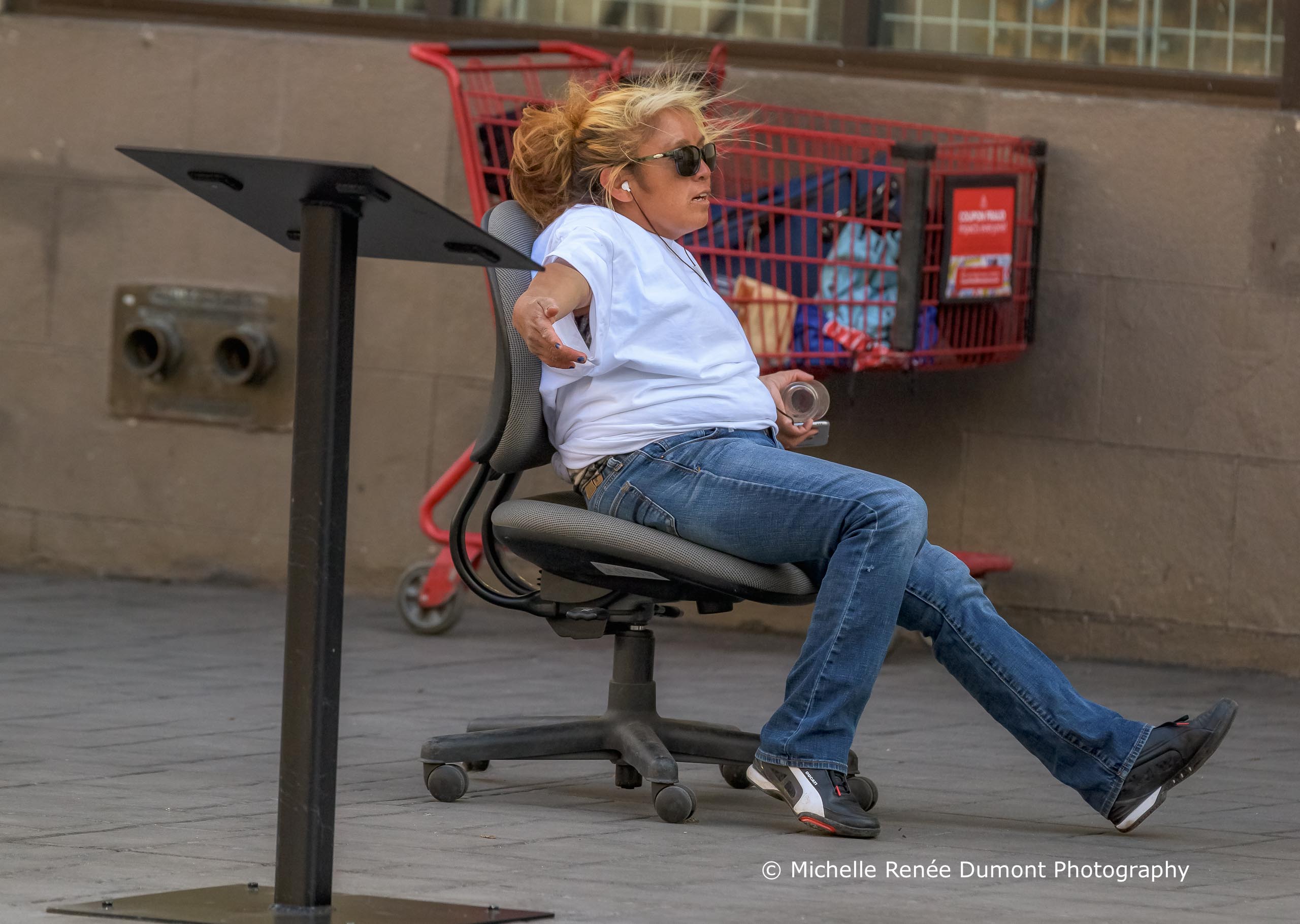 This woman was pushing herself backwards down the street while sitting in an office chair, all the while clutching an empty cocktail glass and phone in her left hand