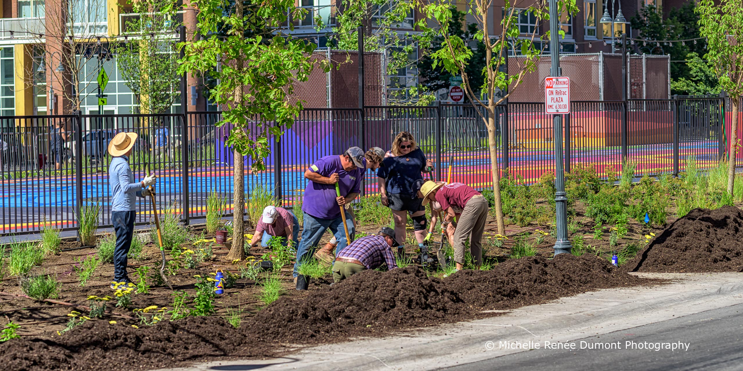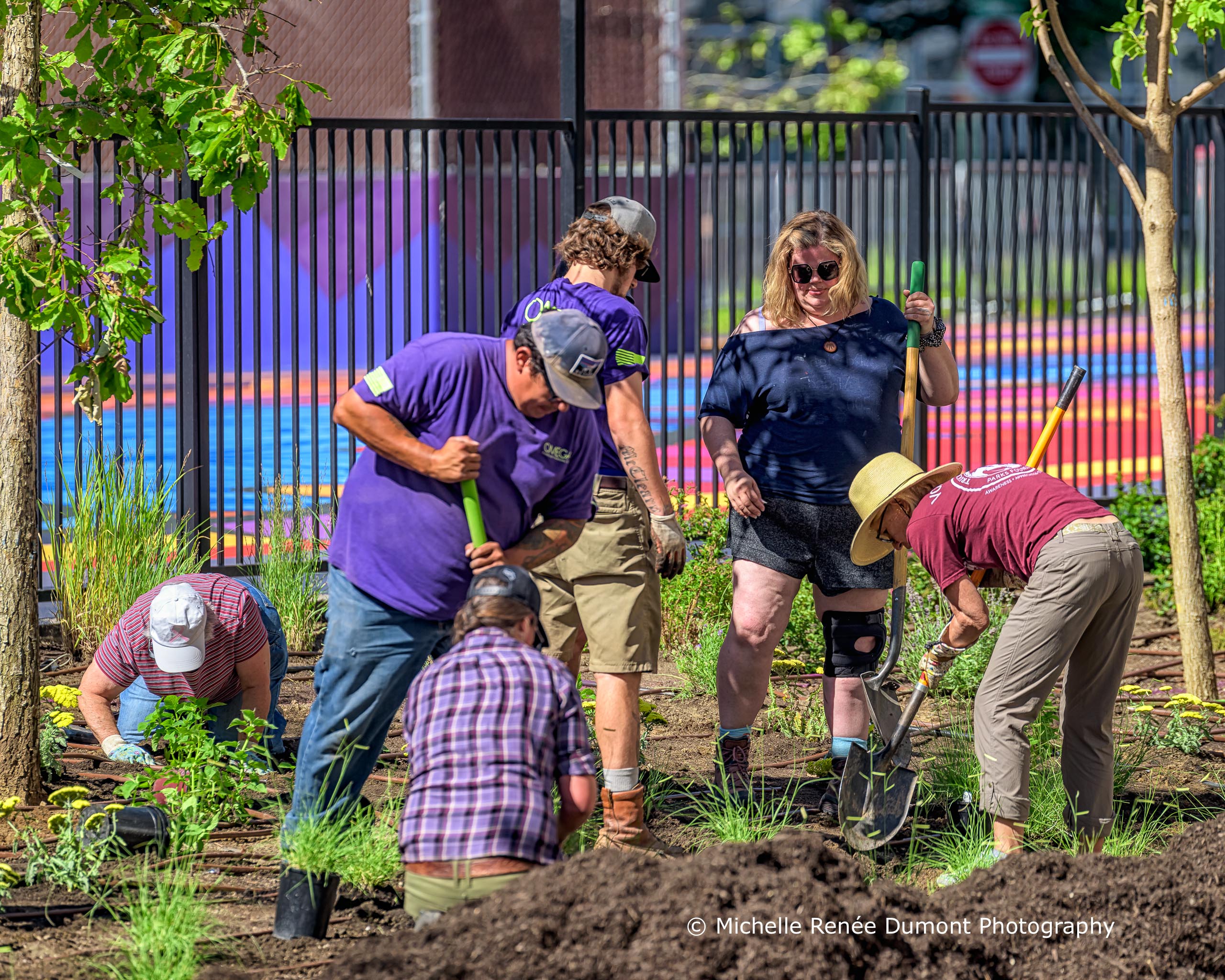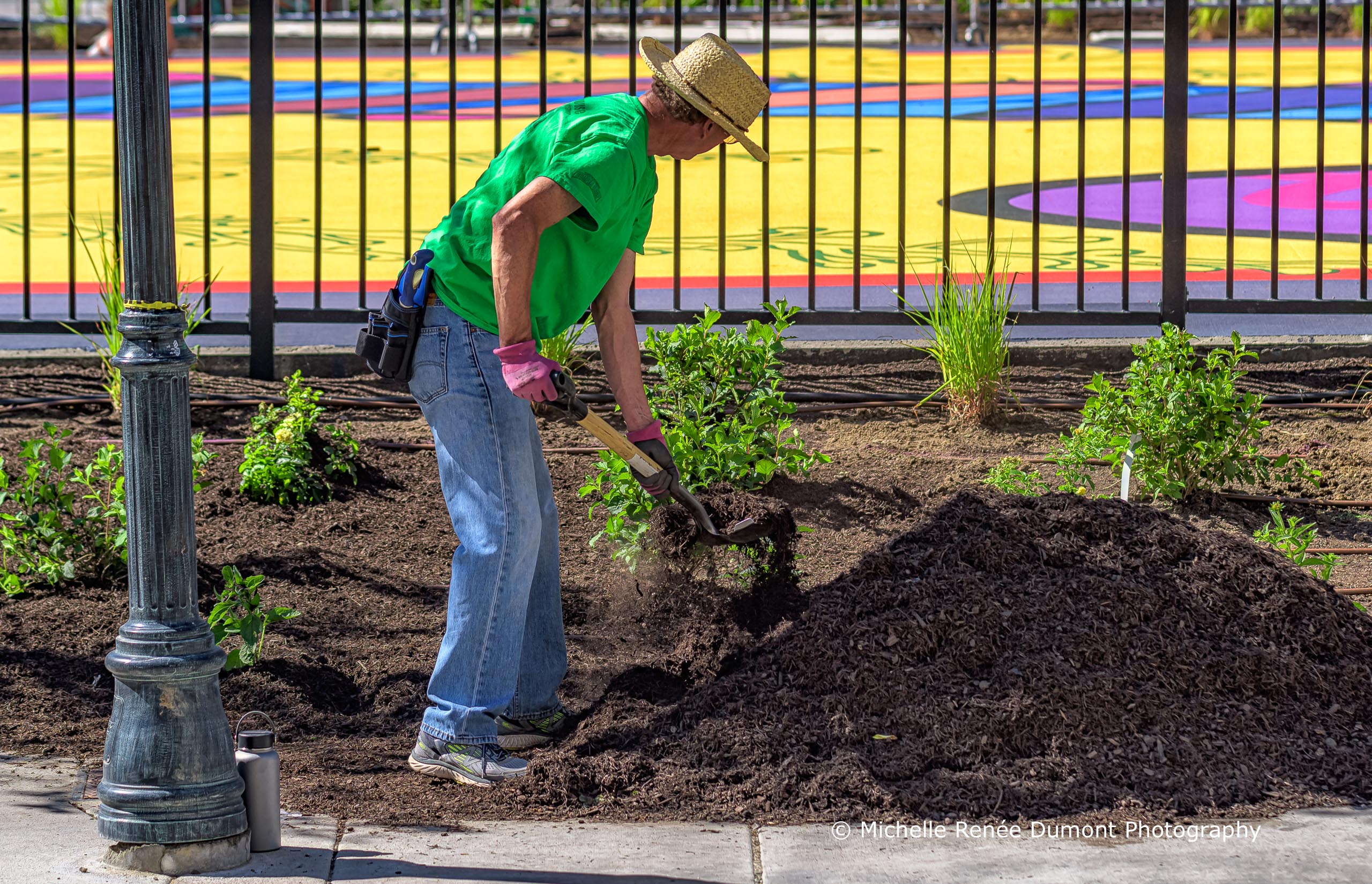 …adding the finishing touches to the landscaping installed on the grounds surrounding the once gray concrete slab of the ReTRAC plaza. The slab itself was recently painted with a giant mural that represents the Sierra Nevada Mountains and surrounding area.