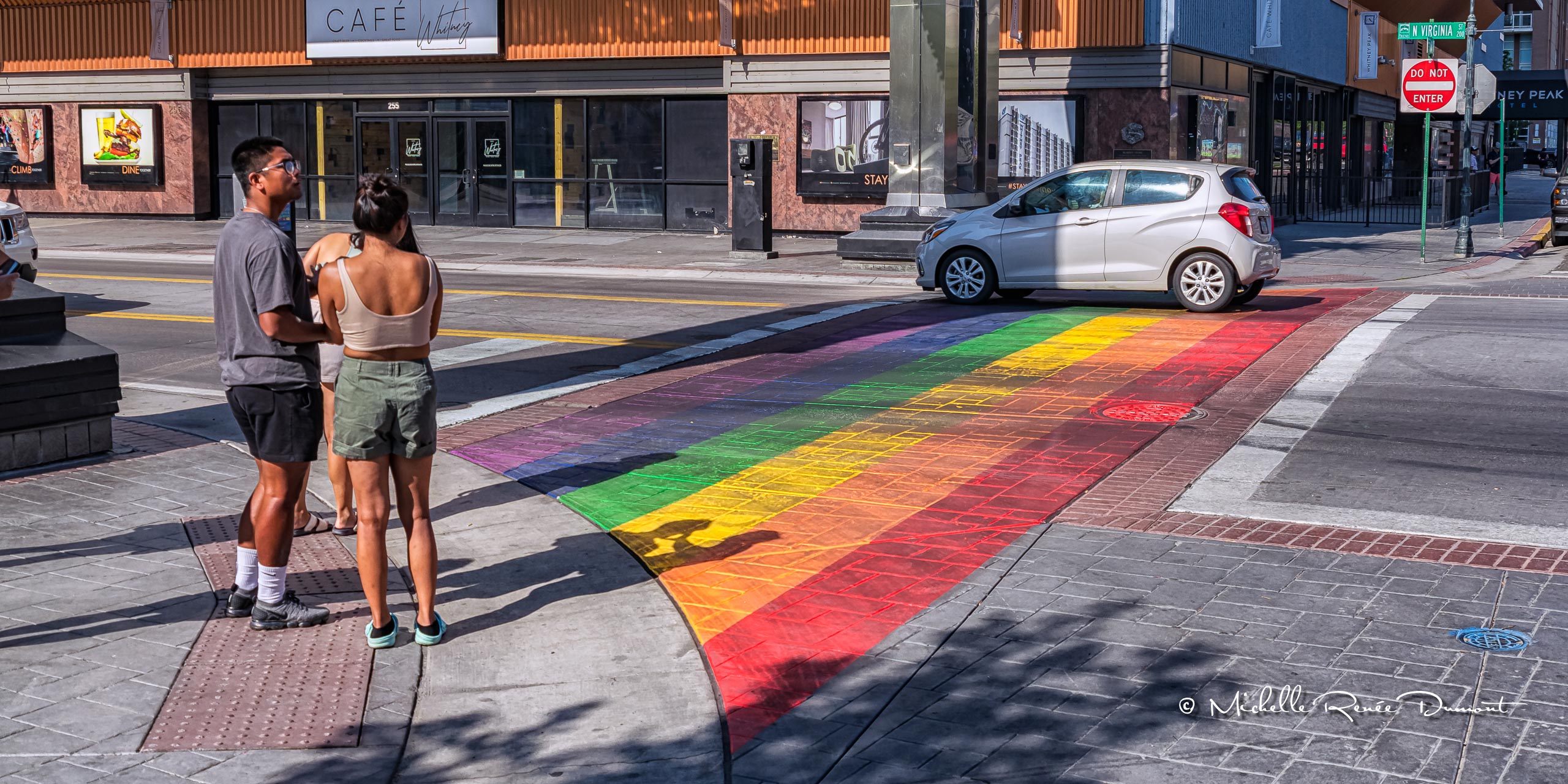 If I hadn’t gotten the images of the freshly painted crosswalk art yesterday, you would never know it was redone. Today it was once again showing wear and tear from the traffic. Whether malicious damage or just regular traffic wear. But there was one young lady who was excited to be a part of the Pride rainbow mural…