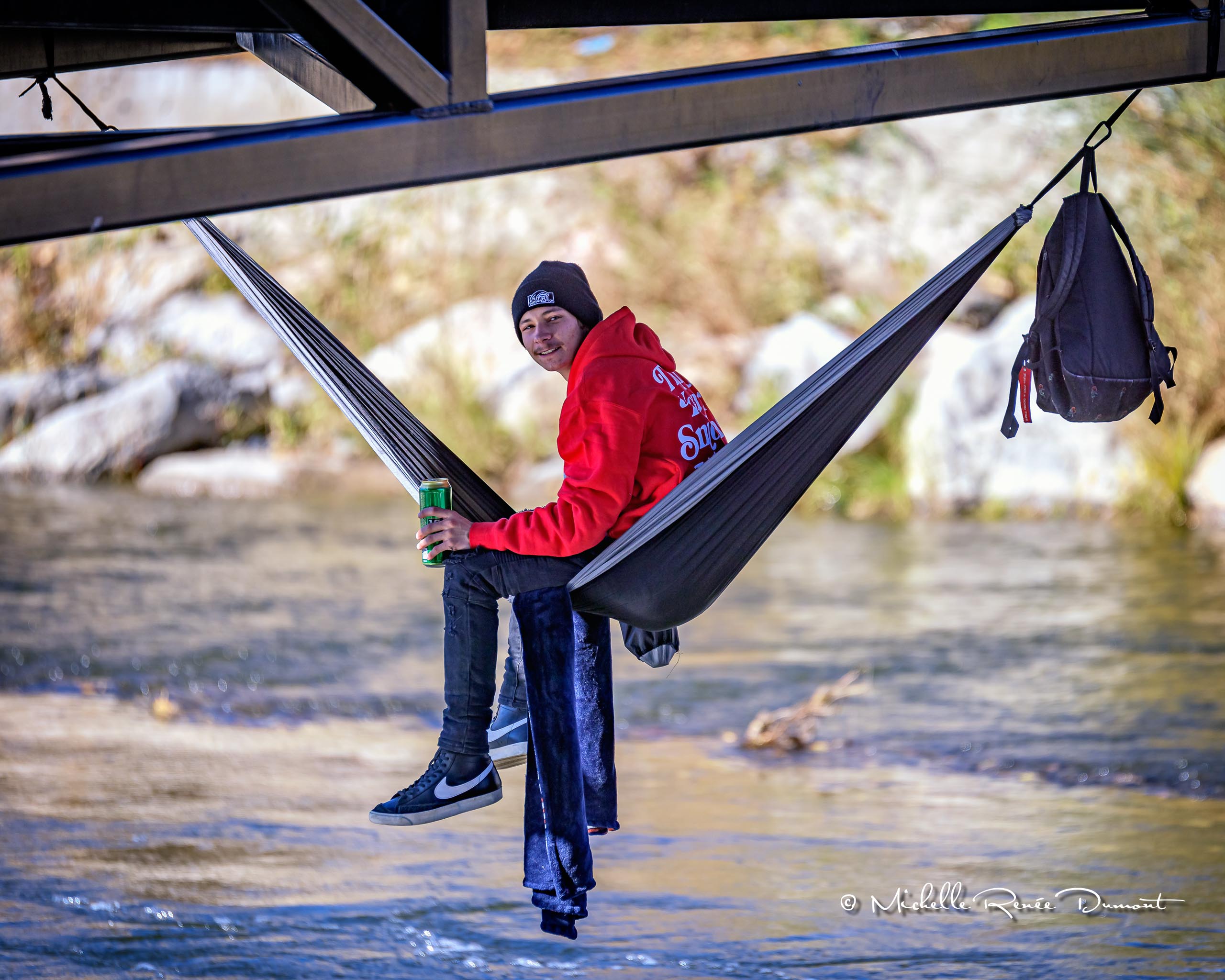 … he hung his hammock beneath the pedestrian bridge and dangled just feet above the frigid waters of the Truckee River. I think he was successful in his endeavor to be different.