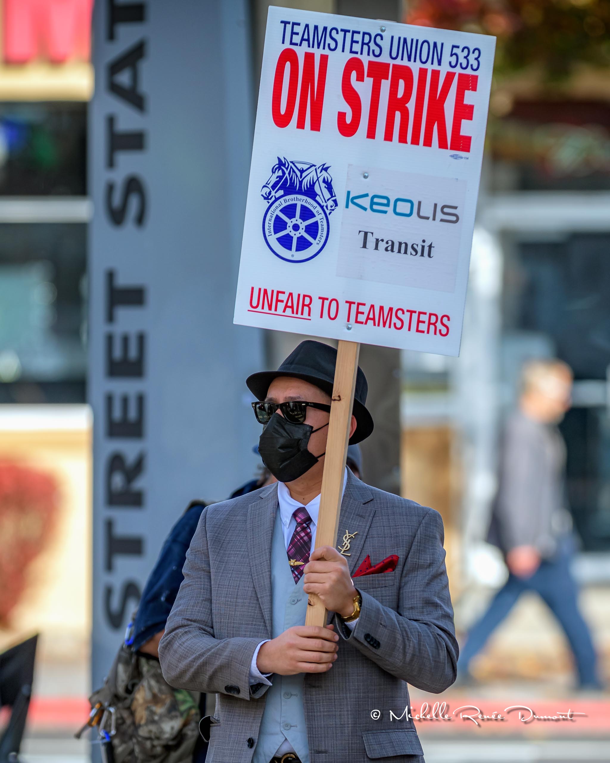 This must be the most best dressed picket line walker ever. Looking more like Daddy Warbucks in a three piece suit, tie and silk handkerchief, topped off with a Fedora and a gold YSL lapel pin, he proudly carried a strike placard with the rest to show his support for the Union.