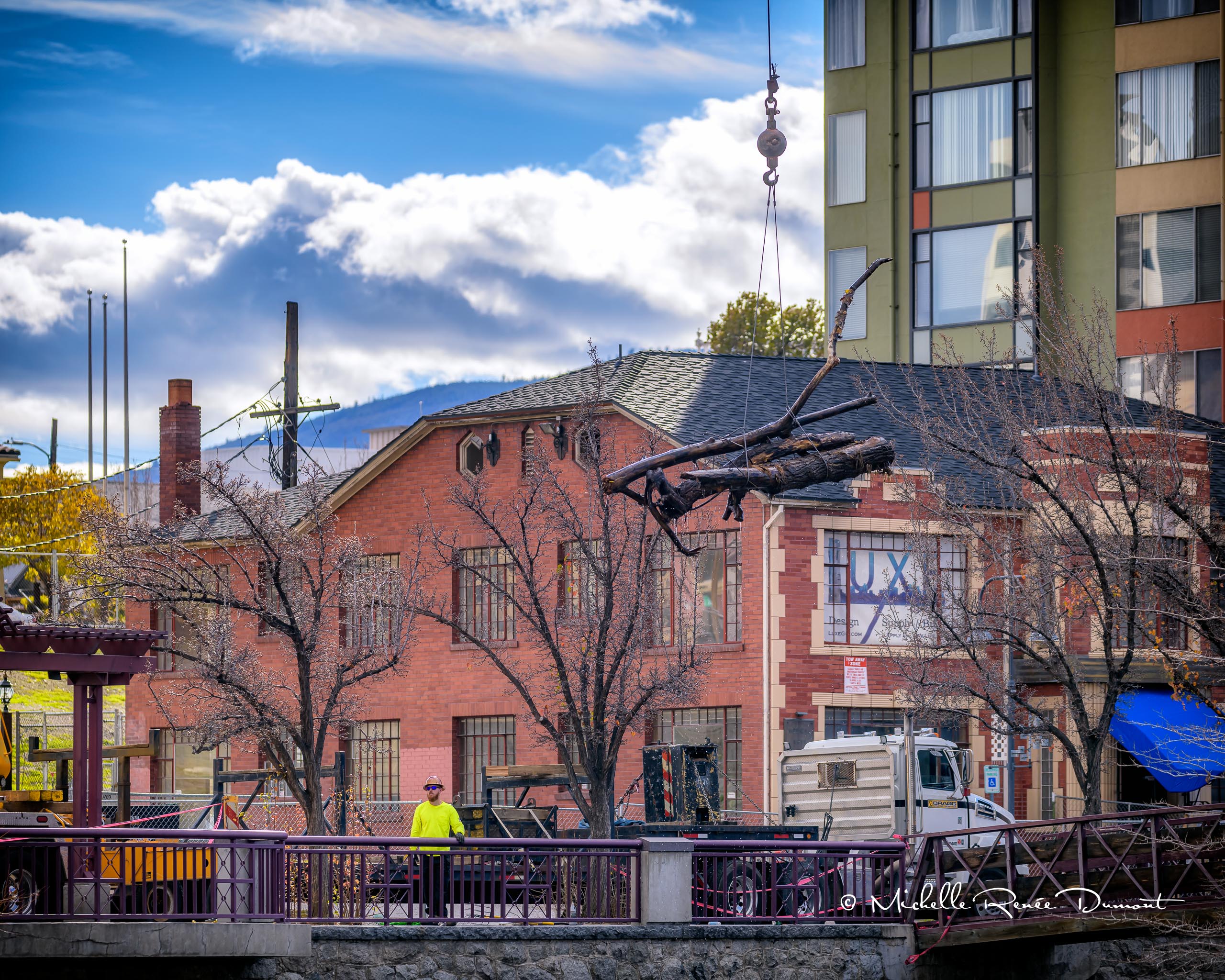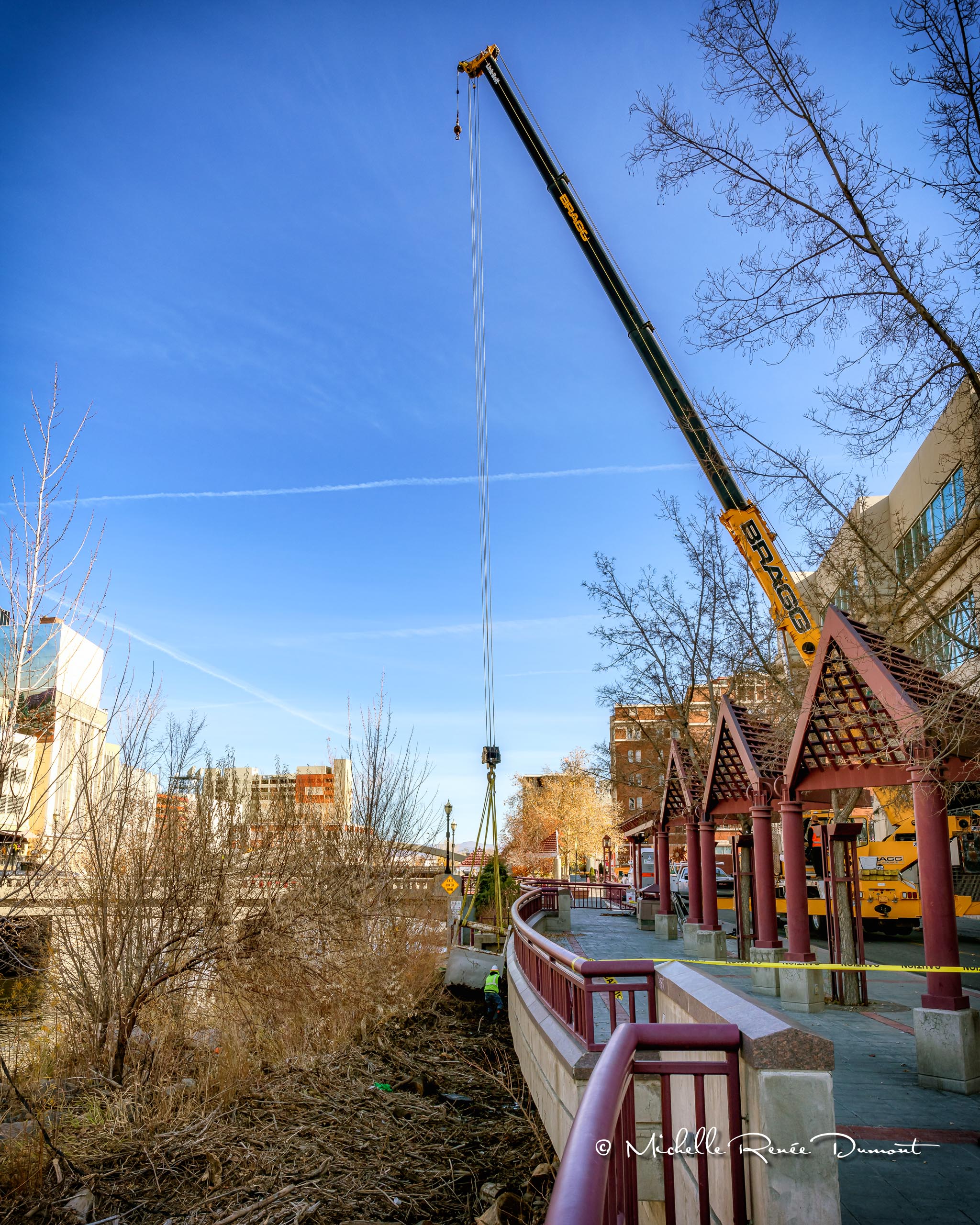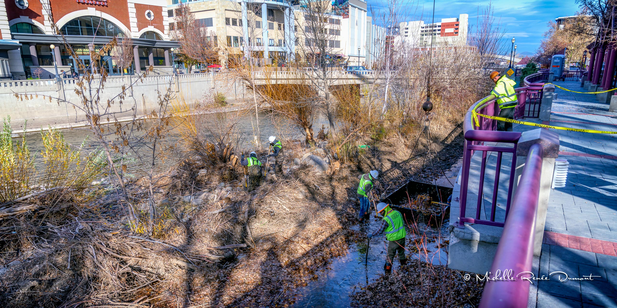 UPDATE: Just wanted to show their progress. They started yesterday morning, and by this afternoon they should have most, if not all the debris picked up and trucked out. The cold waters of the Truckee River are once again flowing through this narrow offshoot.