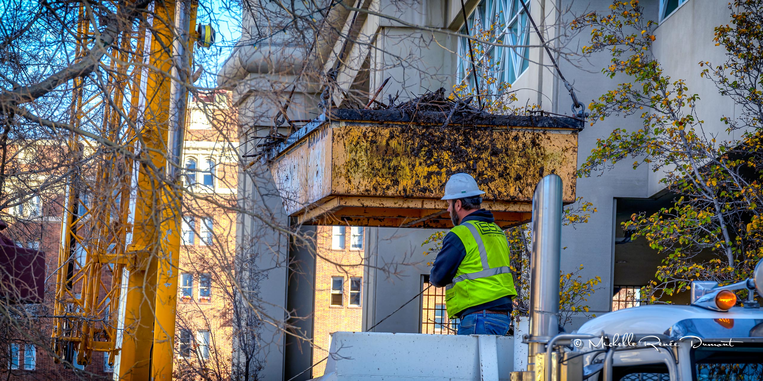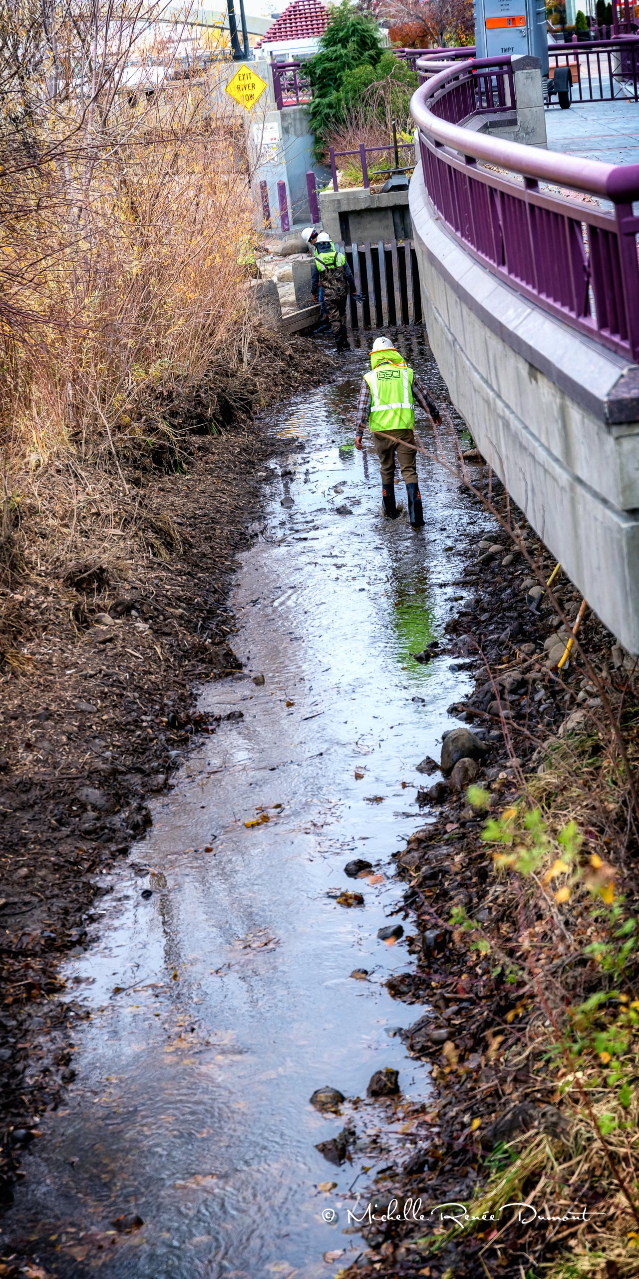 Workmen were busy removing debris that washed down river and accumulated in this narrow offshoot after our recent mountain rains. Due to the location, heavy equipment could not be used to remove the drift wood and muck. Only pitchforks and lots of muscle, one bucket load at a time