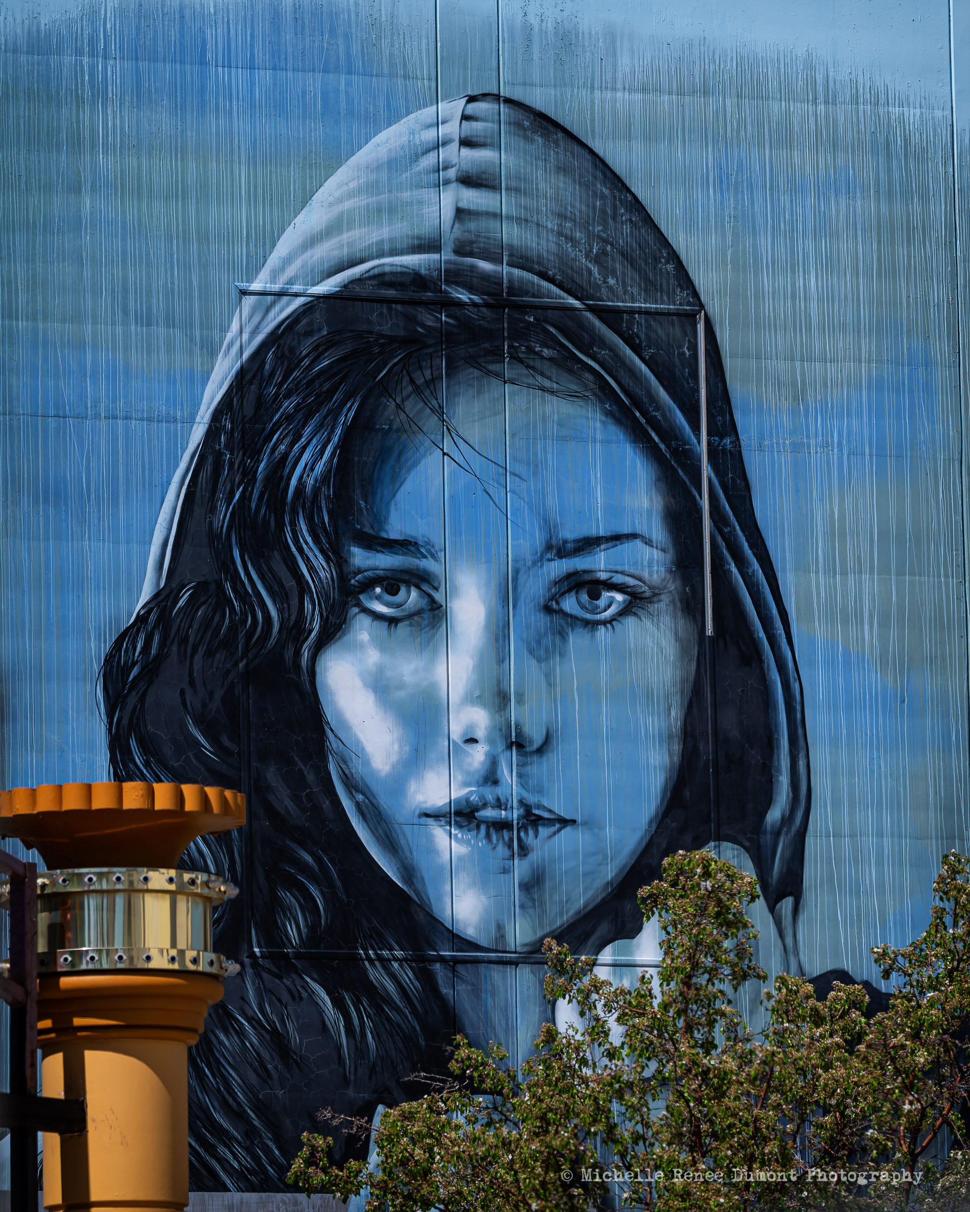 This four story high mural of a female with those mesmerizing eyes is my favorite mural. She deserves a separate post