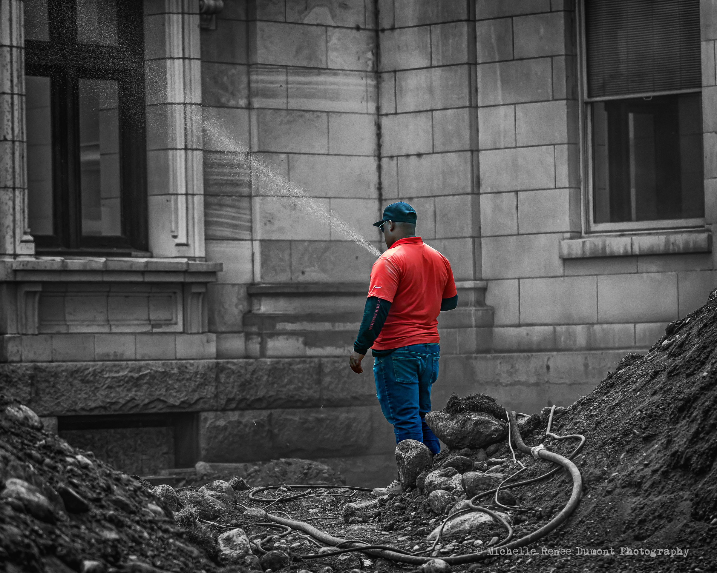 Construction, or destruction crews have been busy digging up a side yard of our County Courthouse. I’m guessing they are cutting into the stone foundation, which was the cause of the fine dust particles. Here a workman is helping to keep the dust at bay with a garden hose