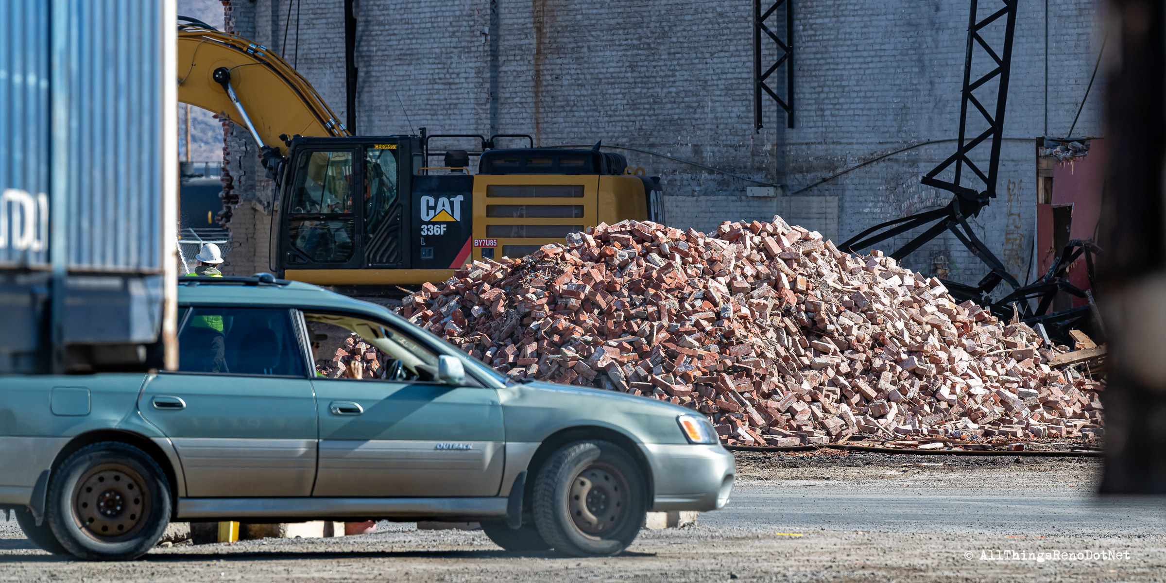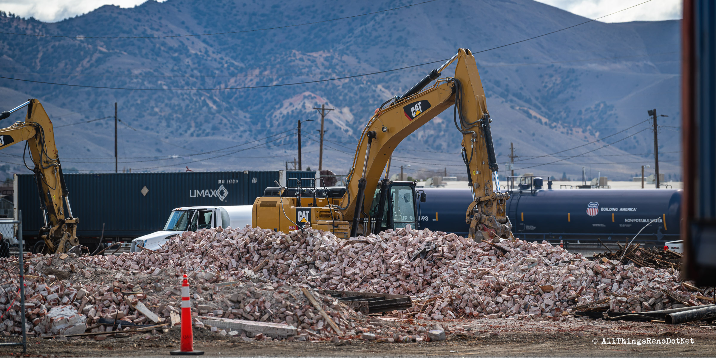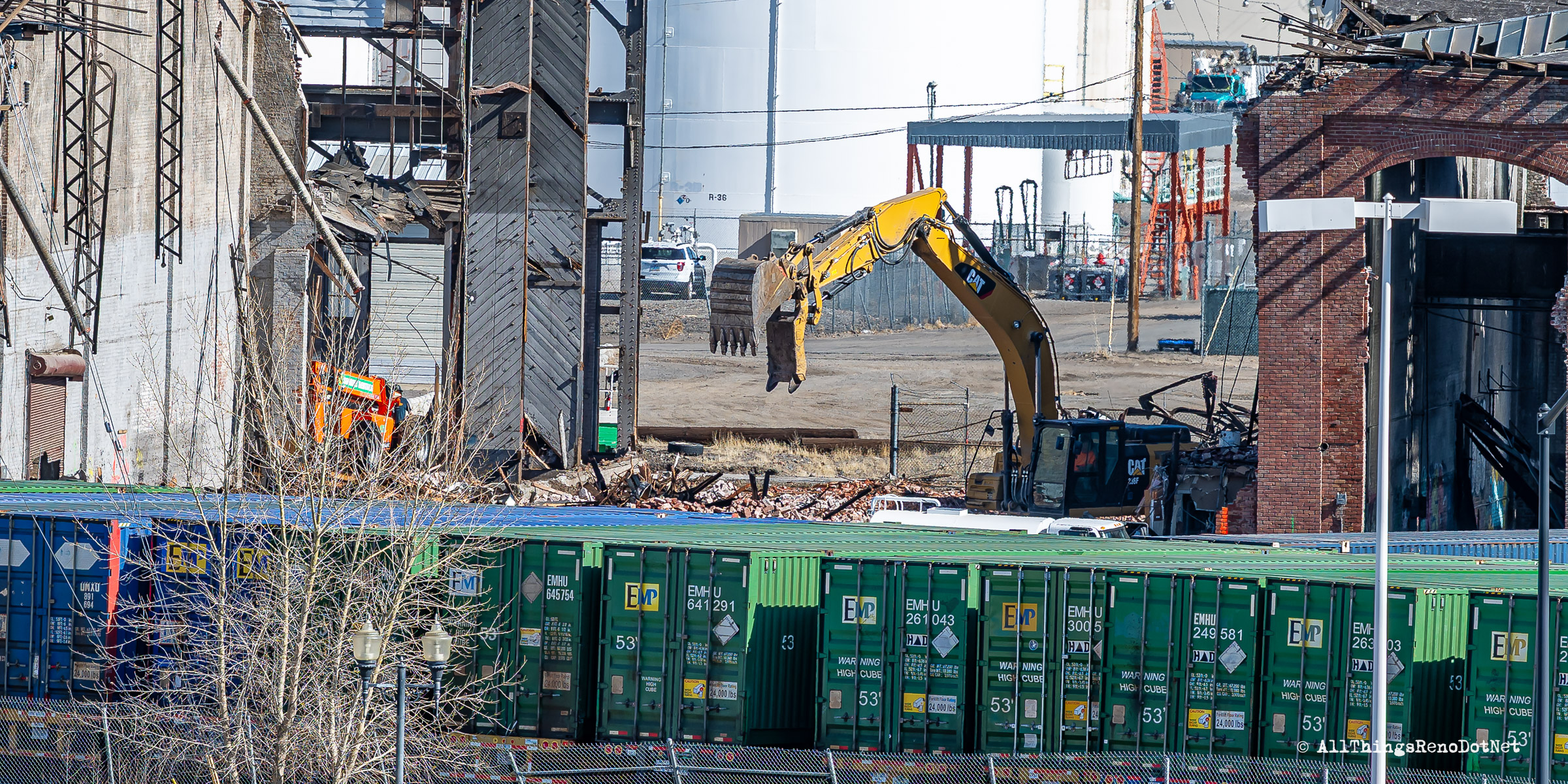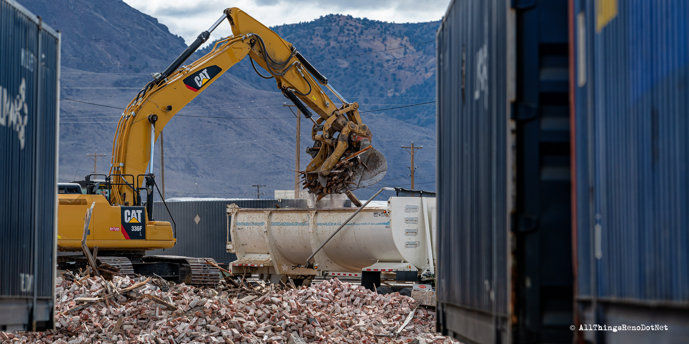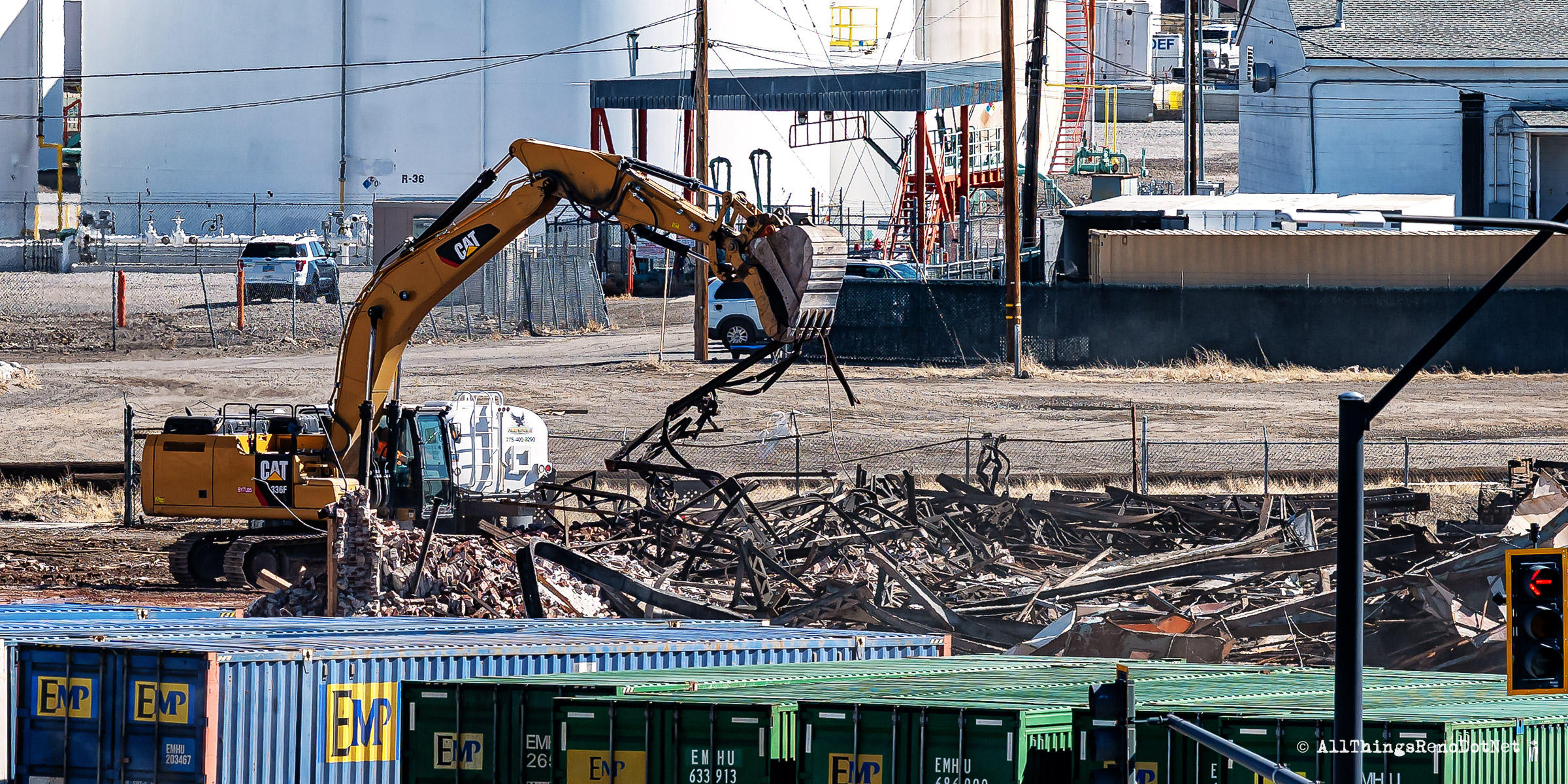 The Union Pacific Railroad Machine Shop, built 120 years ago, was being razed to make way for their expansion of Intermodal Container handling. In other words, a parking lot for container trailers. The building hadn’t been used as a machine shop in years, instead as storage for RV’s, etc. The demolition was seemingly being done in three phases. Cleaning up the resulting debris from each before moving on to the next.
