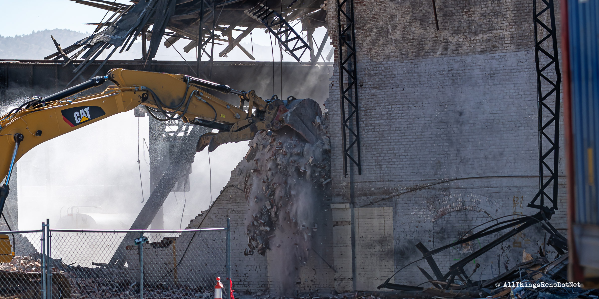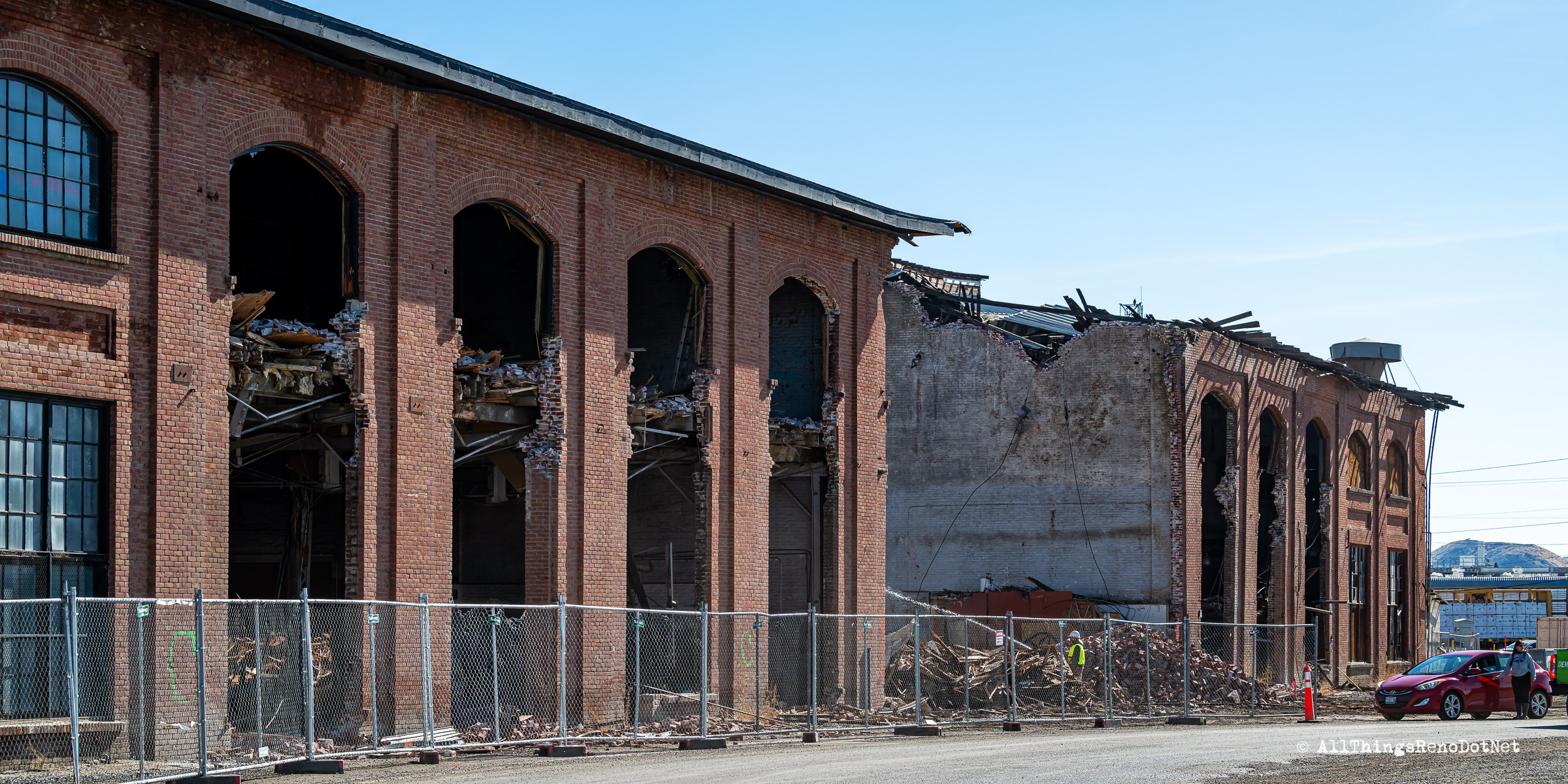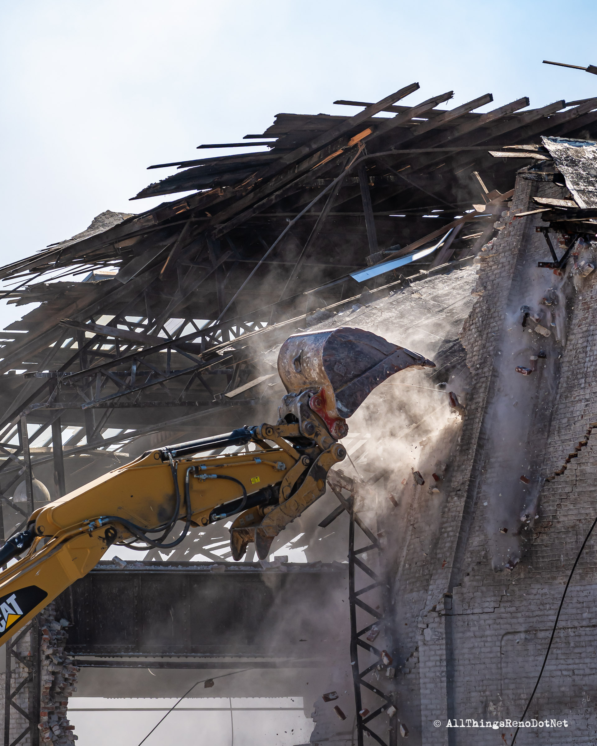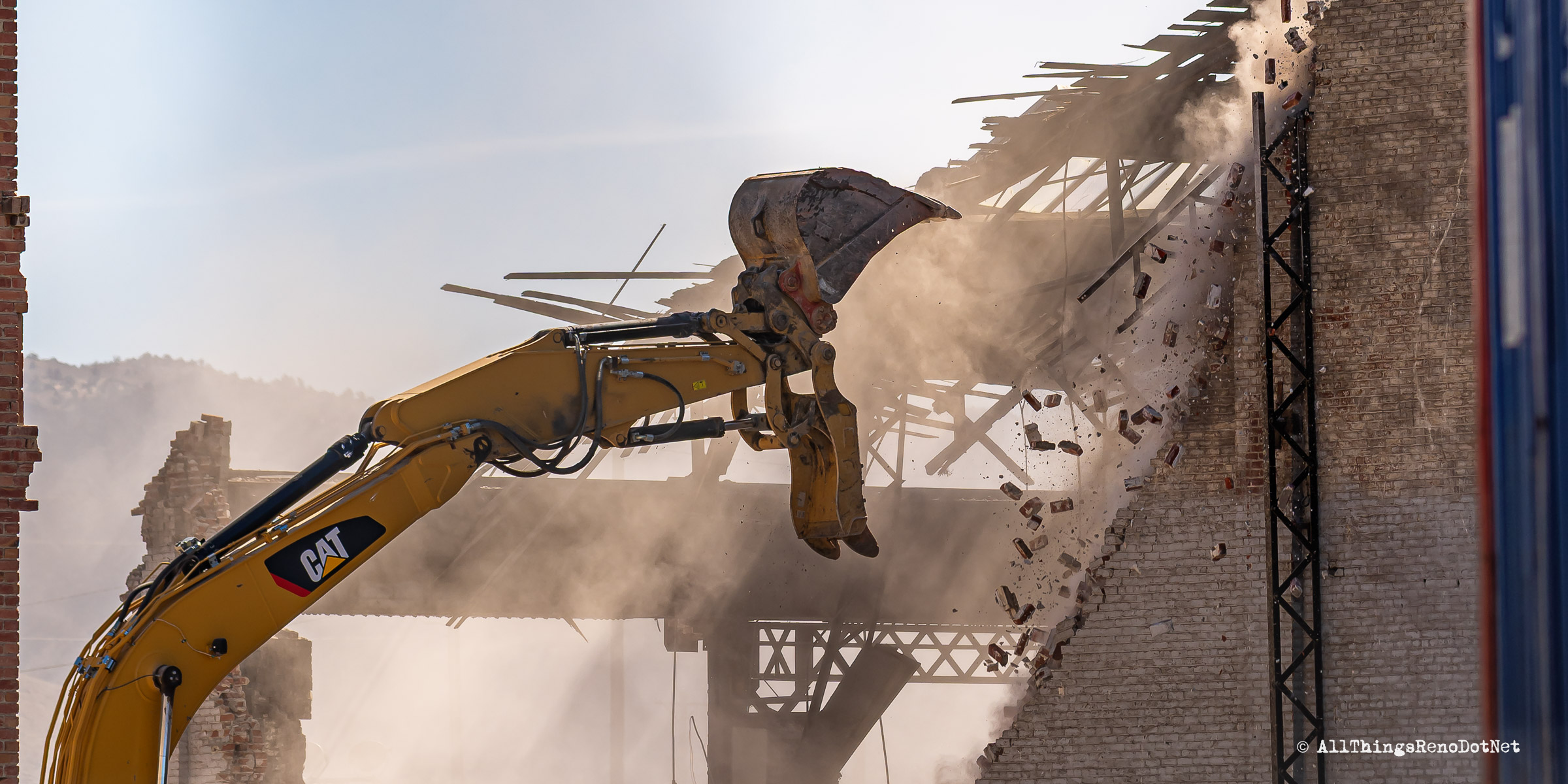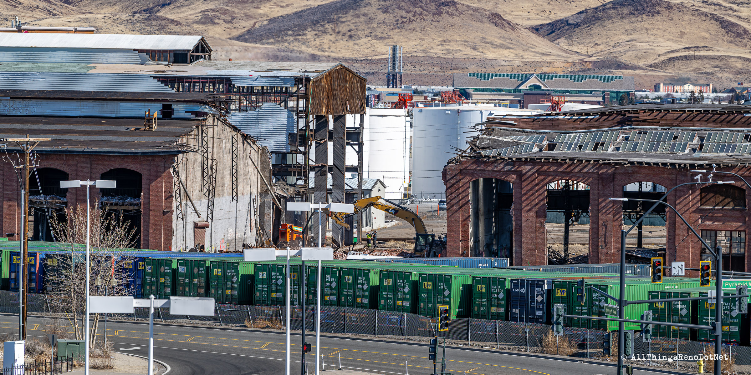 The Union Pacific Railroad Machine Shop, built 120 years ago, was being razed to make way for their expansion of Intermodal Container handling. In other words, a parking lot for container trailers. The building hadn’t been used as a machine shop in years, instead as storage for RV’s, etc. The demolition was seemingly being done in three phases. Cleaning up the resulting debris from each before moving on to the next.