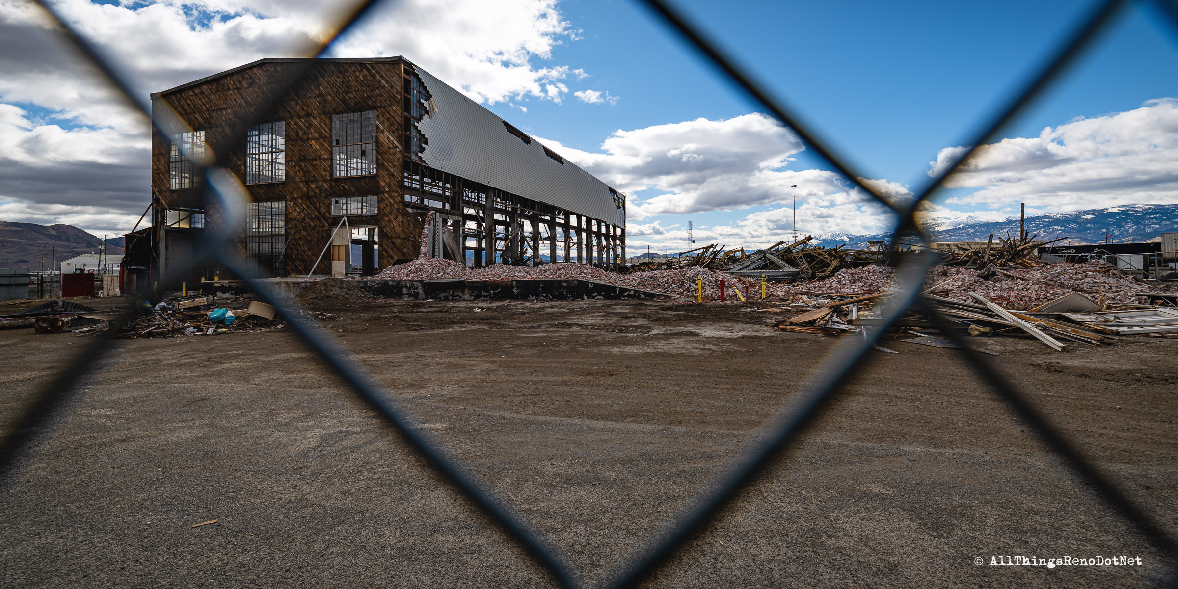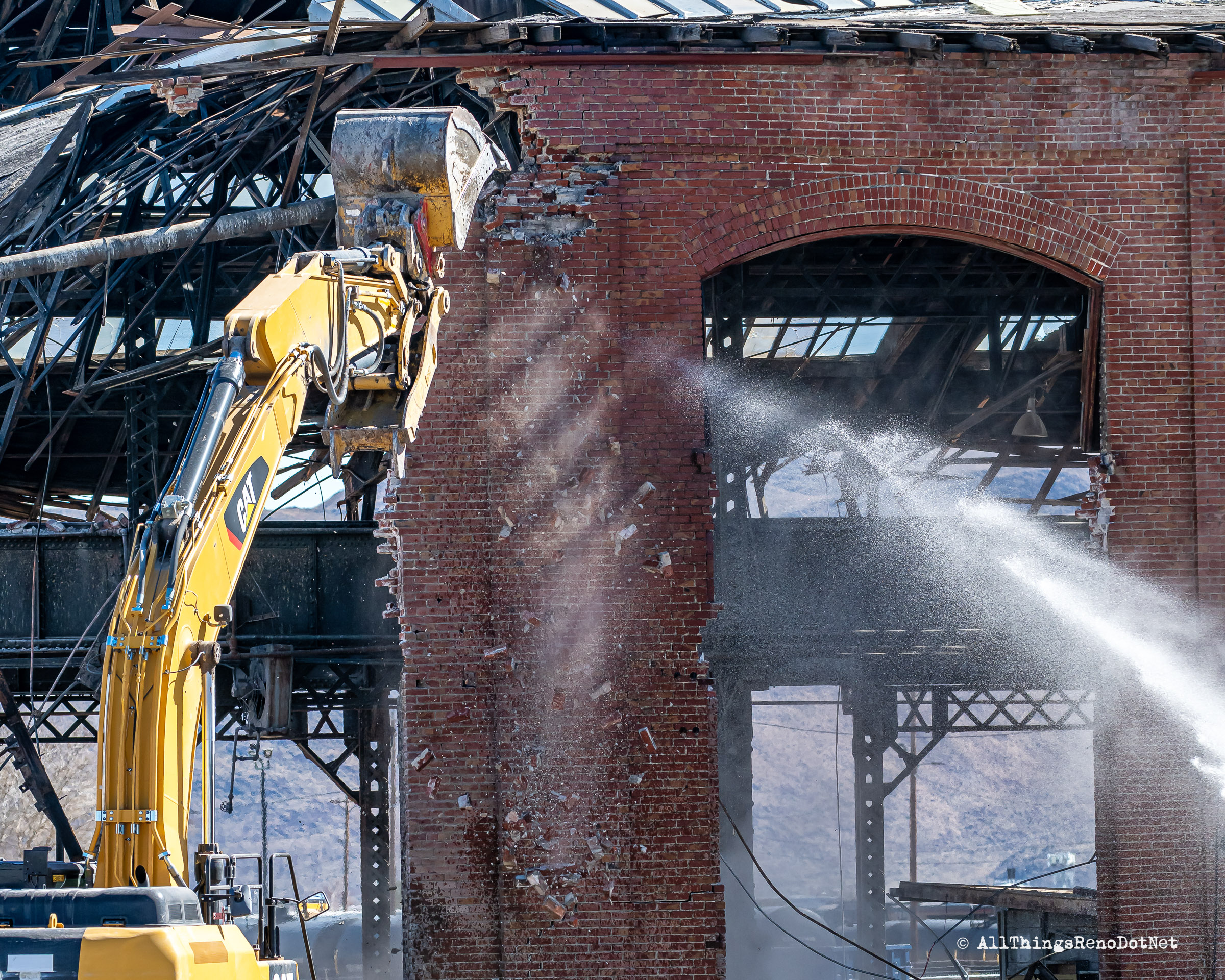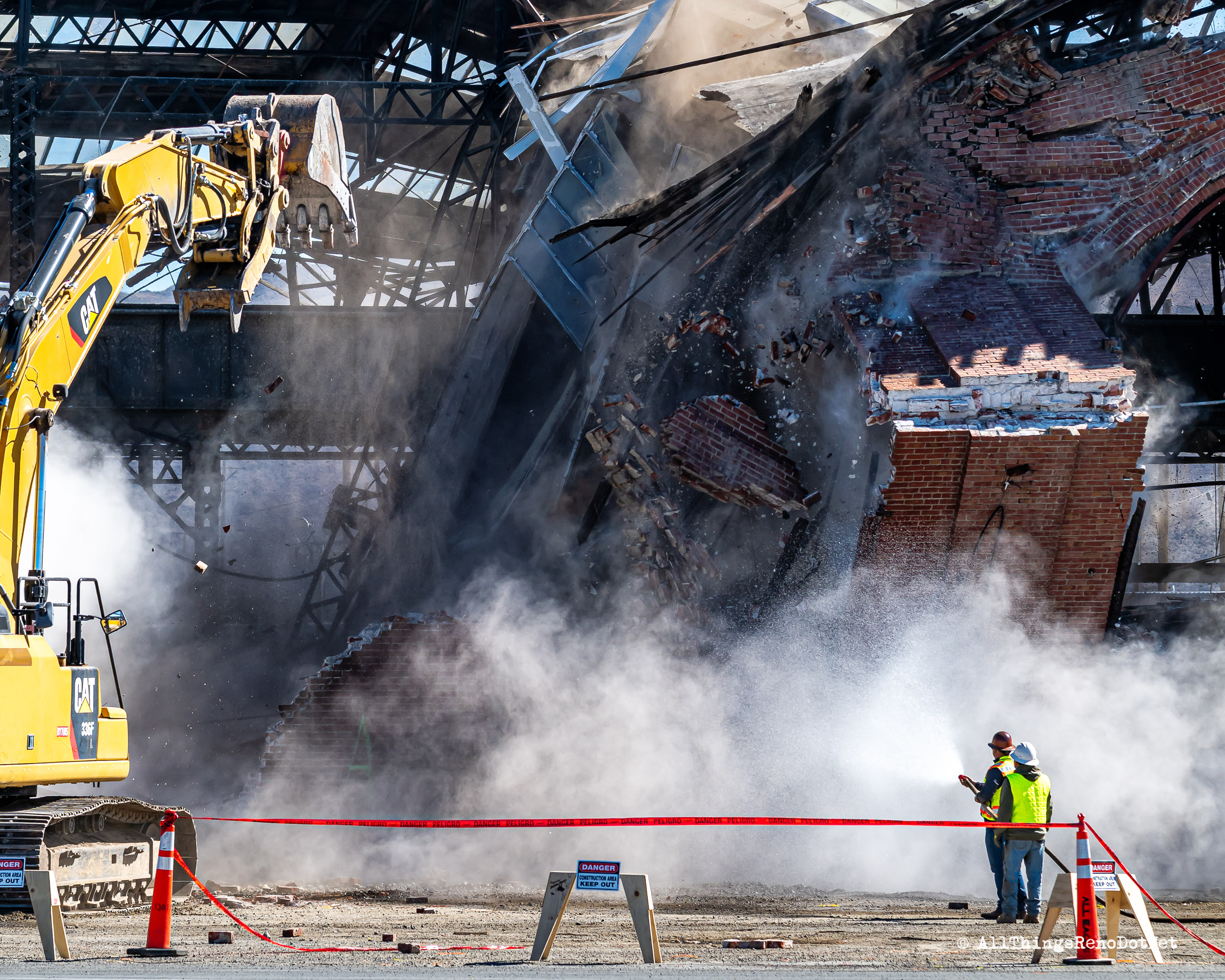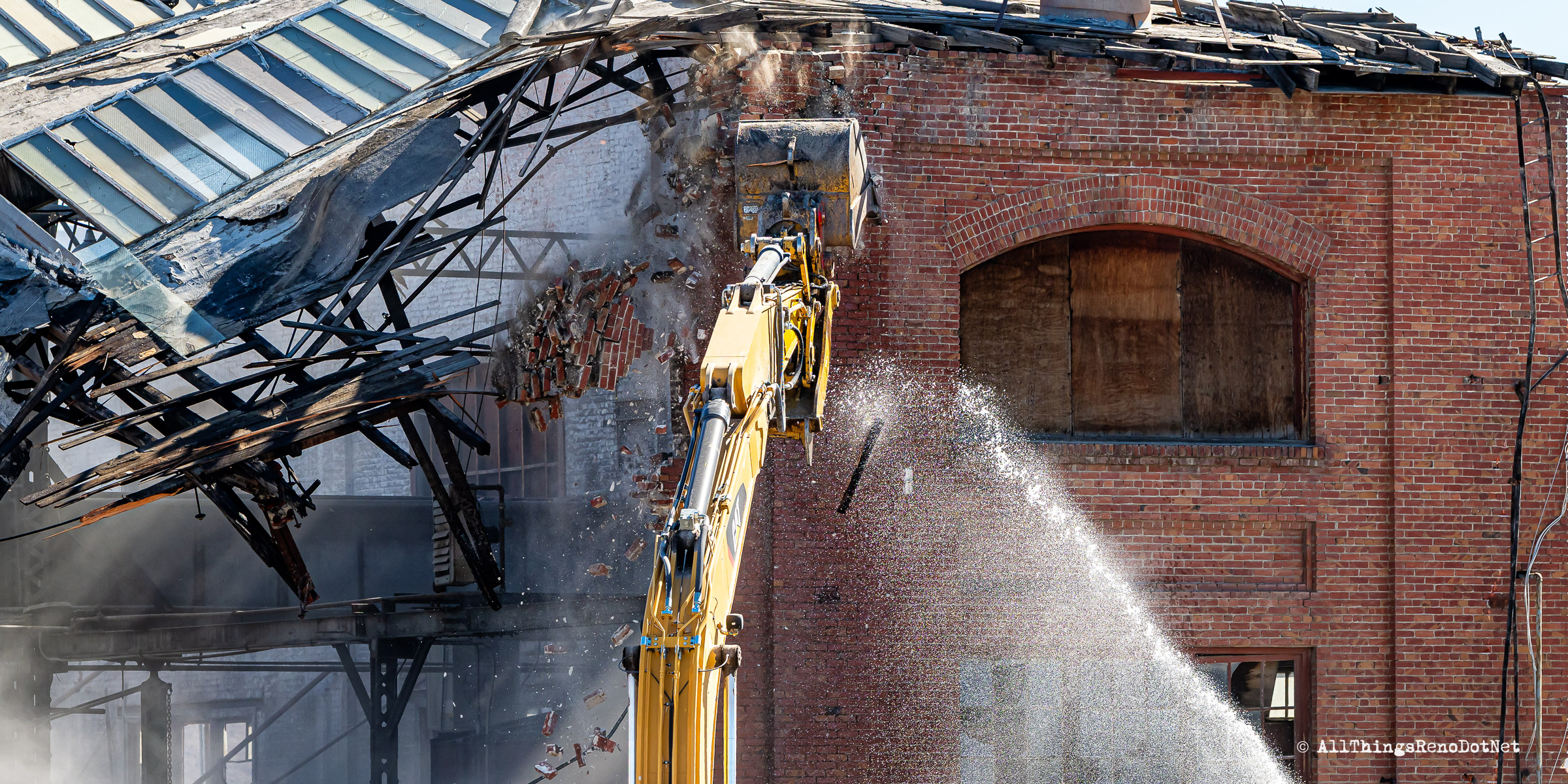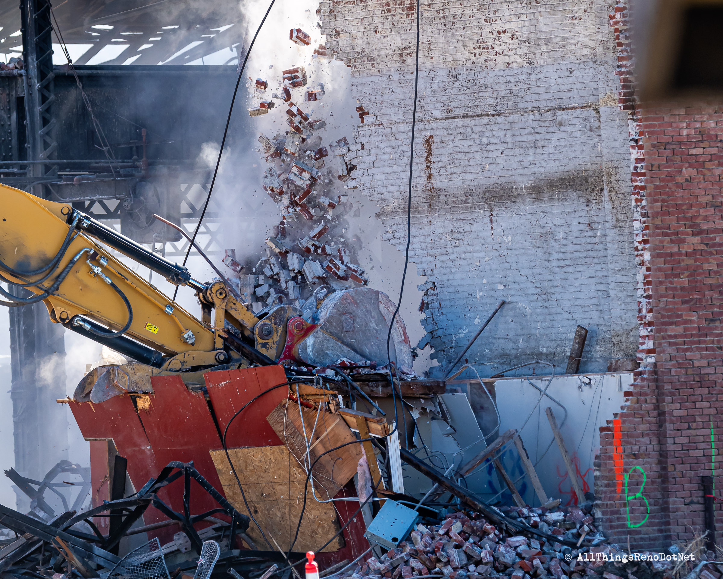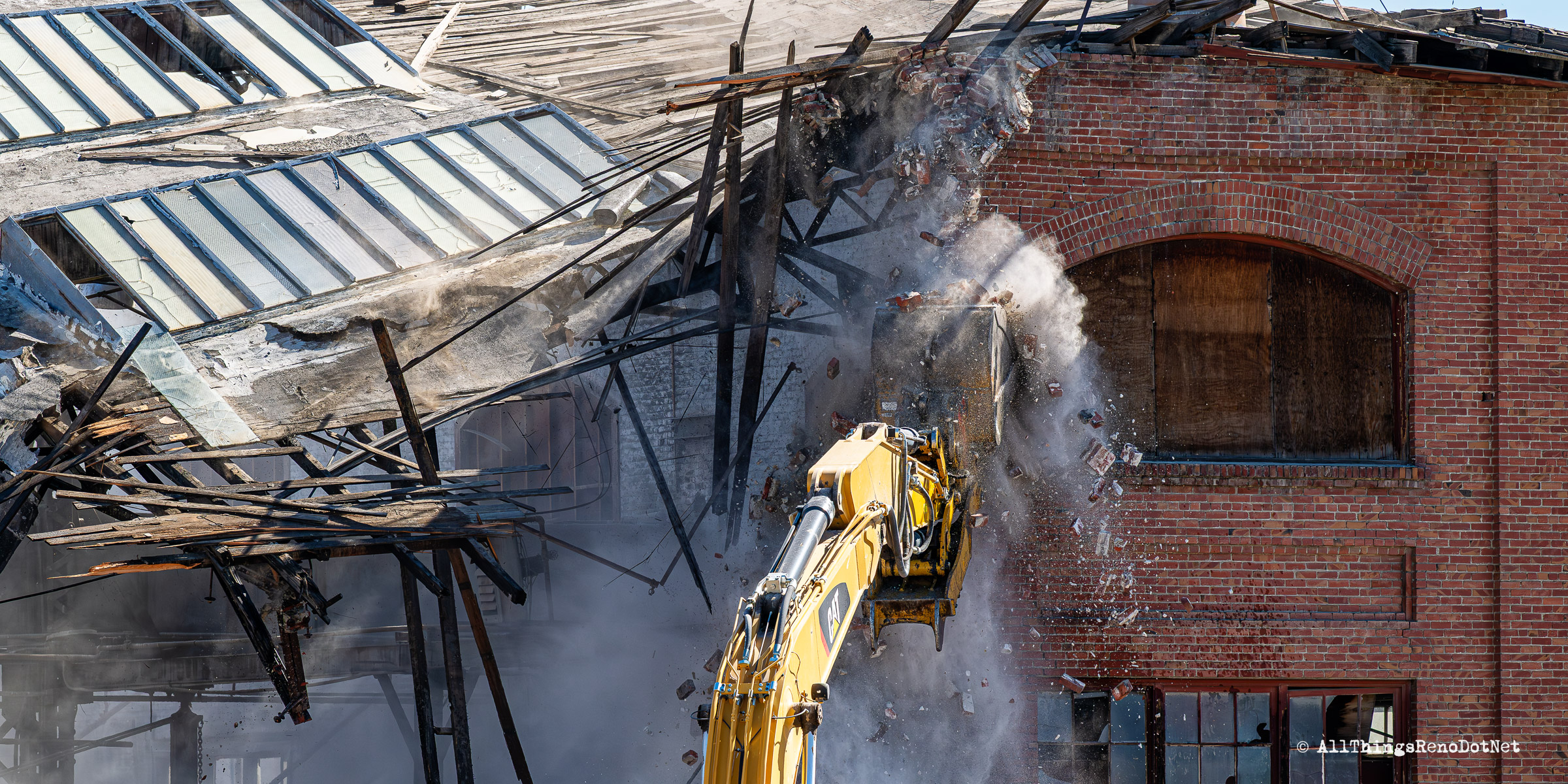 The Union Pacific Railroad Machine Shop, built 120 years ago, was being razed to make way for their expansion of Intermodal Container handling. In other words, a parking lot for container trailers. The building hadn’t been used as a machine shop in years, instead as storage for RV’s, etc. The demolition was seemingly being done in three phases. Cleaning up the resulting debris from each before moving on to the next.