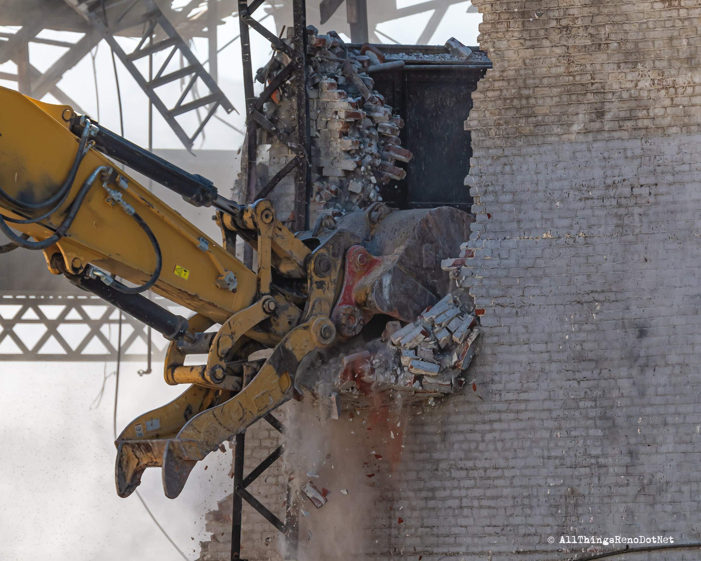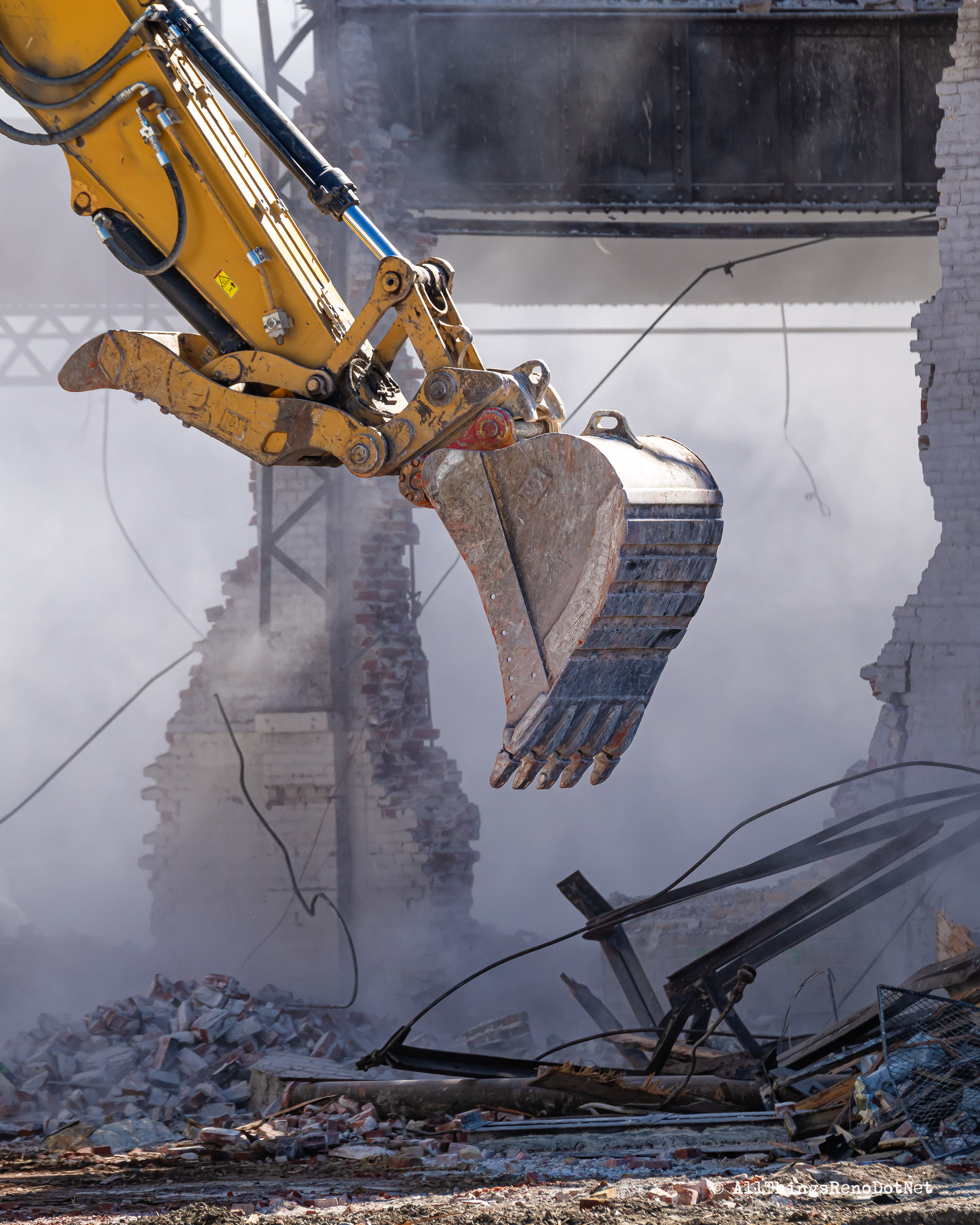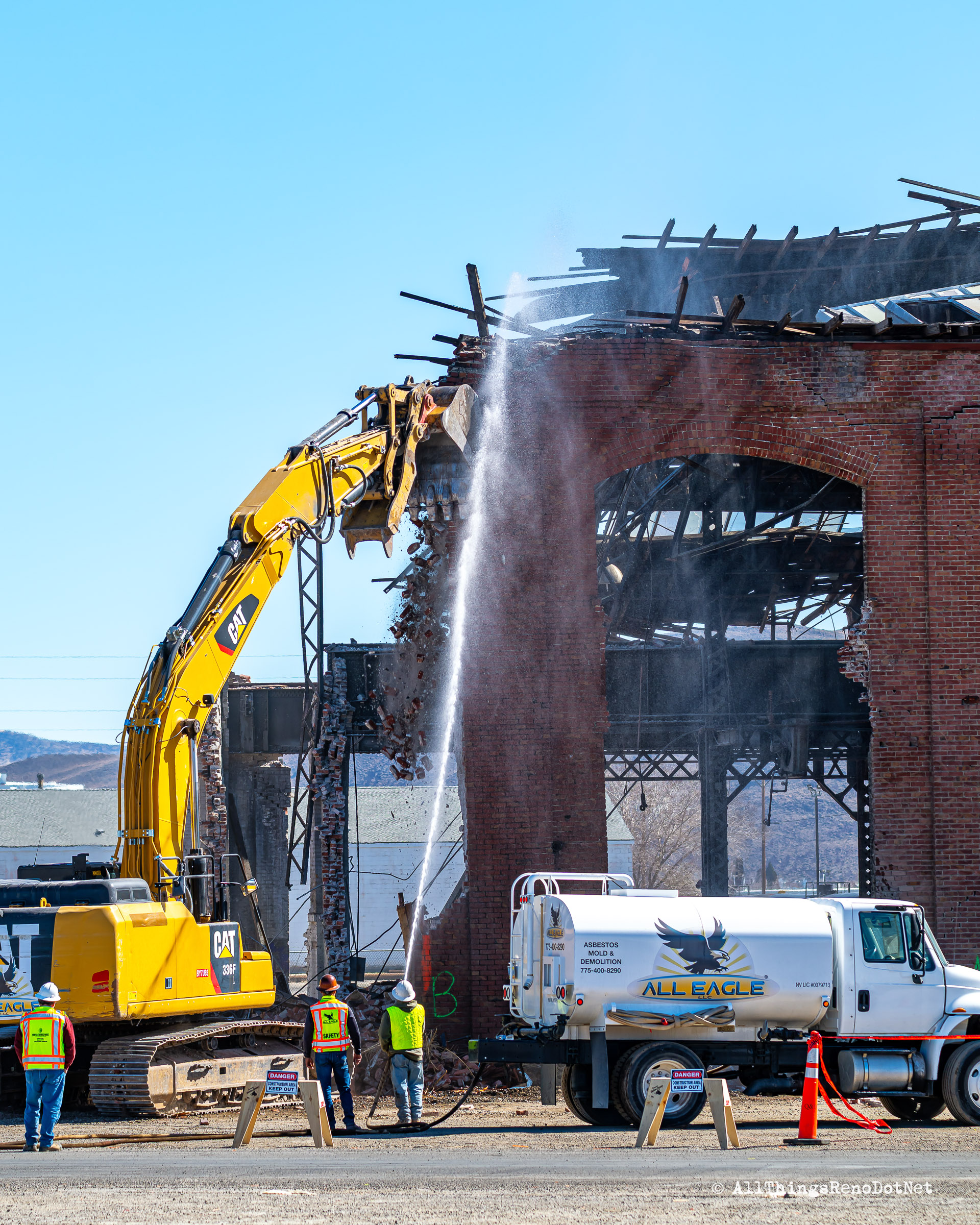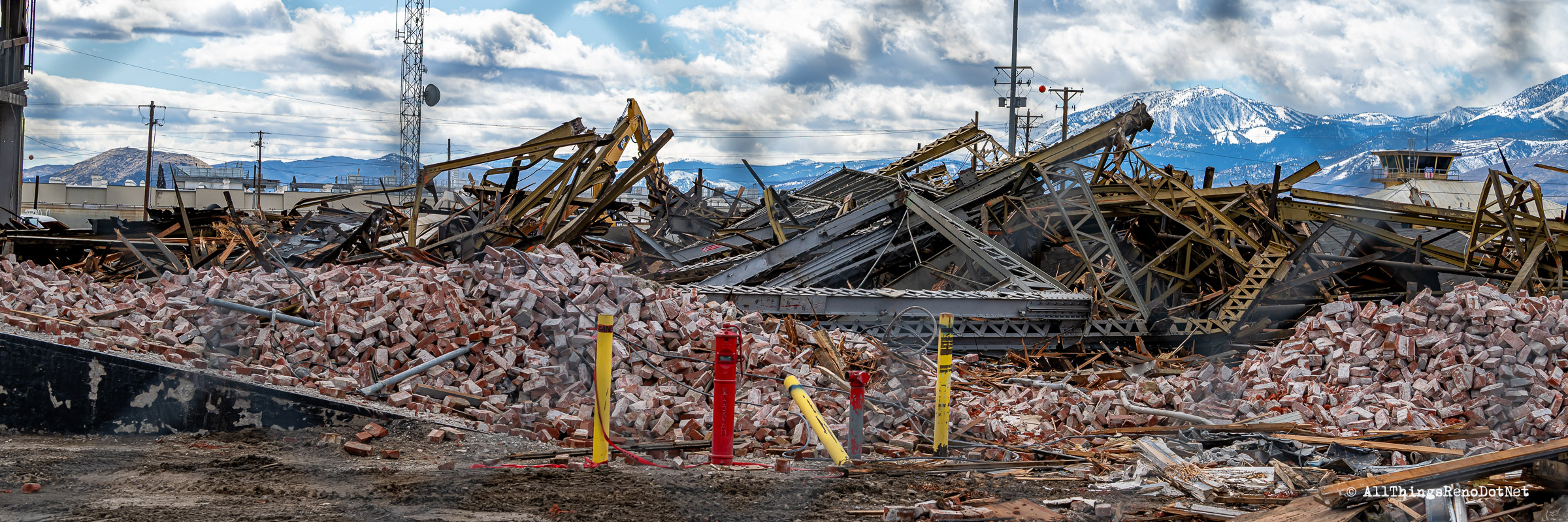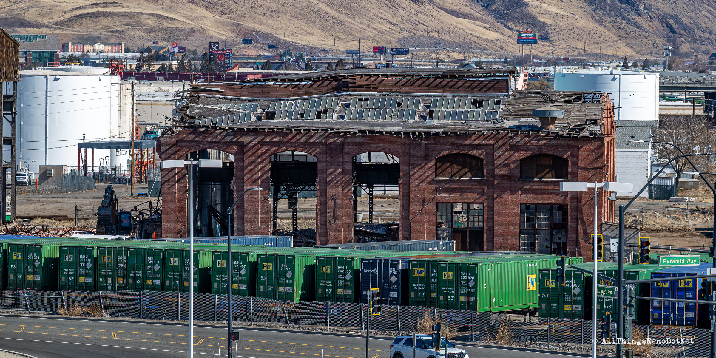 The Union Pacific Railroad Machine Shop, built 120 years ago, was being razed to make way for their expansion of Intermodal Container handling. In other words, a parking lot for container trailers. The building hadn’t been used as a machine shop in years, instead as storage for RV’s, etc. The demolition was seemingly being done in three phases. Cleaning up the resulting debris from each before moving on to the next.