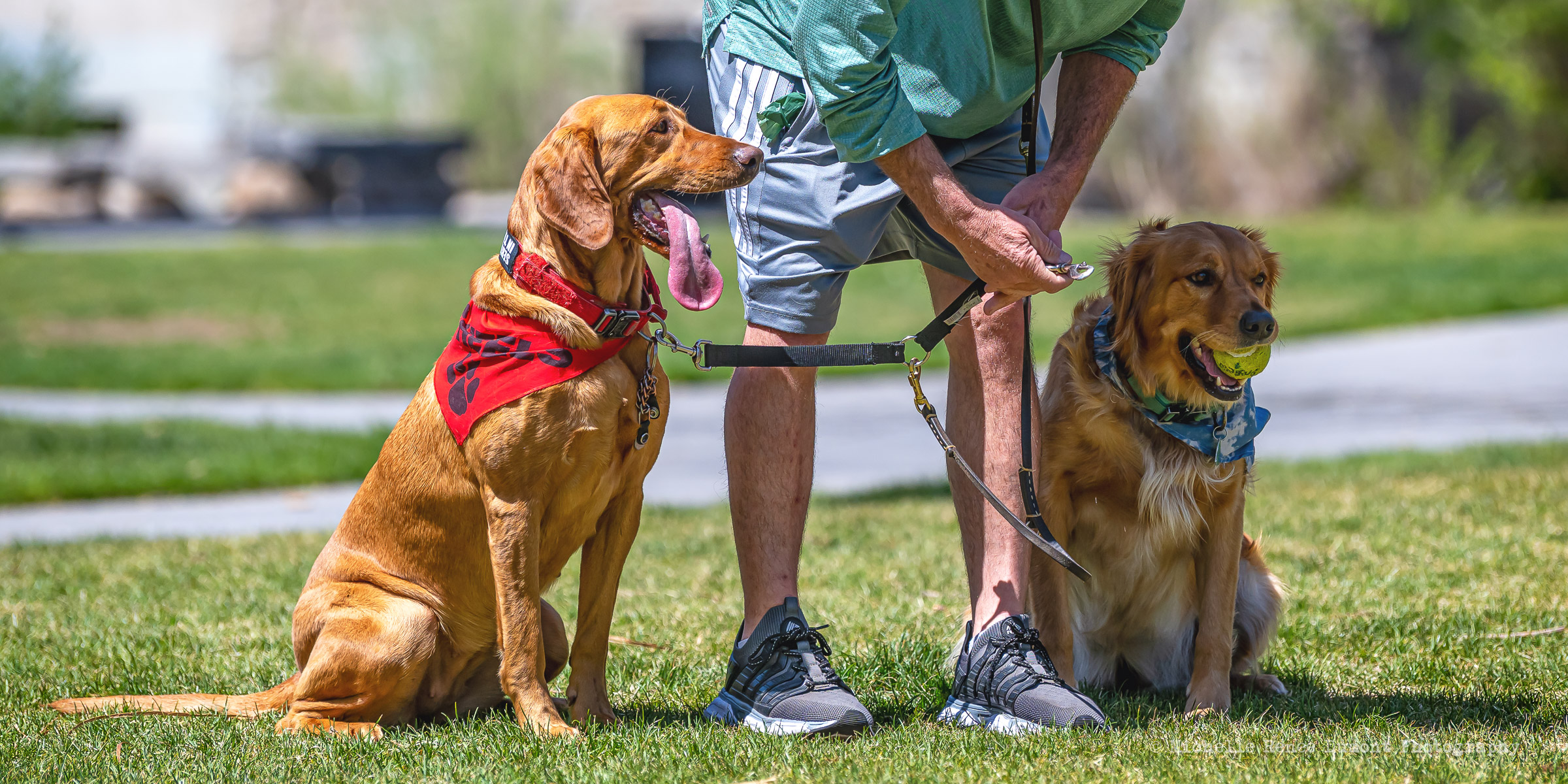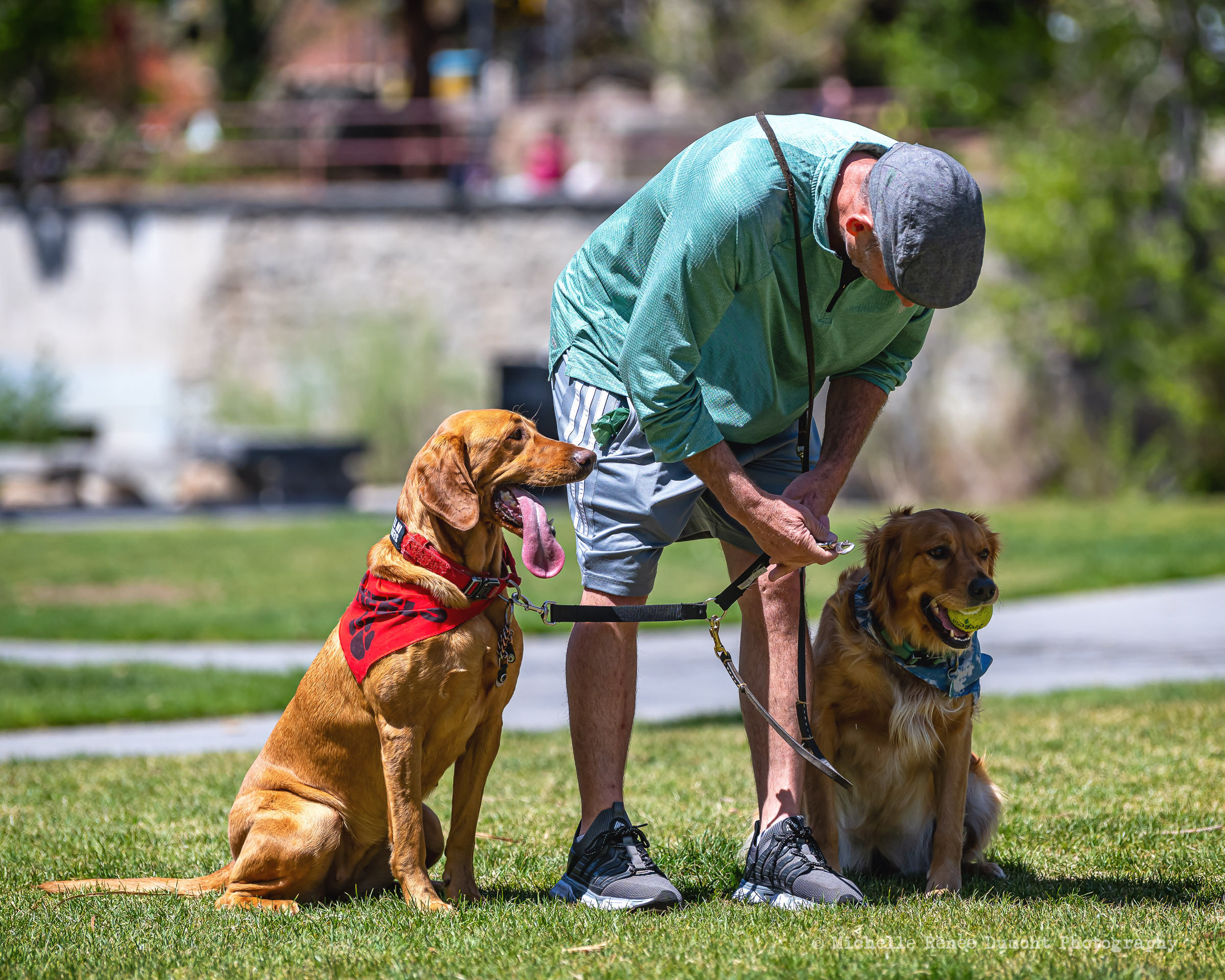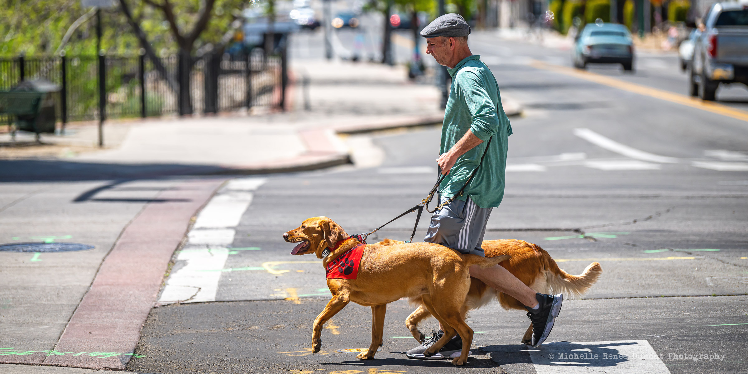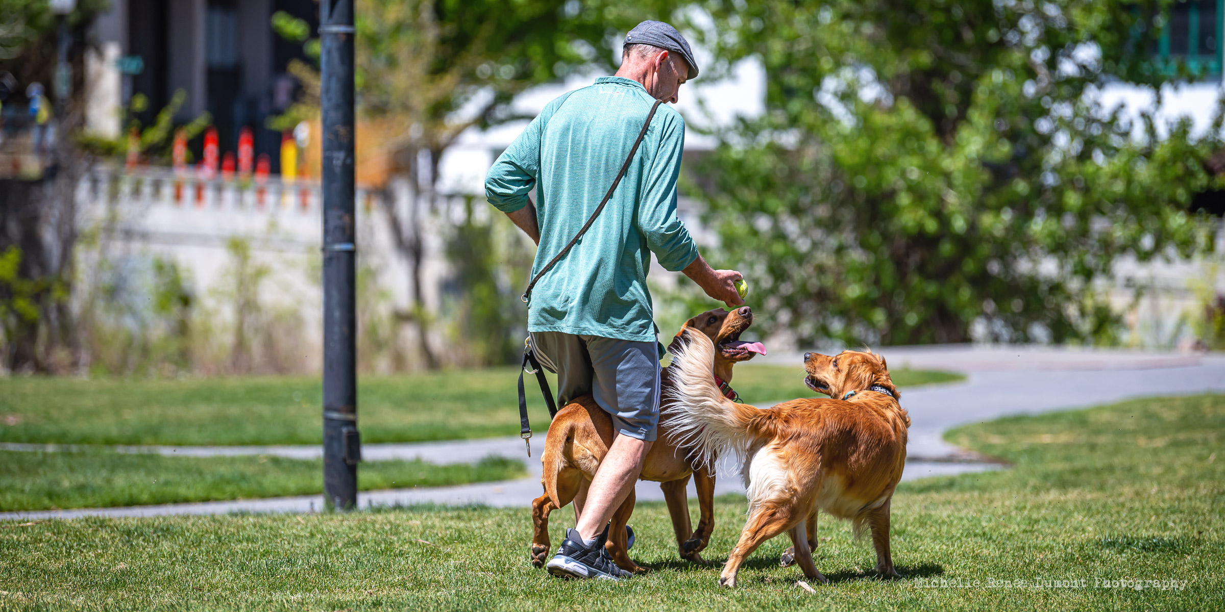 I initially spotted this threesome on a corner waiting for the light to change. The dogs were sitting pretty looking forward and their owner was standing tall. But by the time I got my camera up to the eye they were already on their way. I was able to get these shots on the street and in the park.