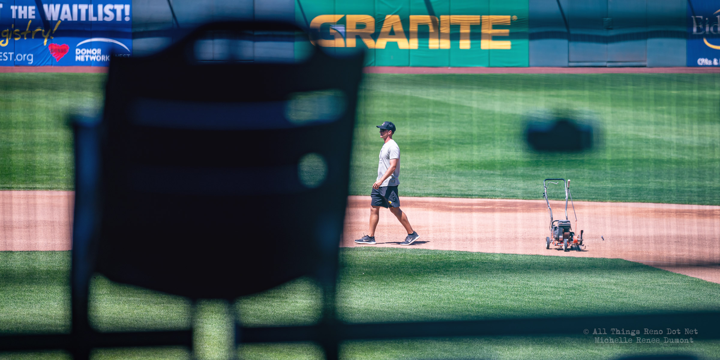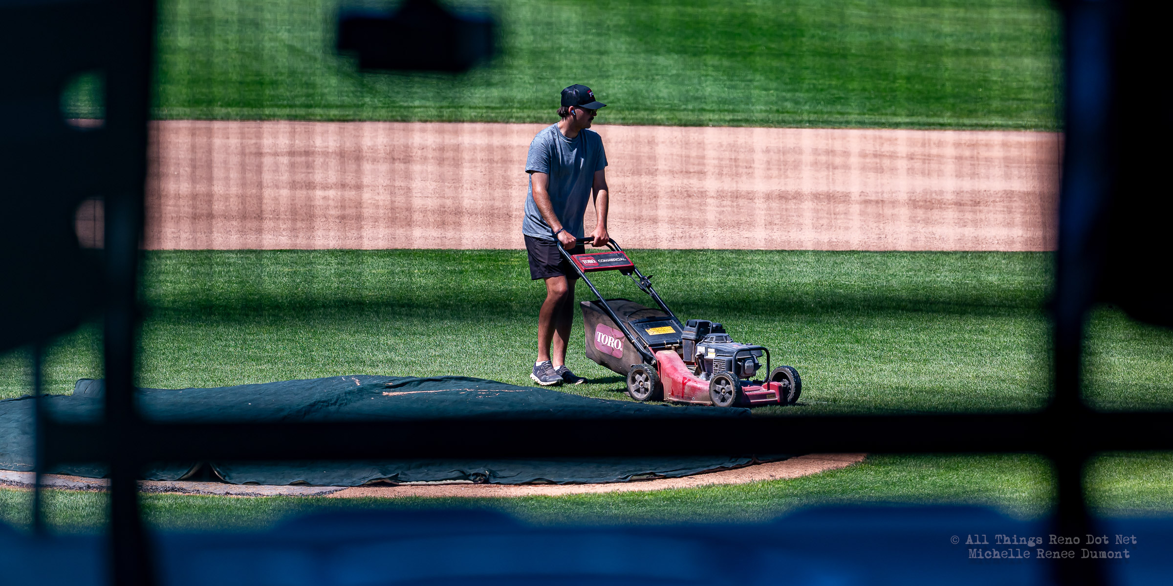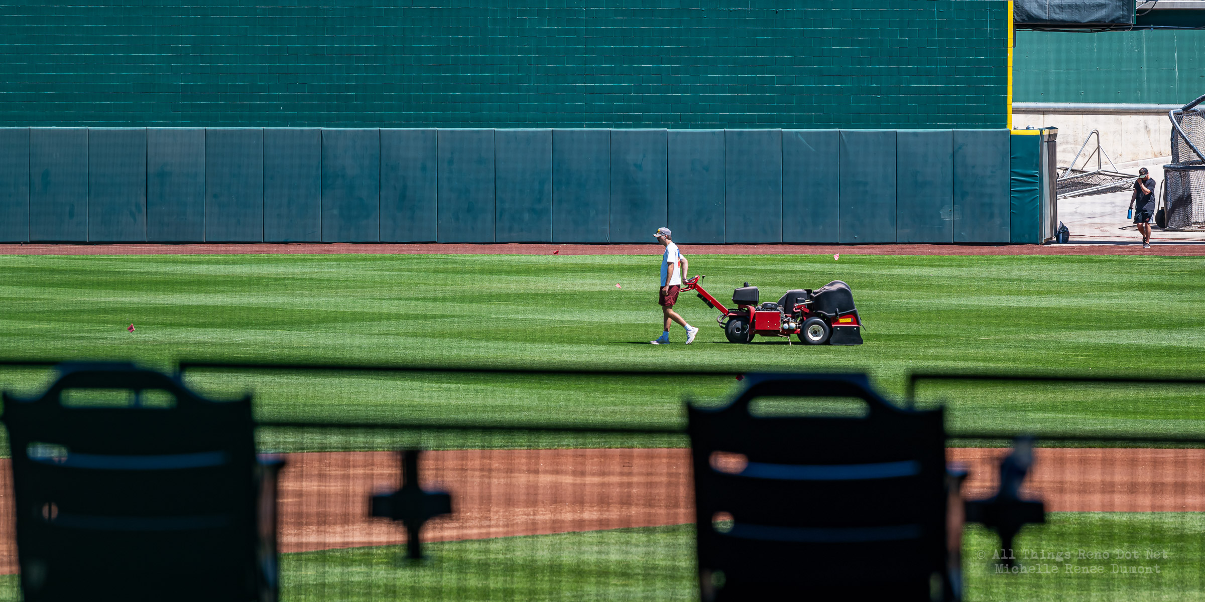 Keeping the field in pristine condition while the team is away. As I was walking by the stadium gates I noticed the young lady kneeling down on the grass with her 5 gallon bucket and had to get that photo. Then the fella with what I thought was a mower, but on second look is probably something else completely came into view. Twice actually. The ticket office screamed photo and the signs as well.