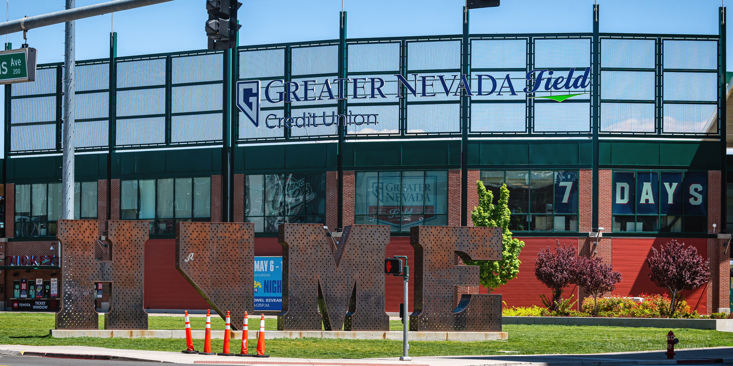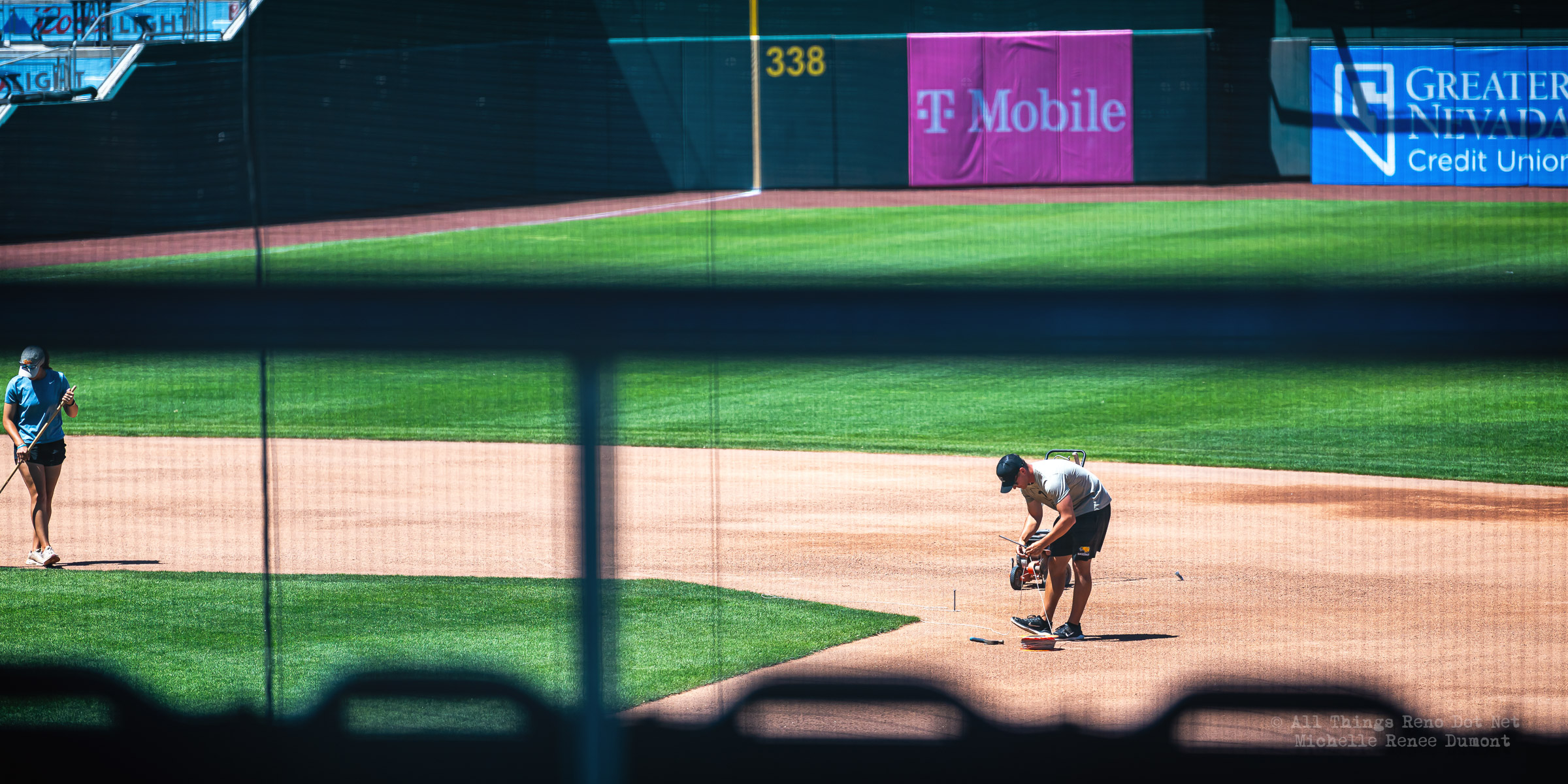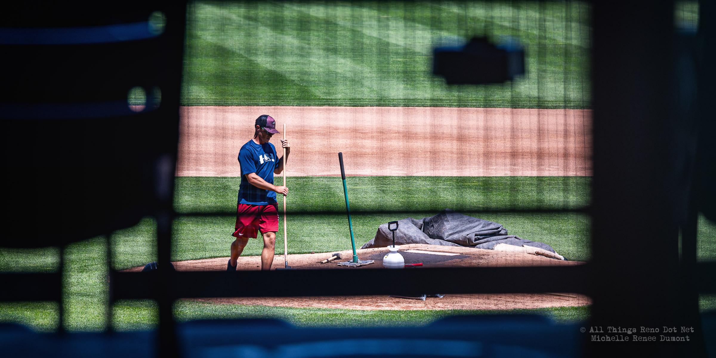 Keeping the field in pristine condition while the team is away. As I was walking by the stadium gates I noticed the young lady kneeling down on the grass with her 5 gallon bucket and had to get that photo. Then the fella with what I thought was a mower, but on second look is probably something else completely came into view. Twice actually. The ticket office screamed photo and the signs as well.