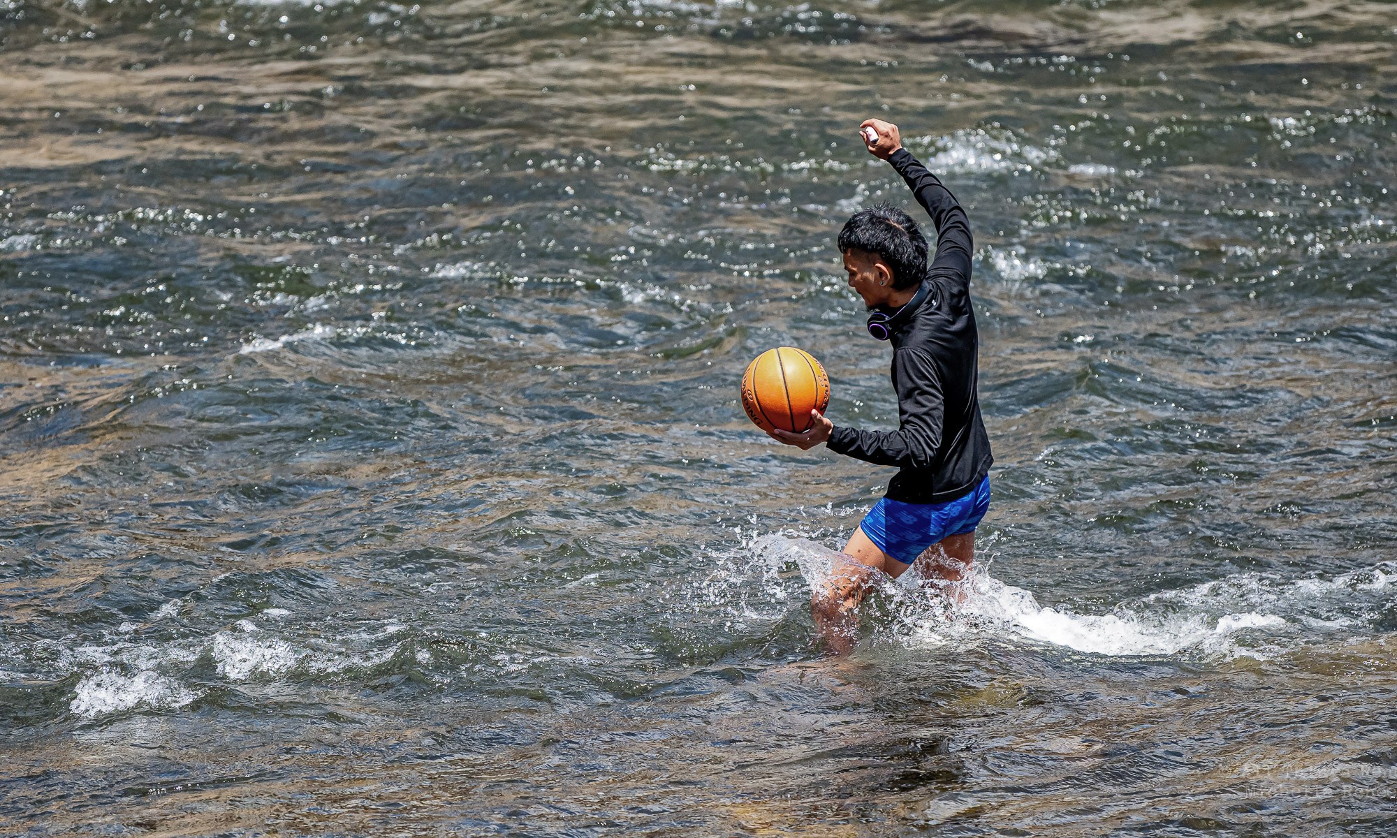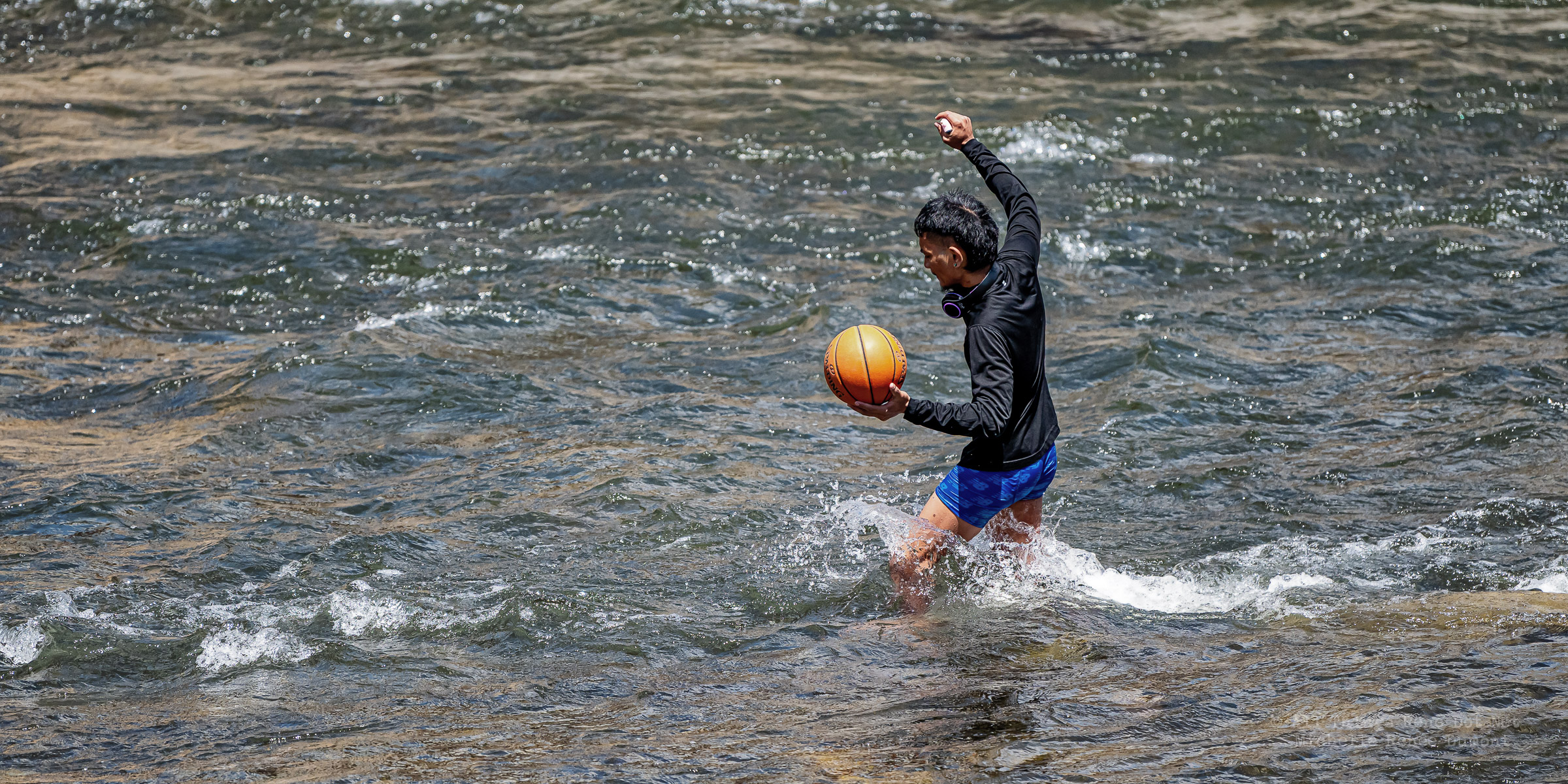 For the curious, the ball was stuck in some debris in between some rocks. And had been there a couple of days. Probably a casualty of a basketball court a few blocks up the river.