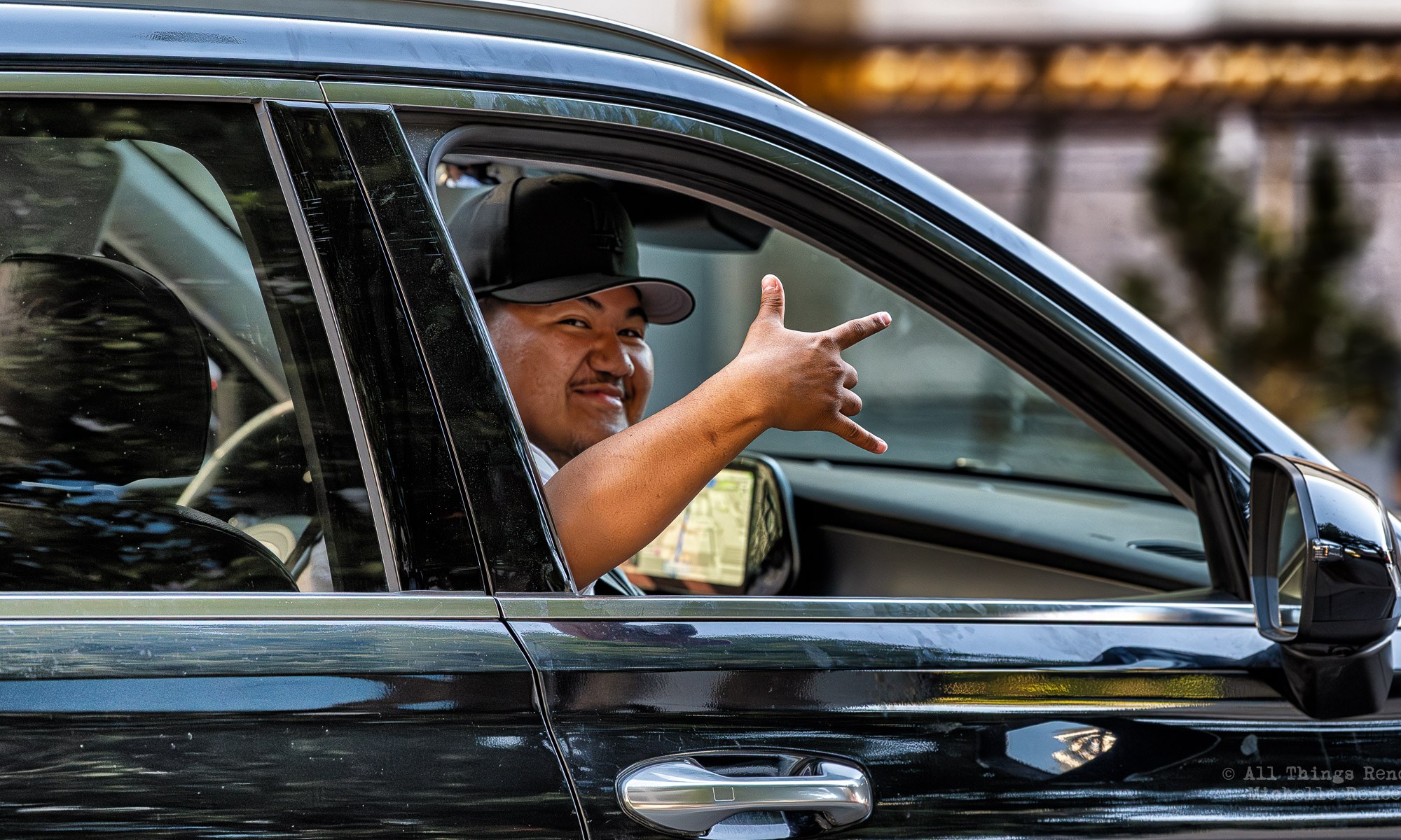 I don’t normally respond to people’s request for an impromptu photograph when they pull up to me on the sidewalk, but I figured I may as well start doing it. They pulled up to a red traffic light and yelled out the window for me to take their picture. So I did. And this is the result