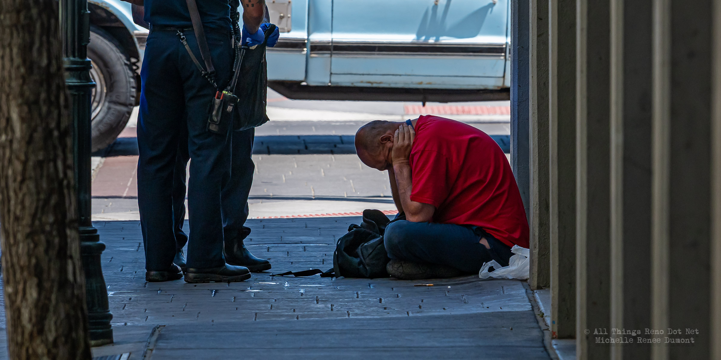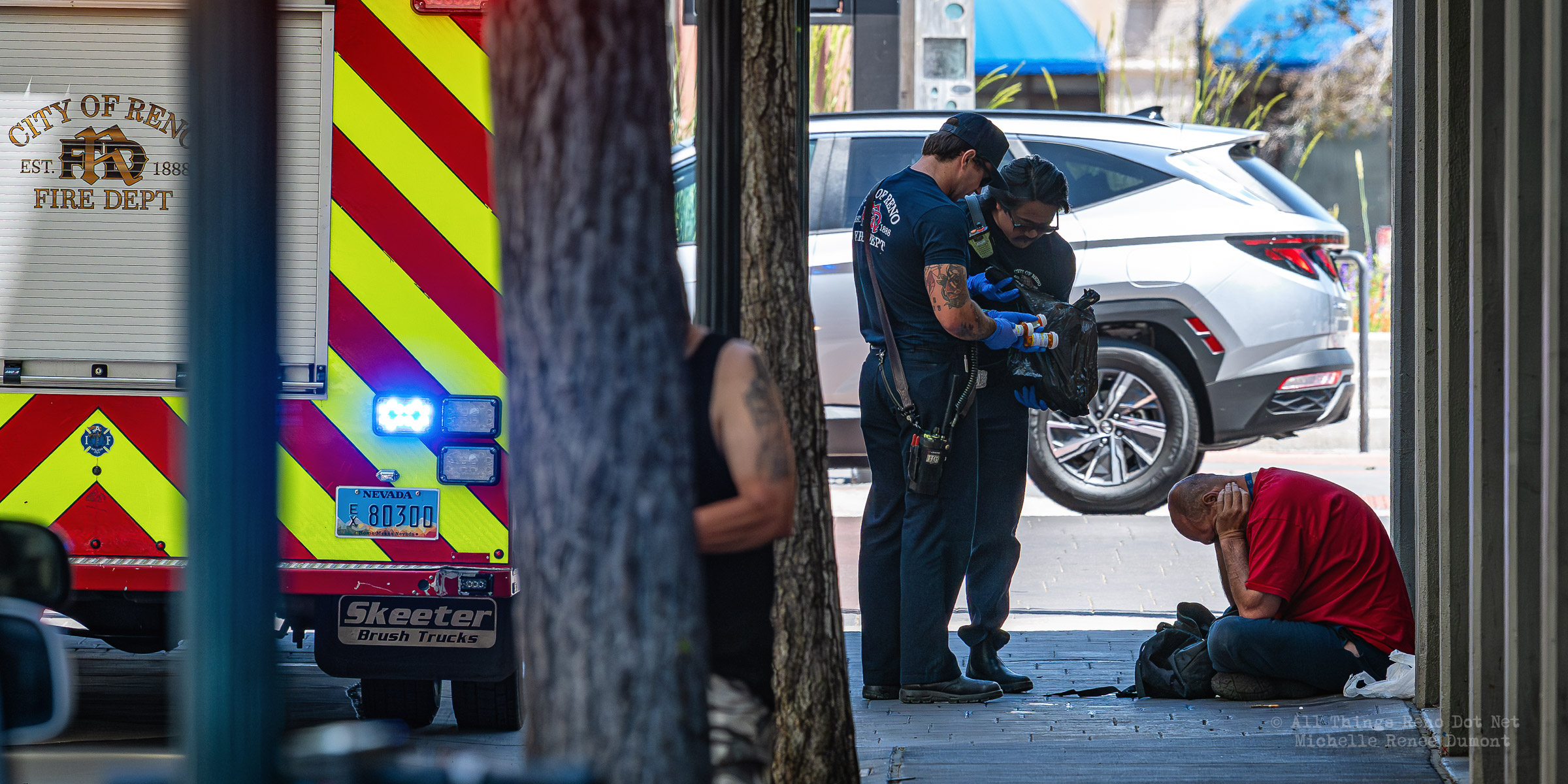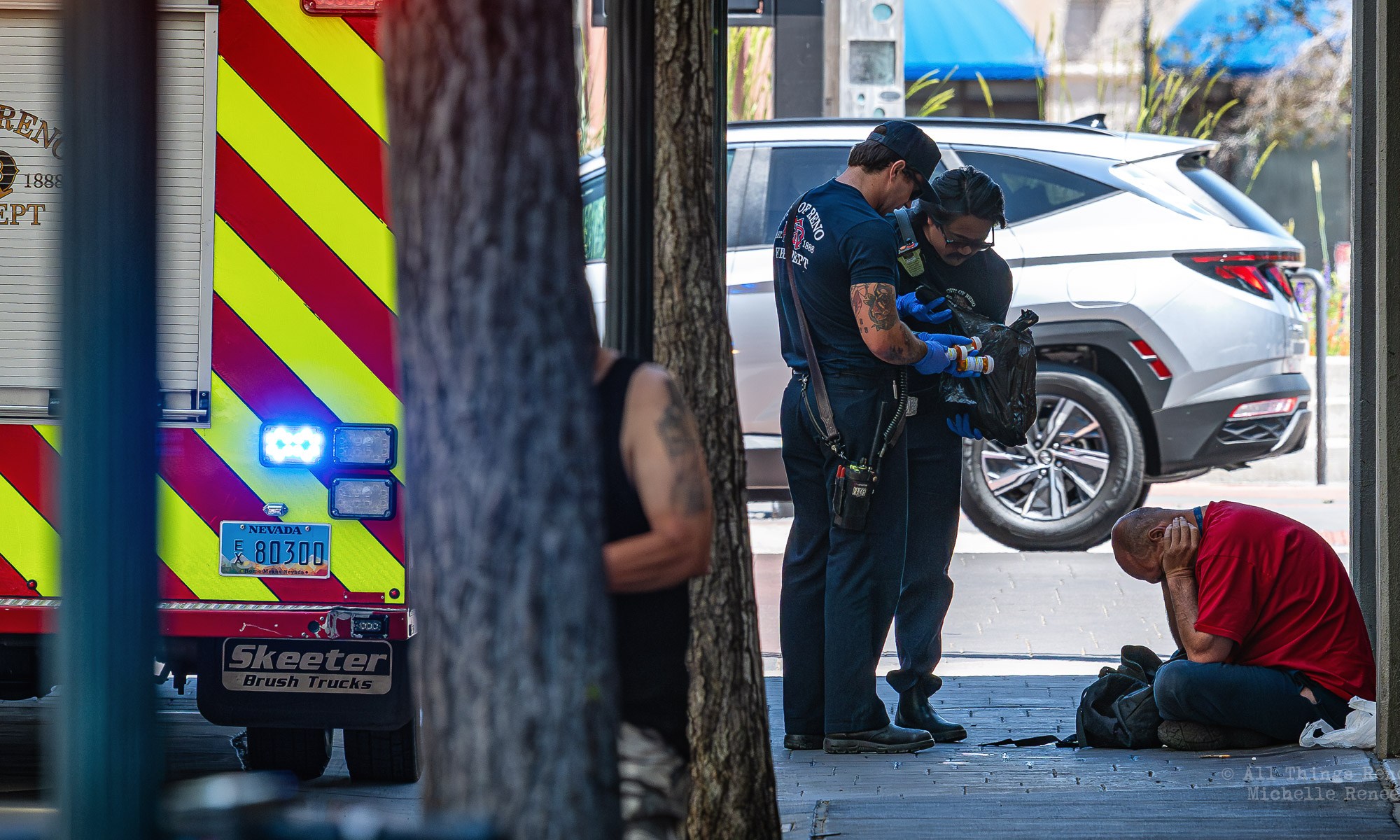 I walked by this fella earlier. He was sprawled out on the sidewalk passed out. Evidently someone called for help. Members of the Fire Department were the first to respond. He had a number of medications in a plastic bag, which was probably the reason for his condition. Eventually REMSA showed up and transported him to a local hospital.