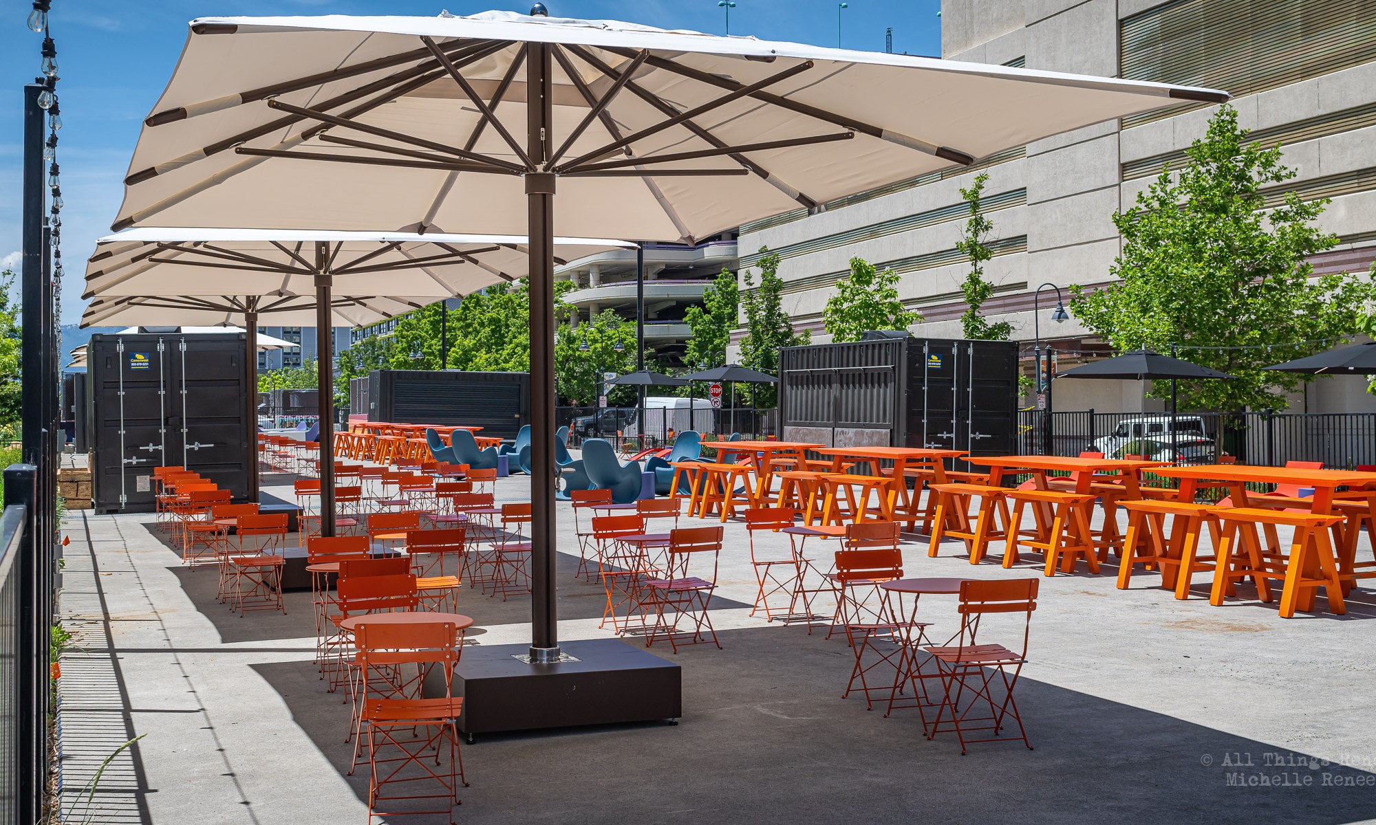 The ReTRAC Plaza is situated between the Eldorado Resort Casino and the Whitney Peak Hotel. It is a part of the train trench built back between 2002 and 2006. The plaza has been used for various functions over the years, including concerts and many of our downtown events sponsored by the downtown casinos. In 2021 the entire concrete slab was covered in a mural dubbed Locomotion. Recently, because of peeling and fading, it was decided after only 3 years that the mural was to be removed. Today, the plaza has a new look. In time for the upcoming Summer events