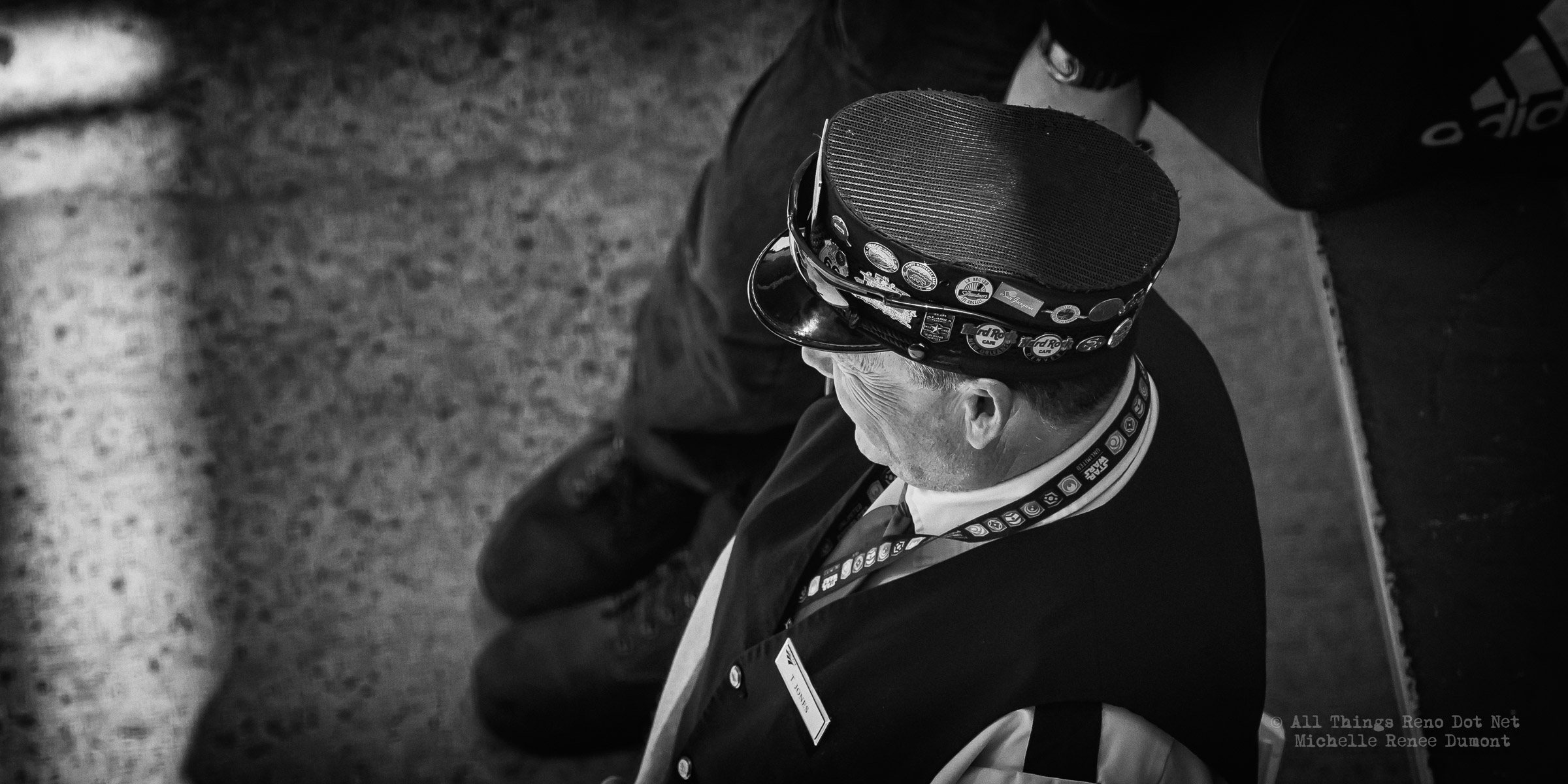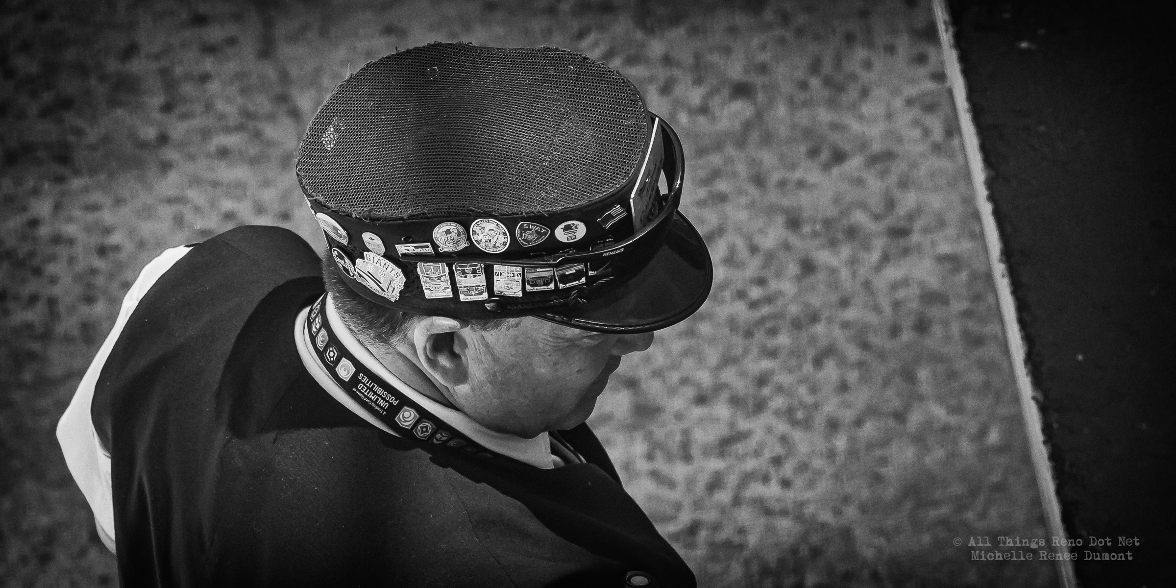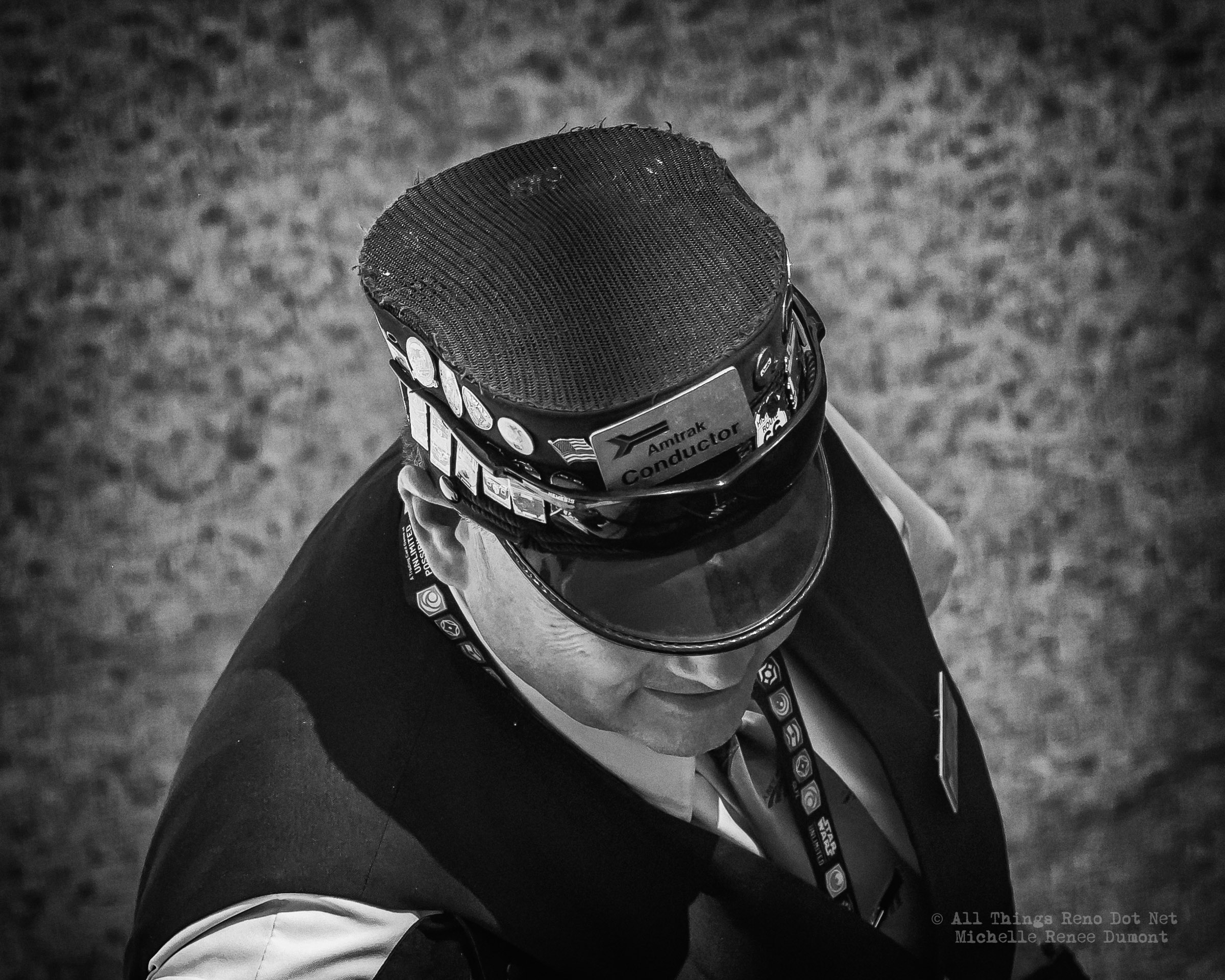 Not all the pins are railroad related. I counted 5, maybe 6 railroad related pins. The other pins vary from sports teams to law enforcement and restaurants, etc. In other words, quite the collection. Definitely a conversation piece. Shot down into the train trench from street level.