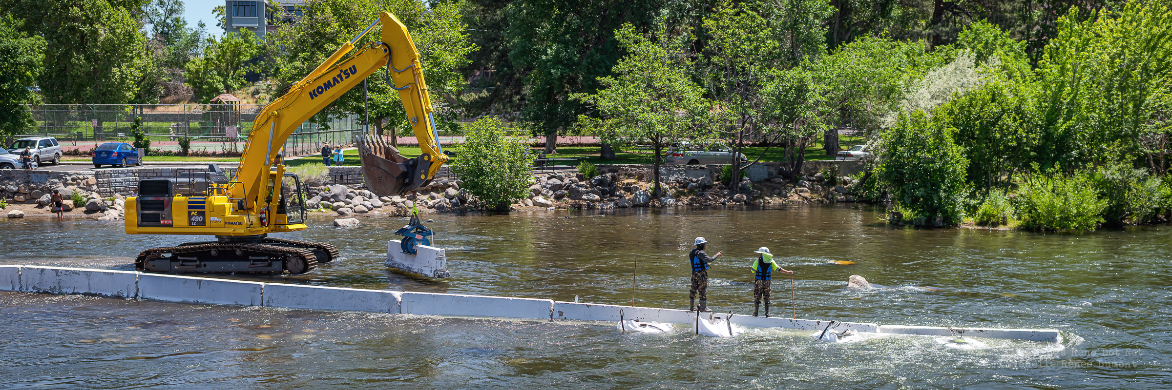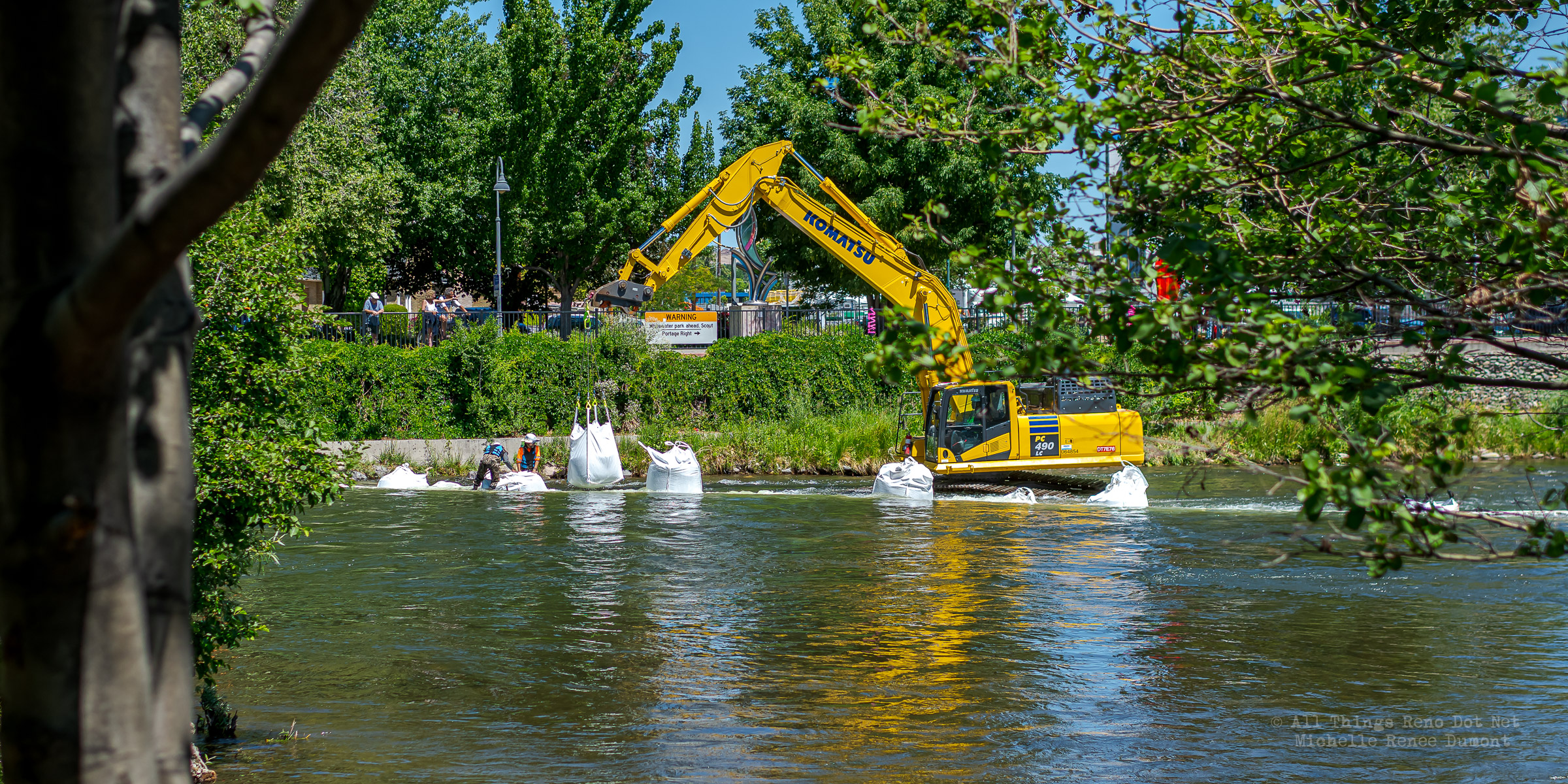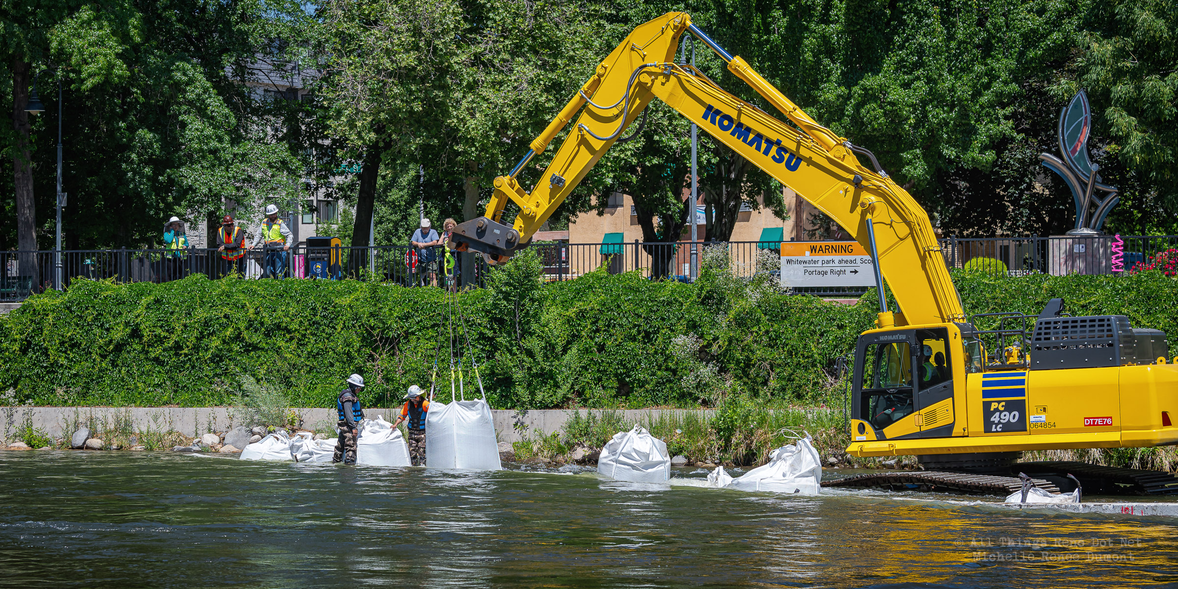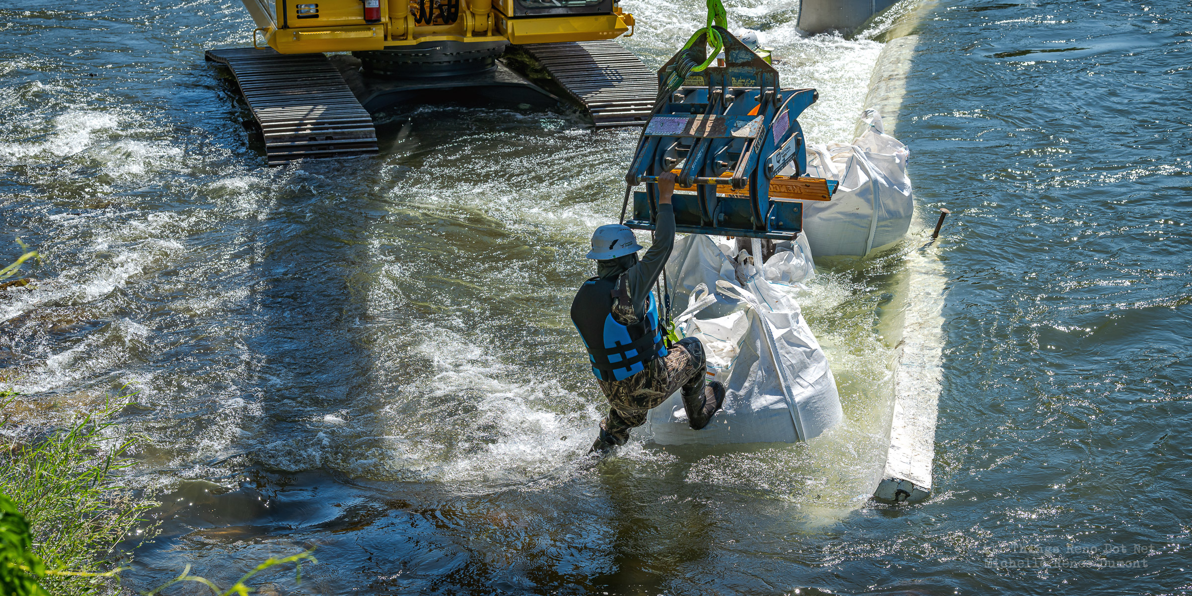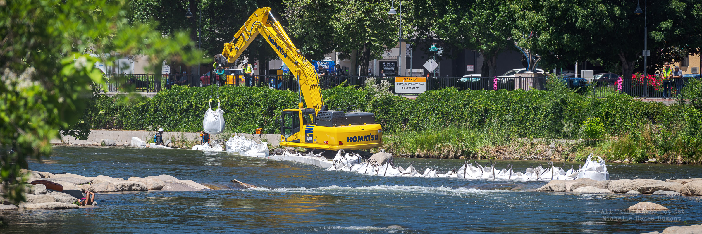 Workmen were busy moving sandbags and concrete barriers out Into the river to dam it up and reroute the flow to the south side channel of Wingfield Park.