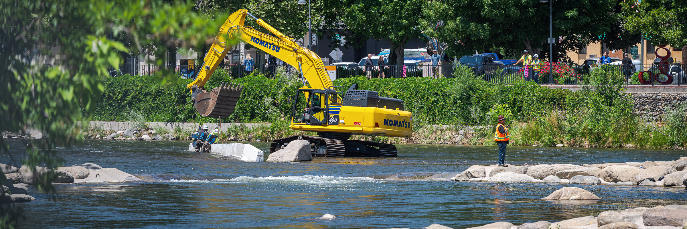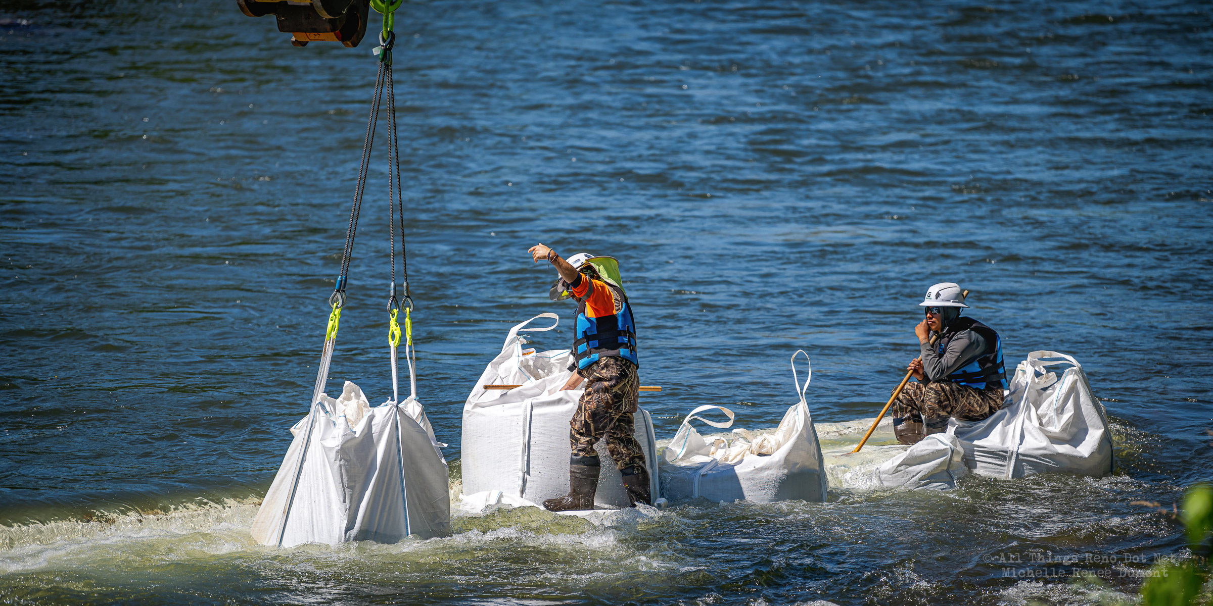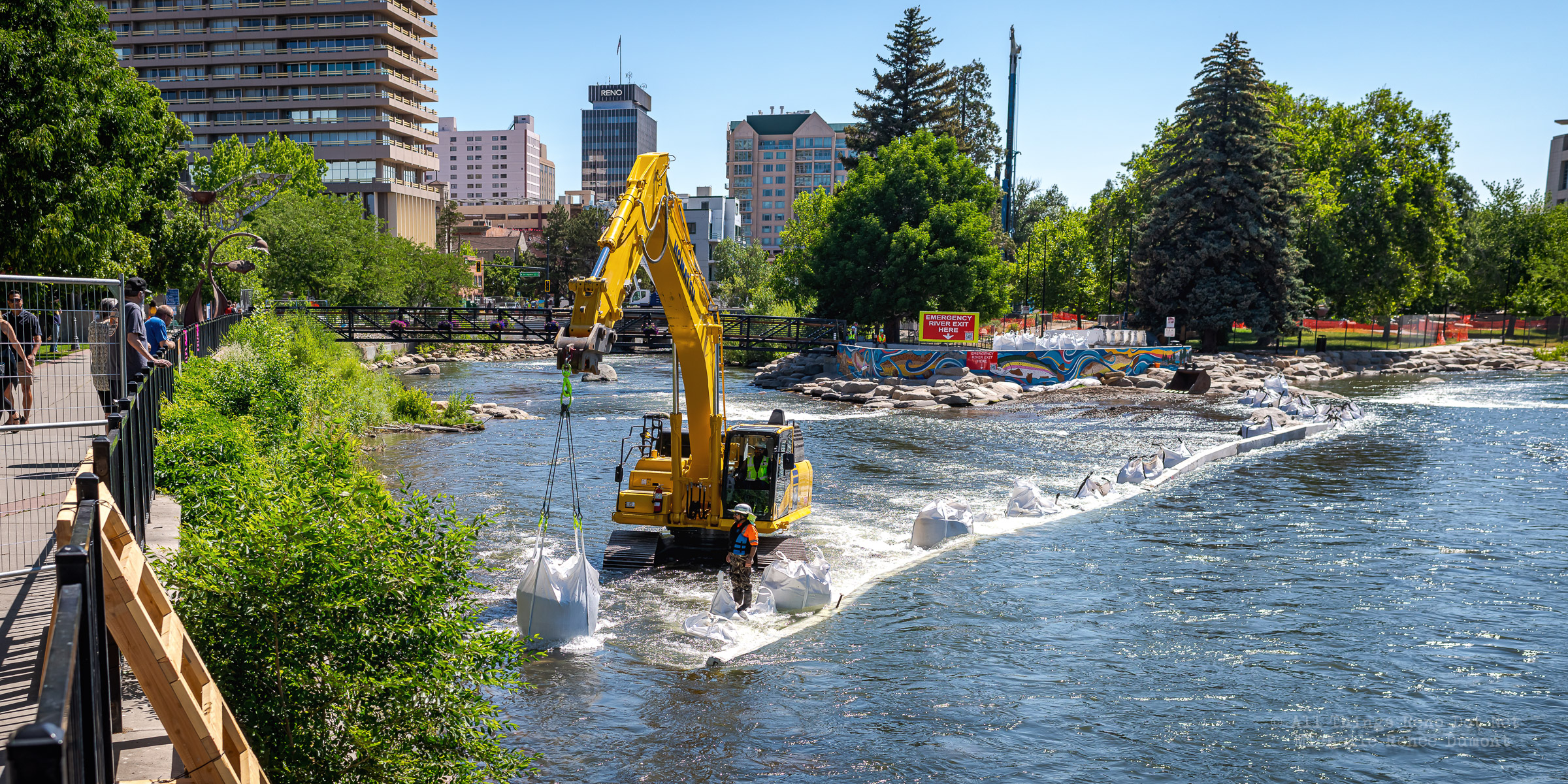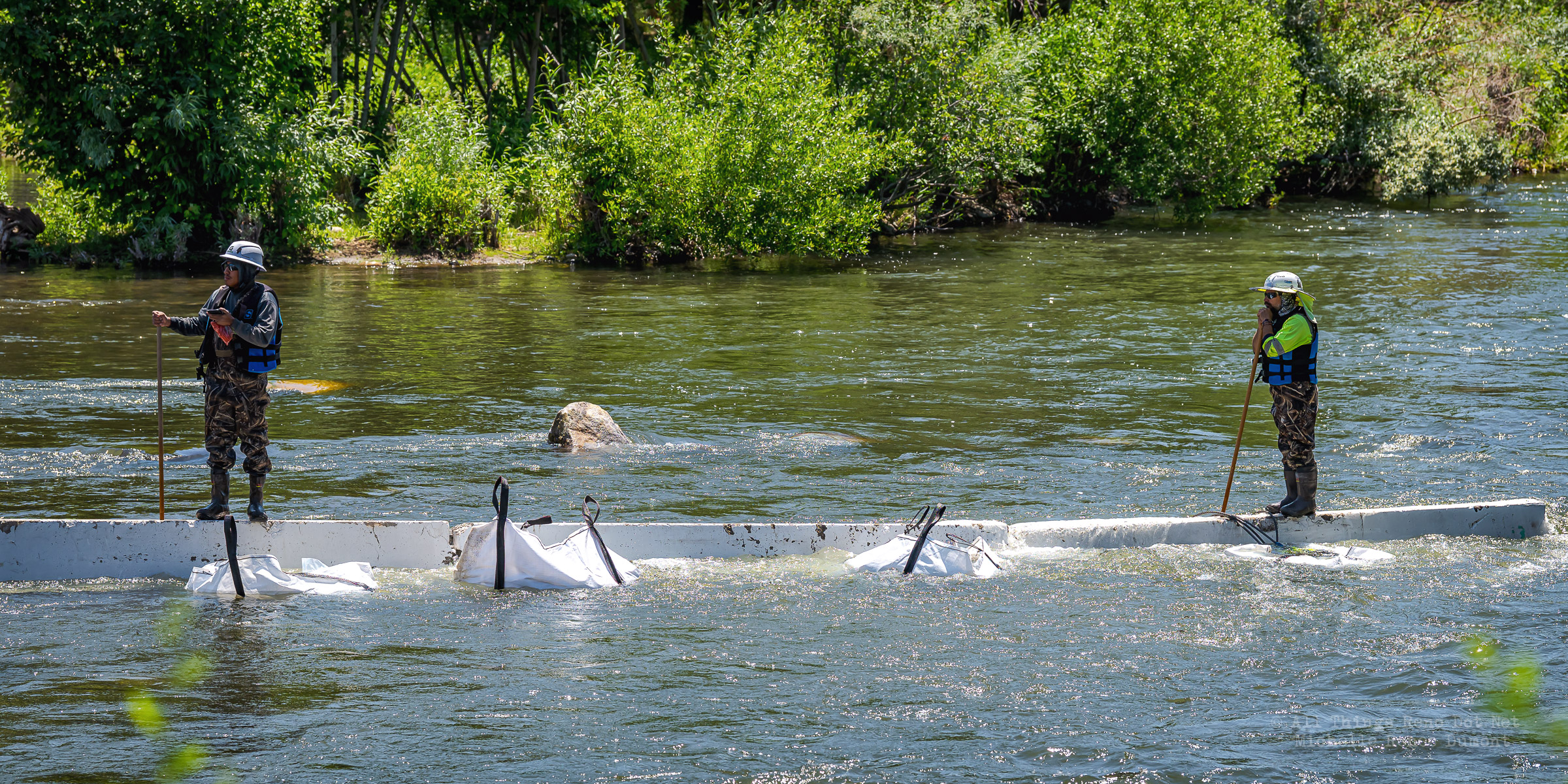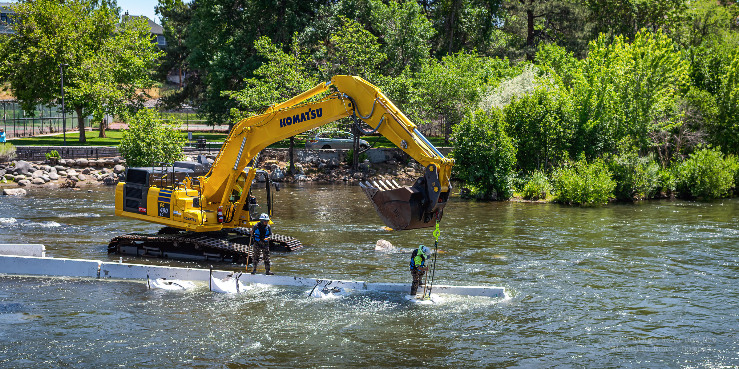 Workmen were busy moving sandbags and concrete barriers out Into the river to dam it up and reroute the flow to the south side channel of Wingfield Park.