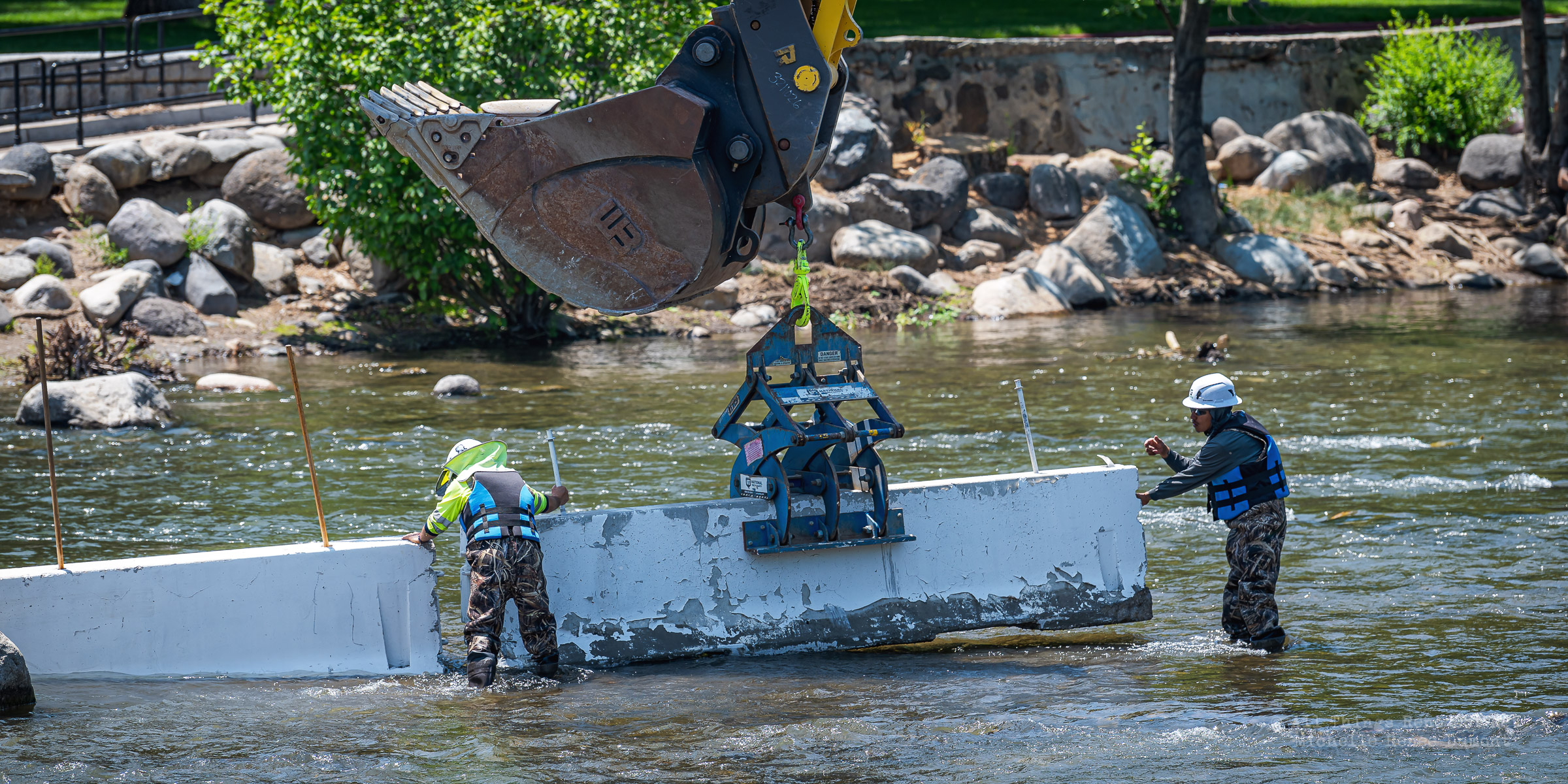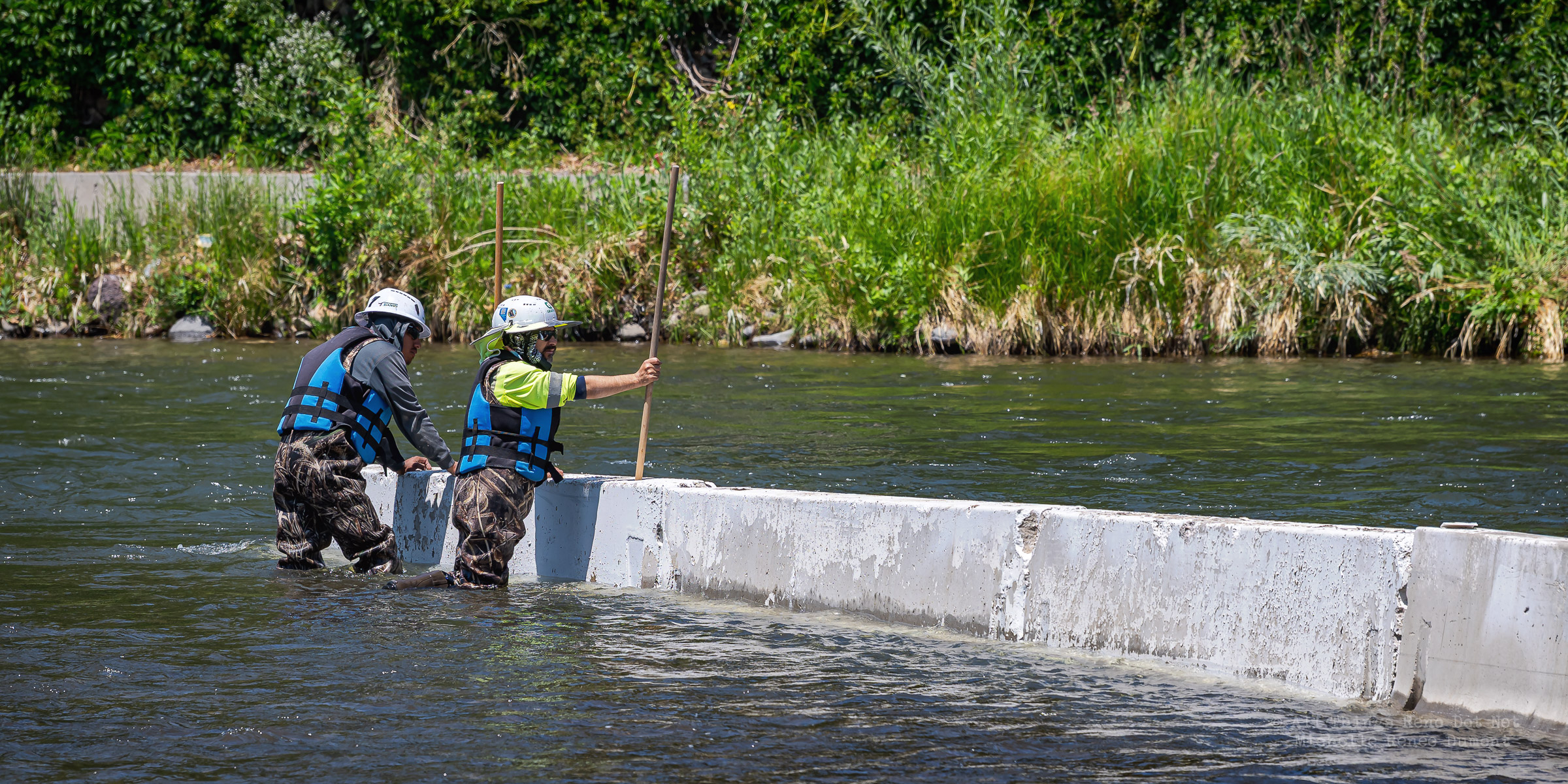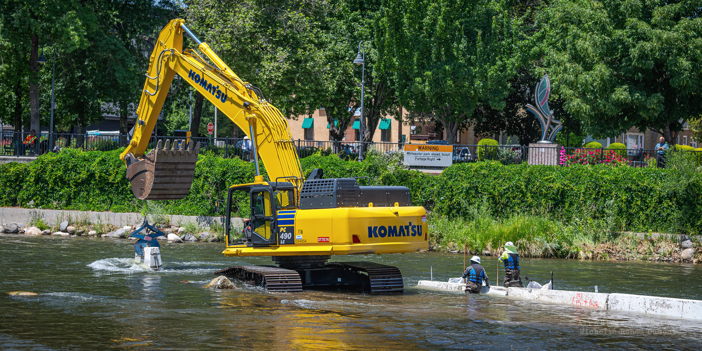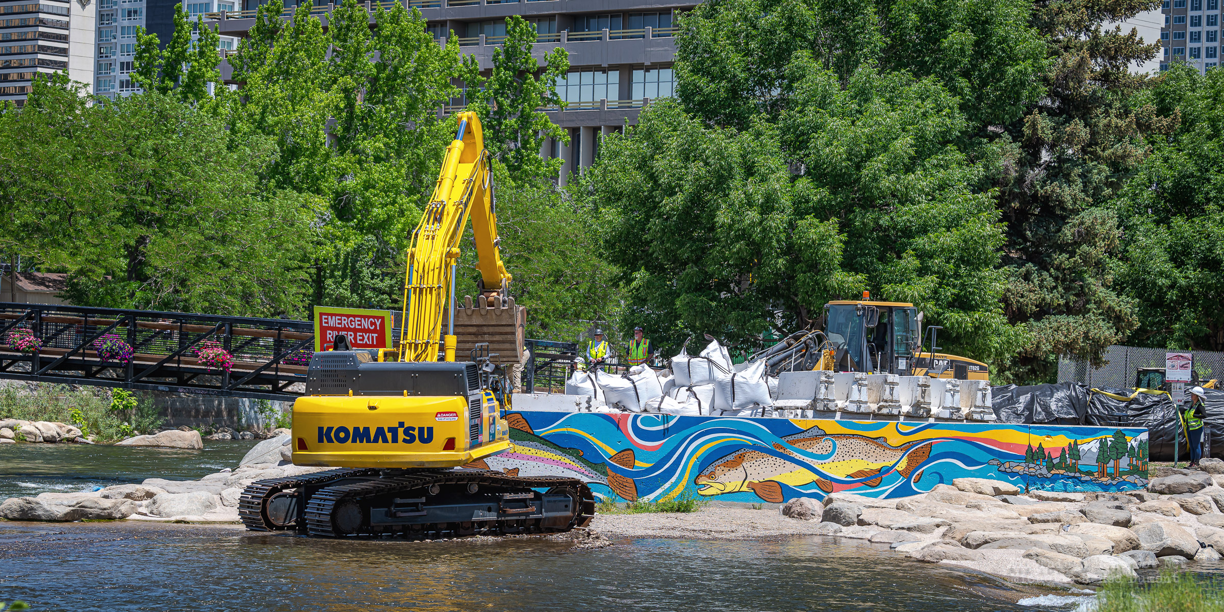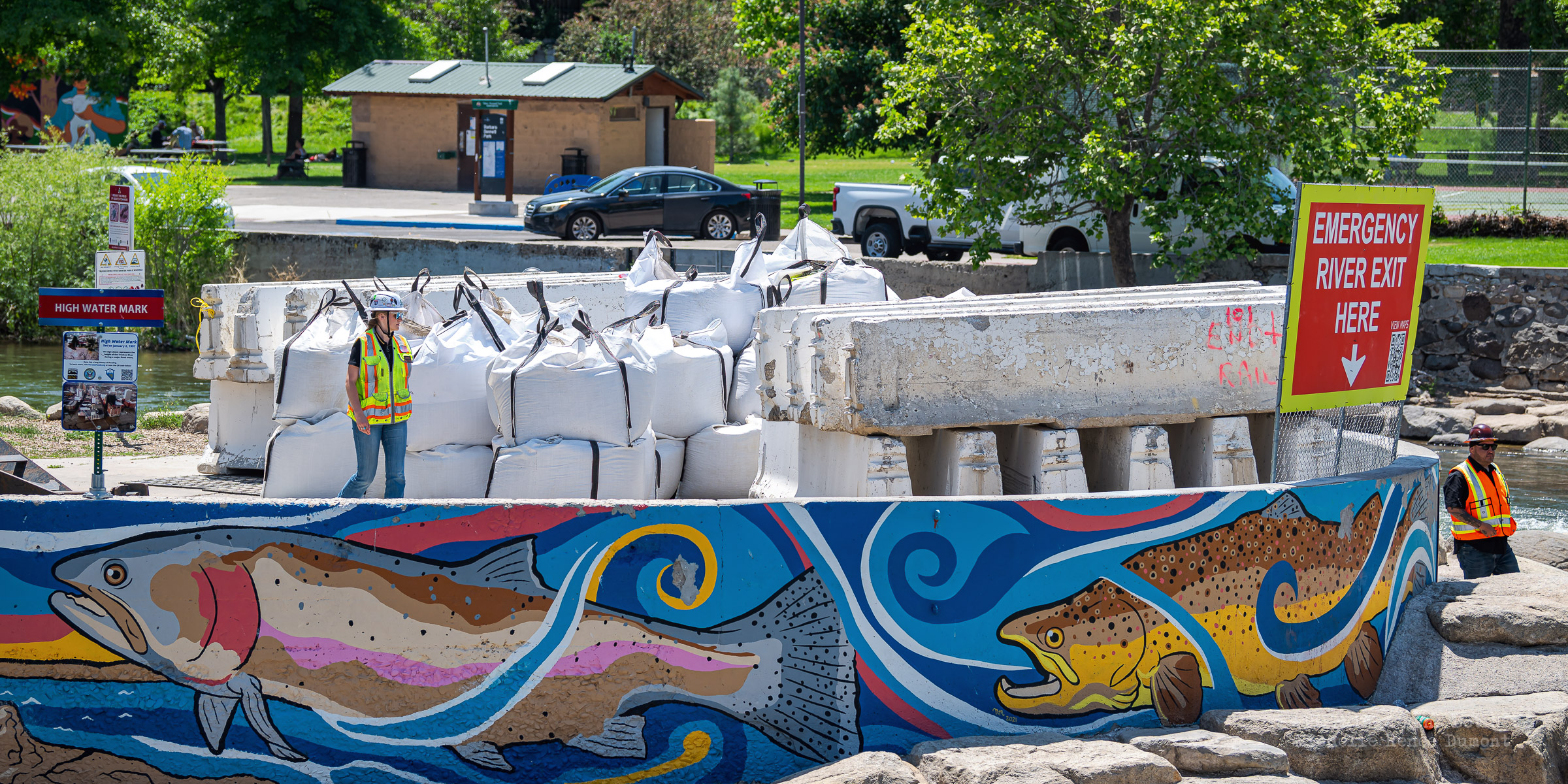 Workmen were busy moving sandbags and concrete barriers out Into the river to dam it up and reroute the flow to the south side channel of Wingfield Park.