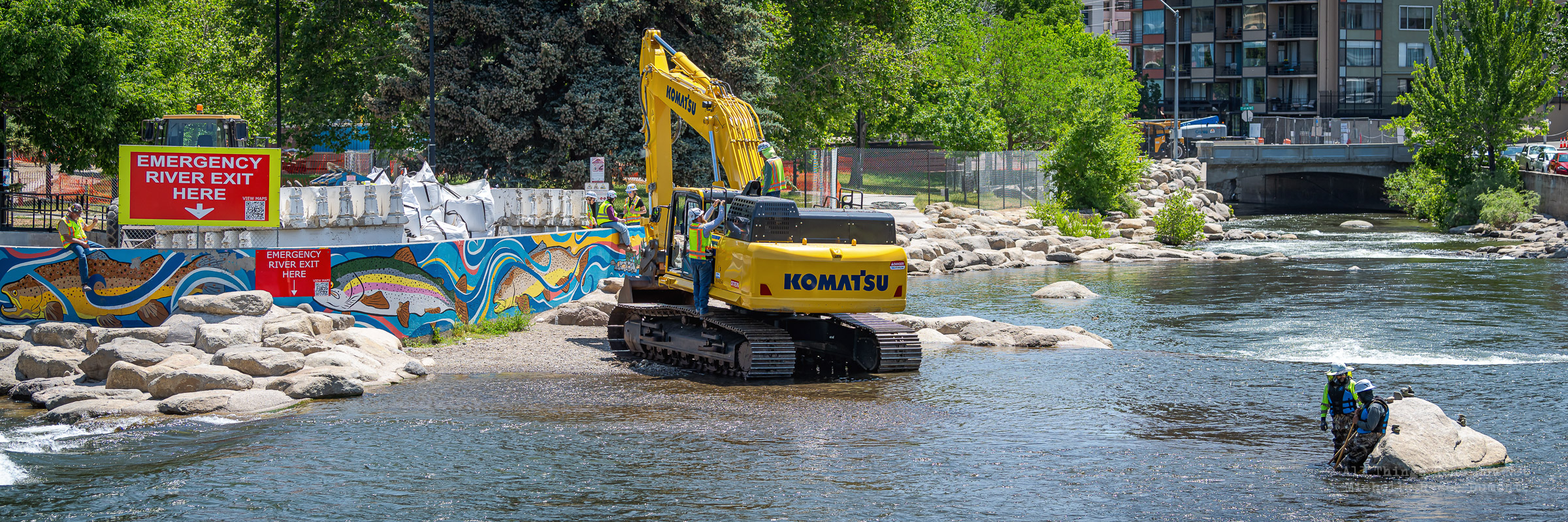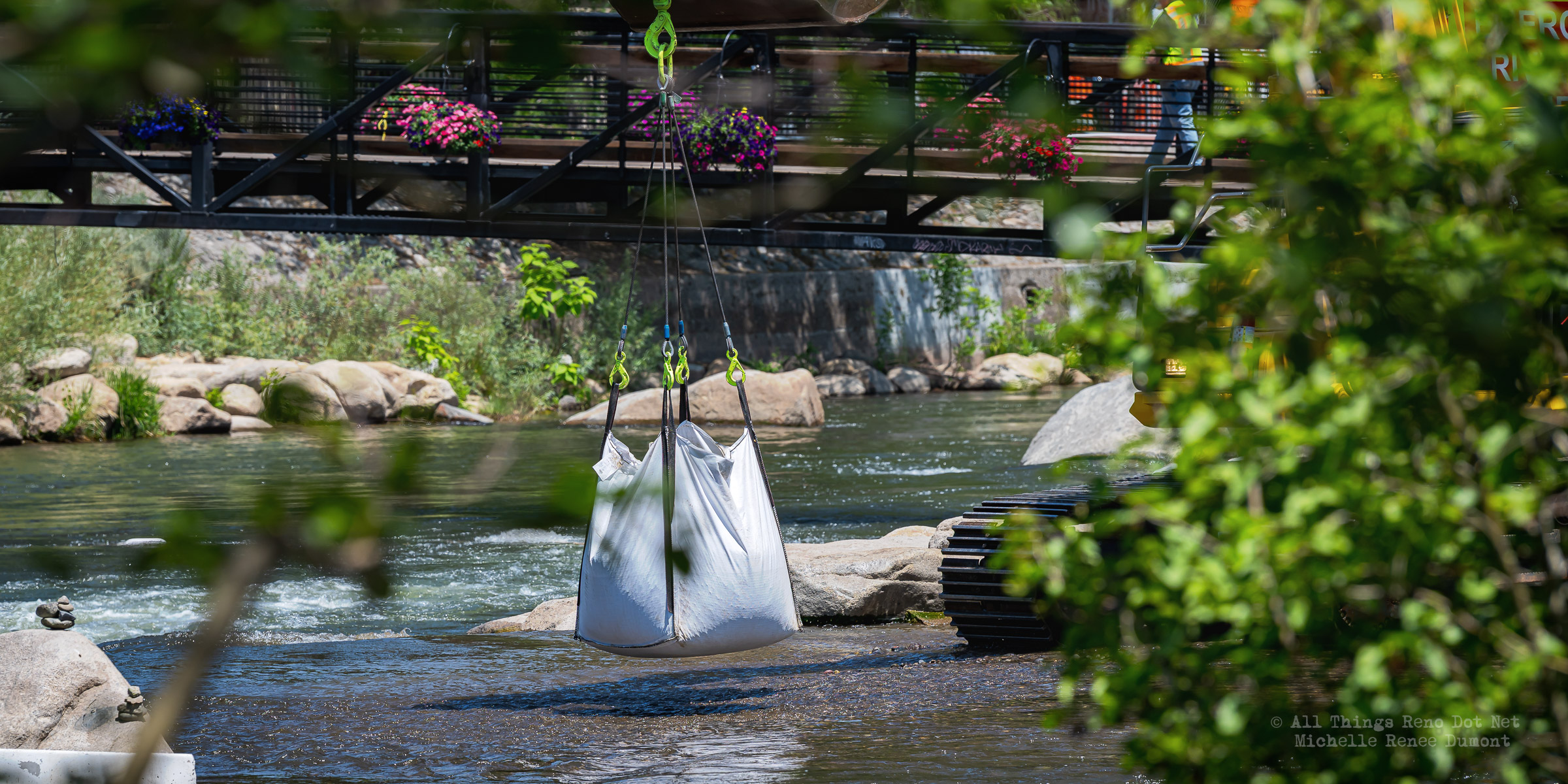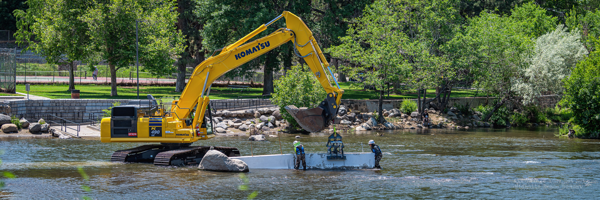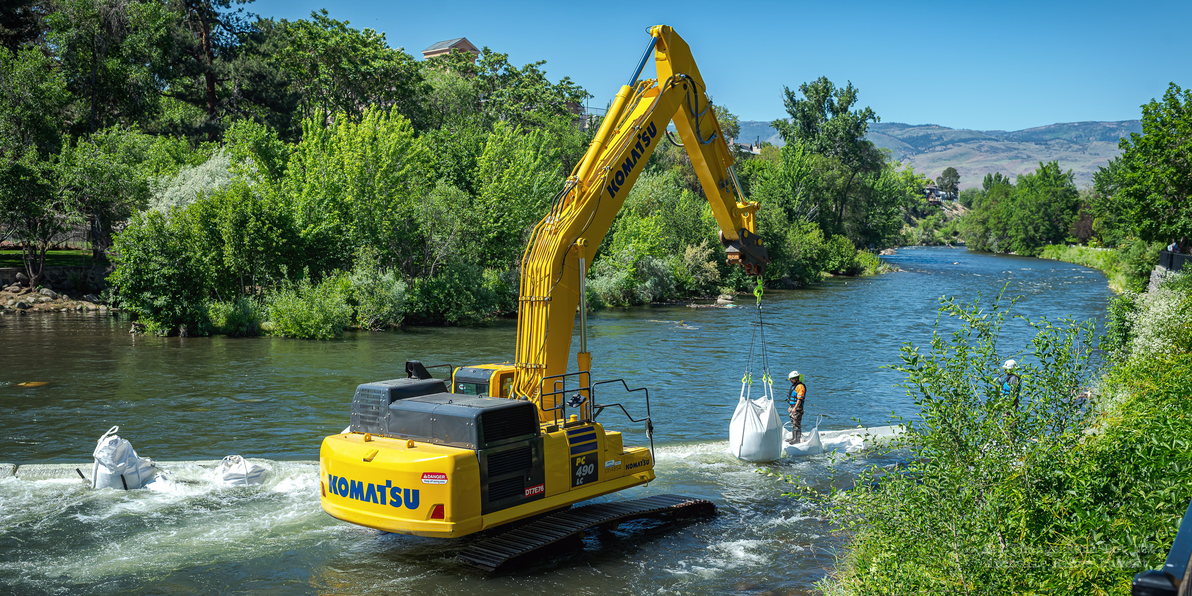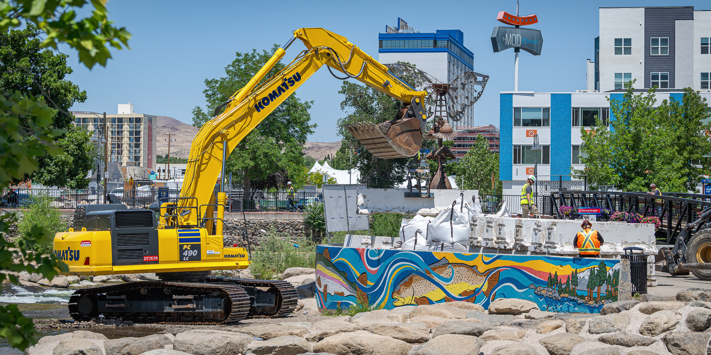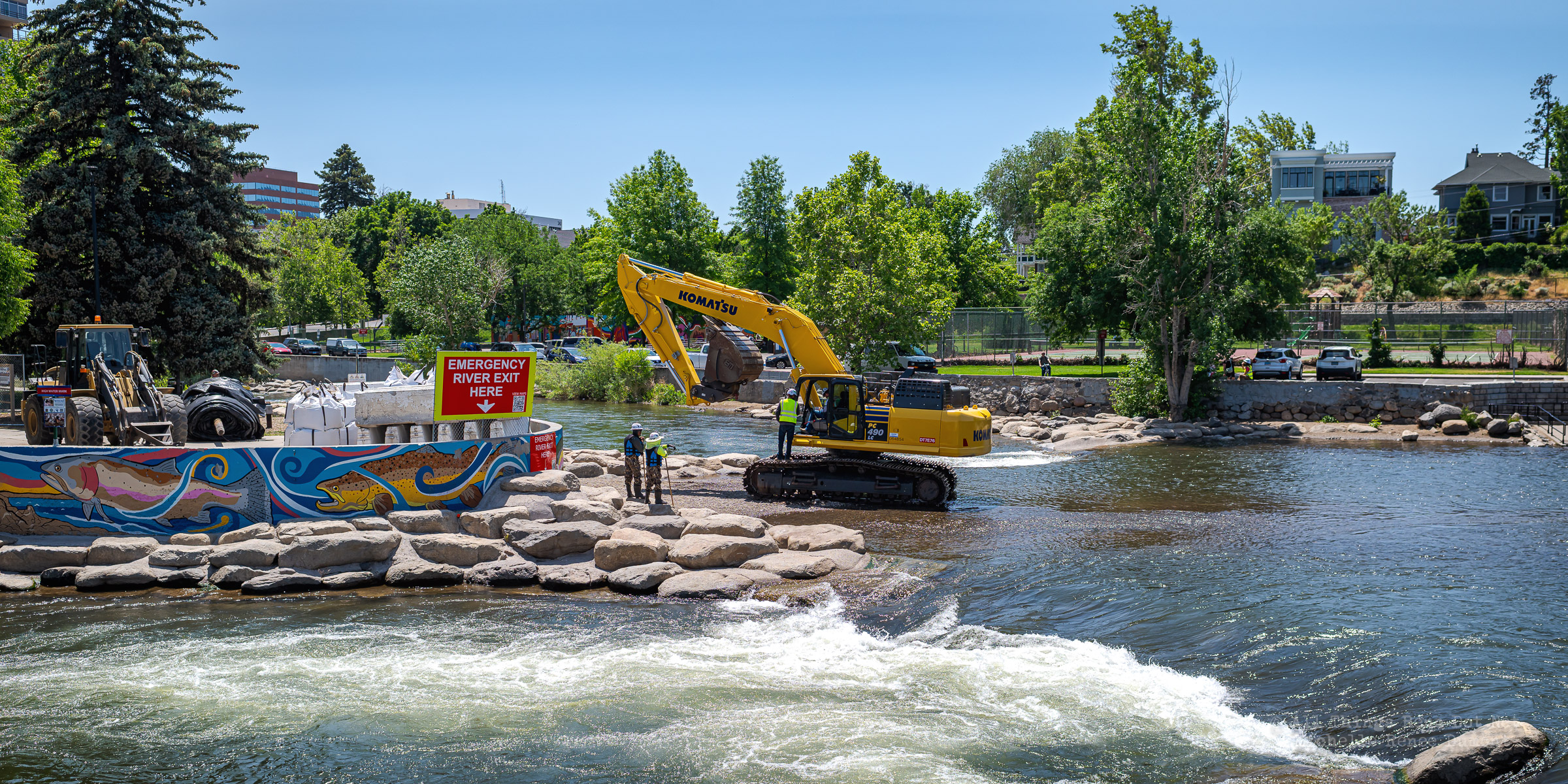Workmen were busy moving sandbags and concrete barriers out Into the river to dam it up and reroute the flow to the south side channel of Wingfield Park.