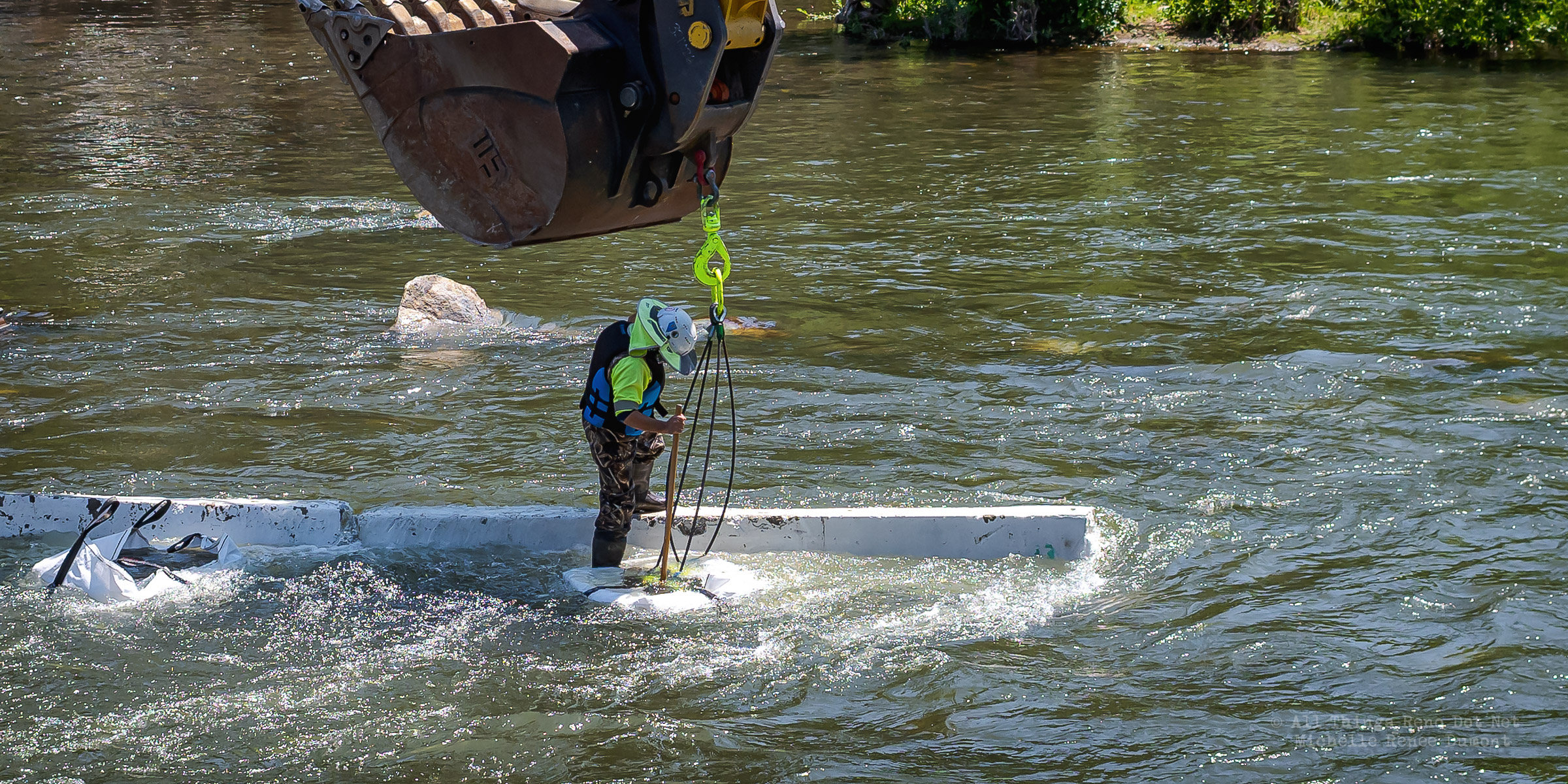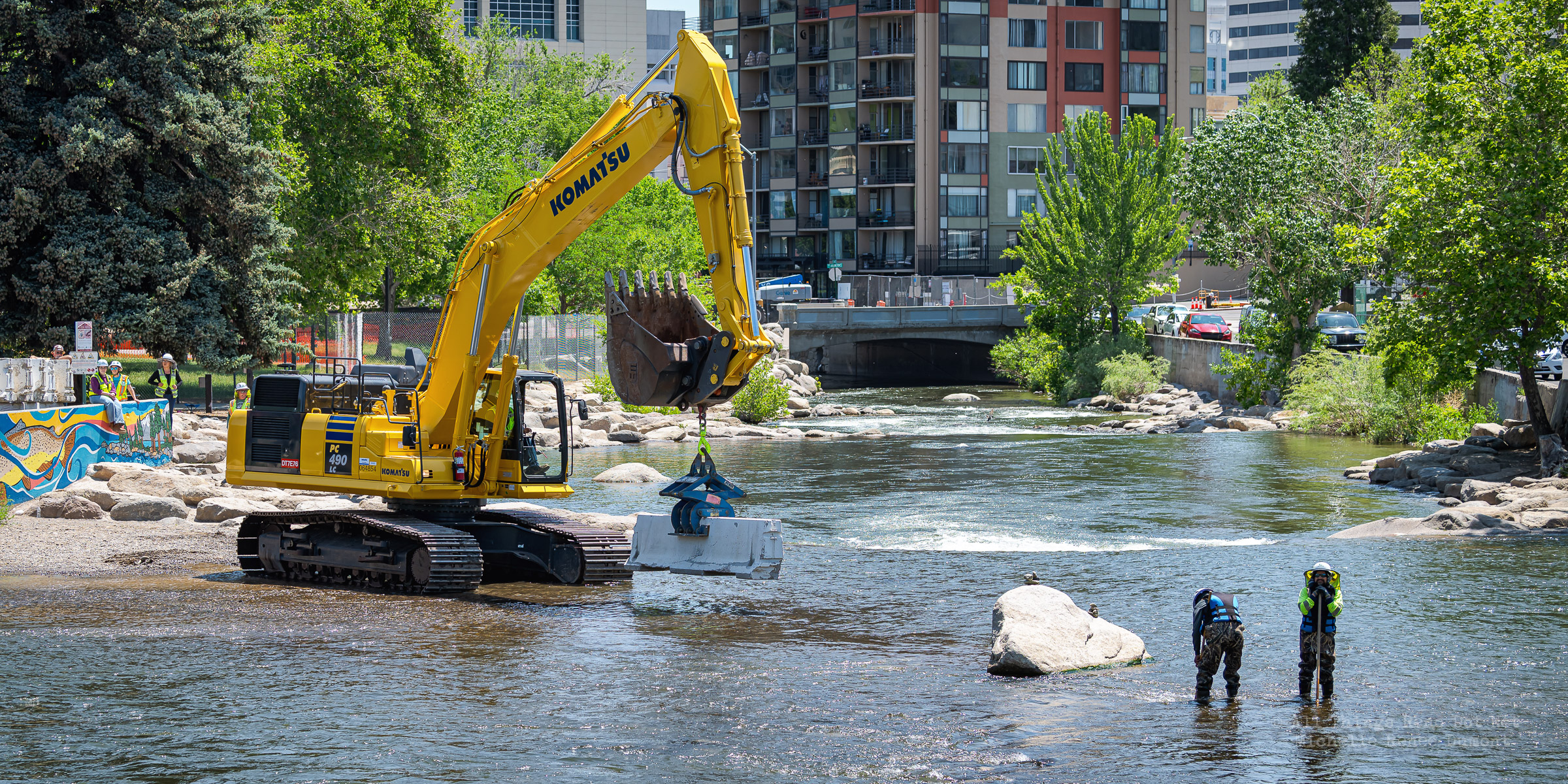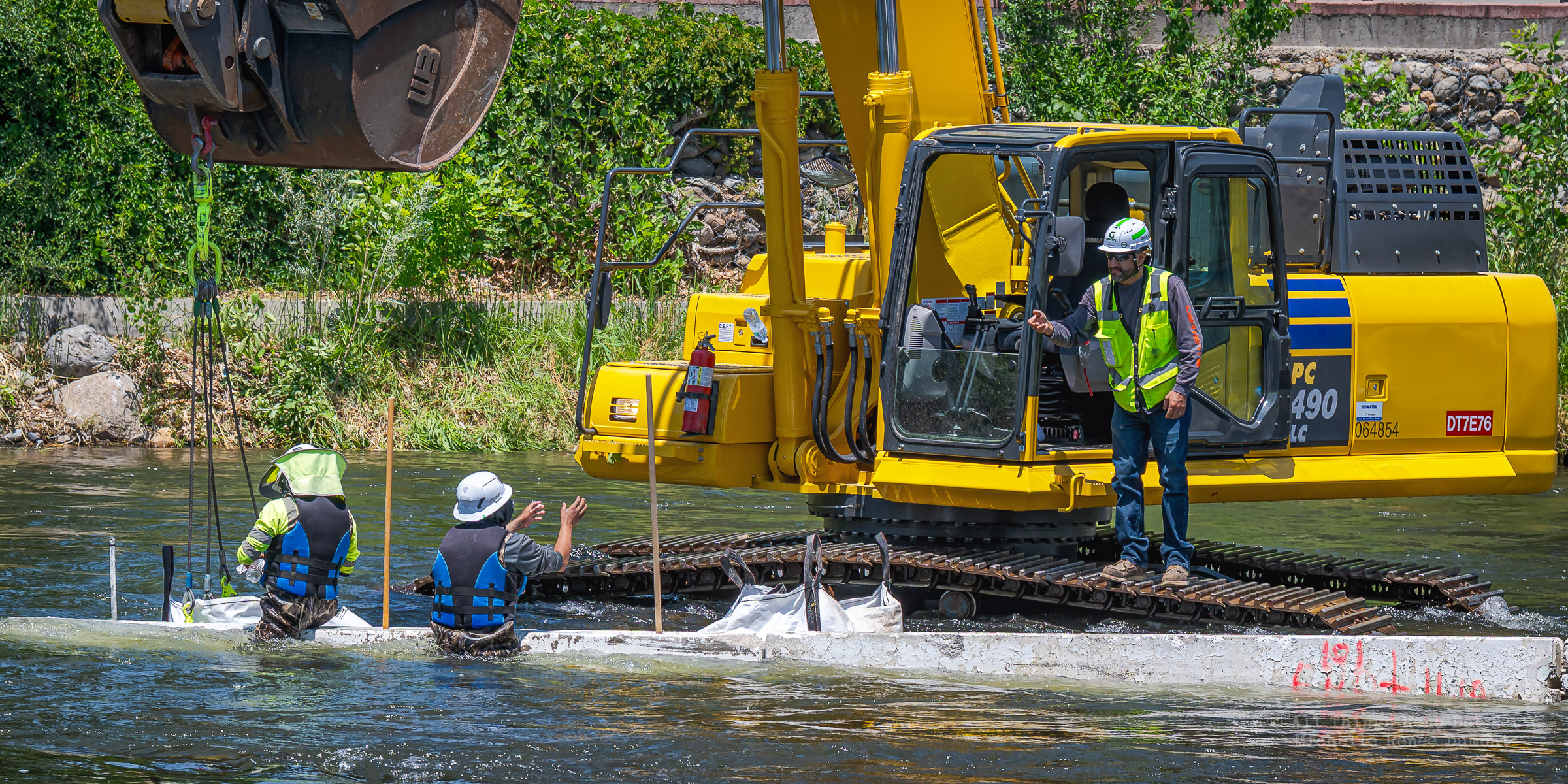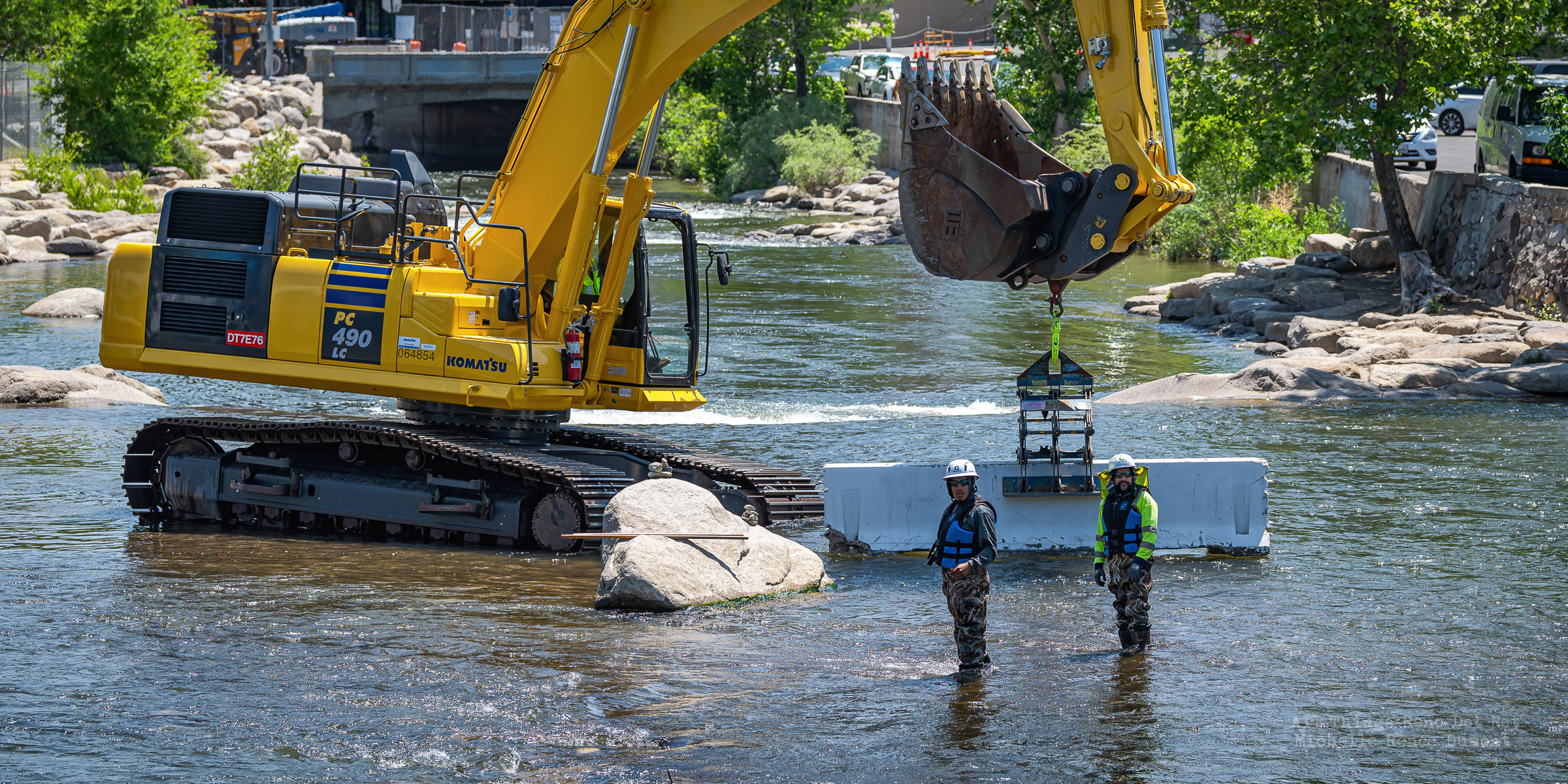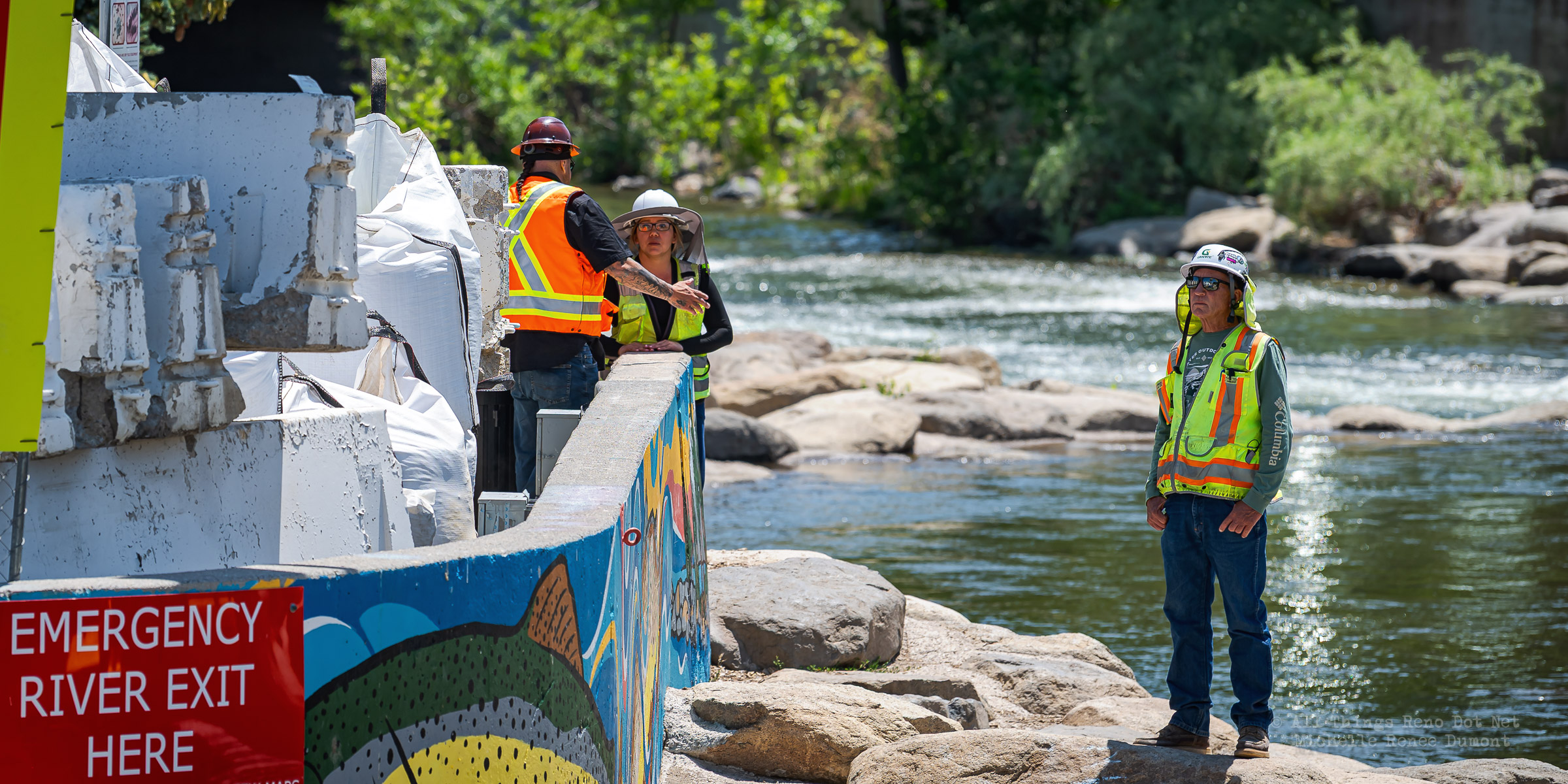 Workmen were busy moving sandbags and concrete barriers out Into the river to dam it up and reroute the flow to the south side channel of Wingfield Park.