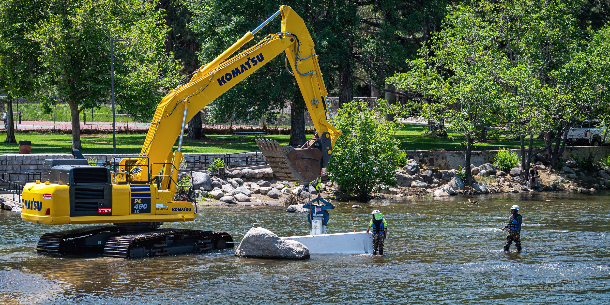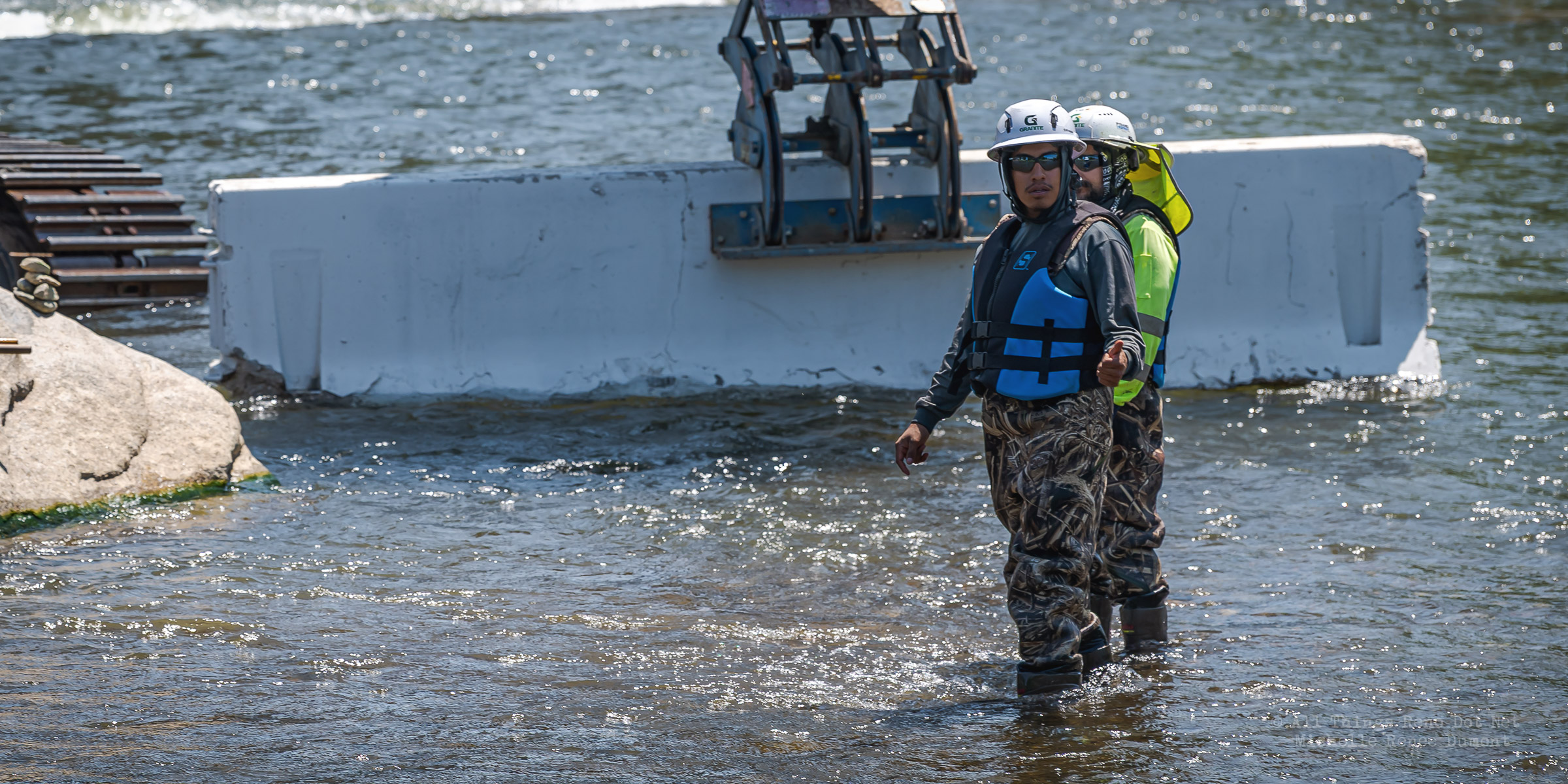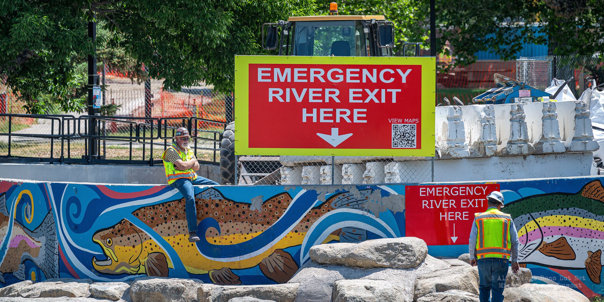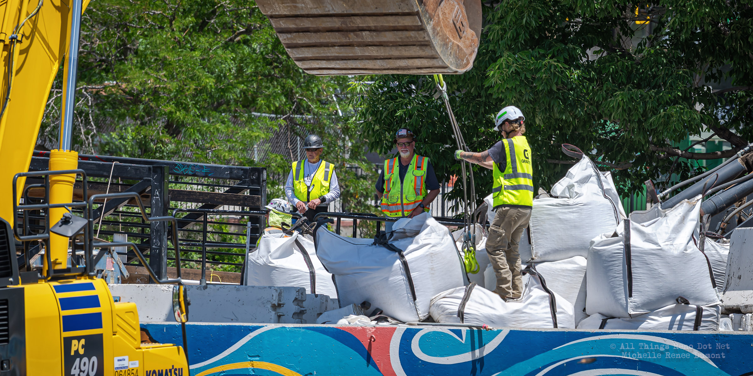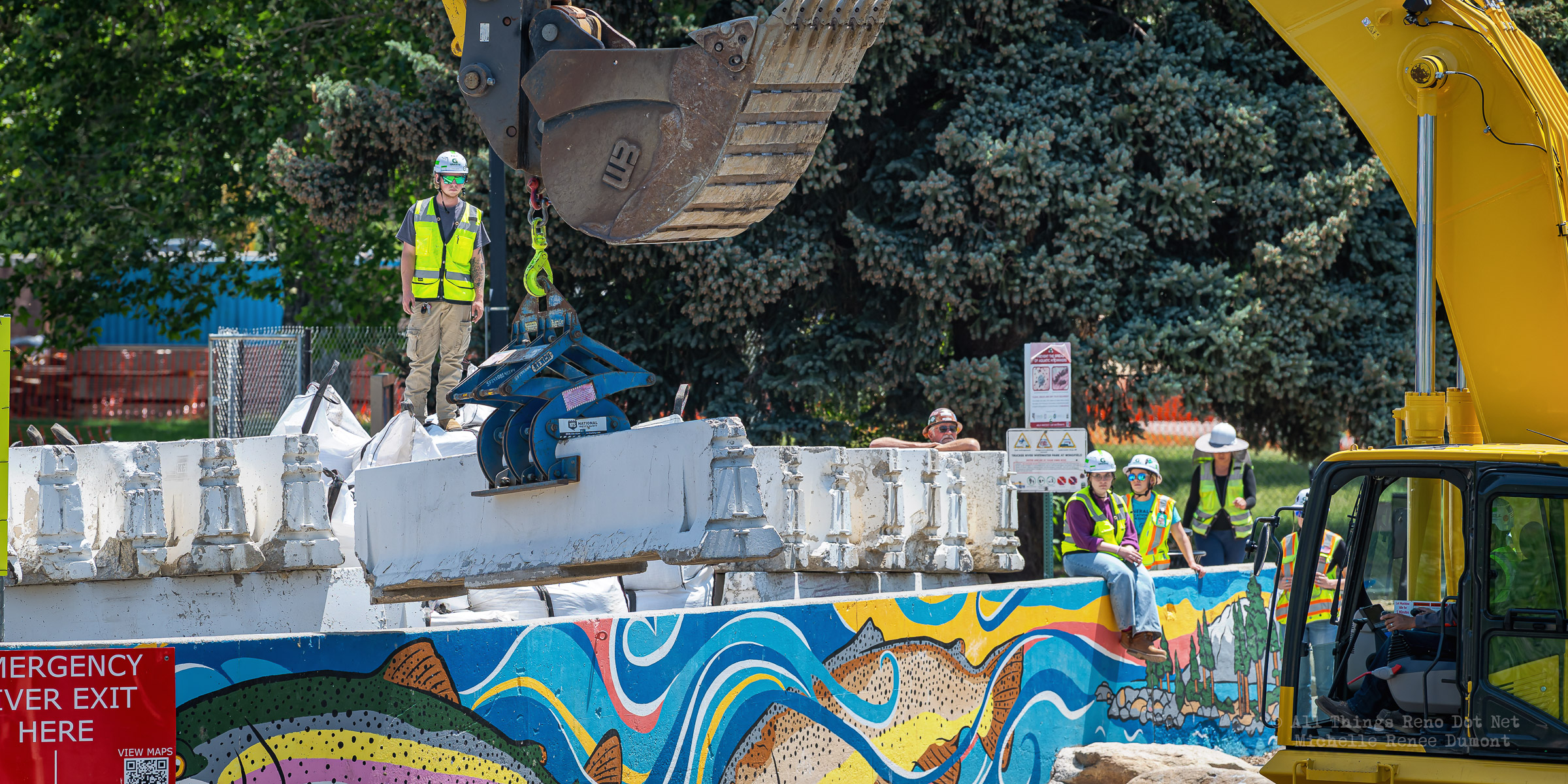 Workmen were busy moving sandbags and concrete barriers out Into the river to dam it up and reroute the flow to the south side channel of Wingfield Park.