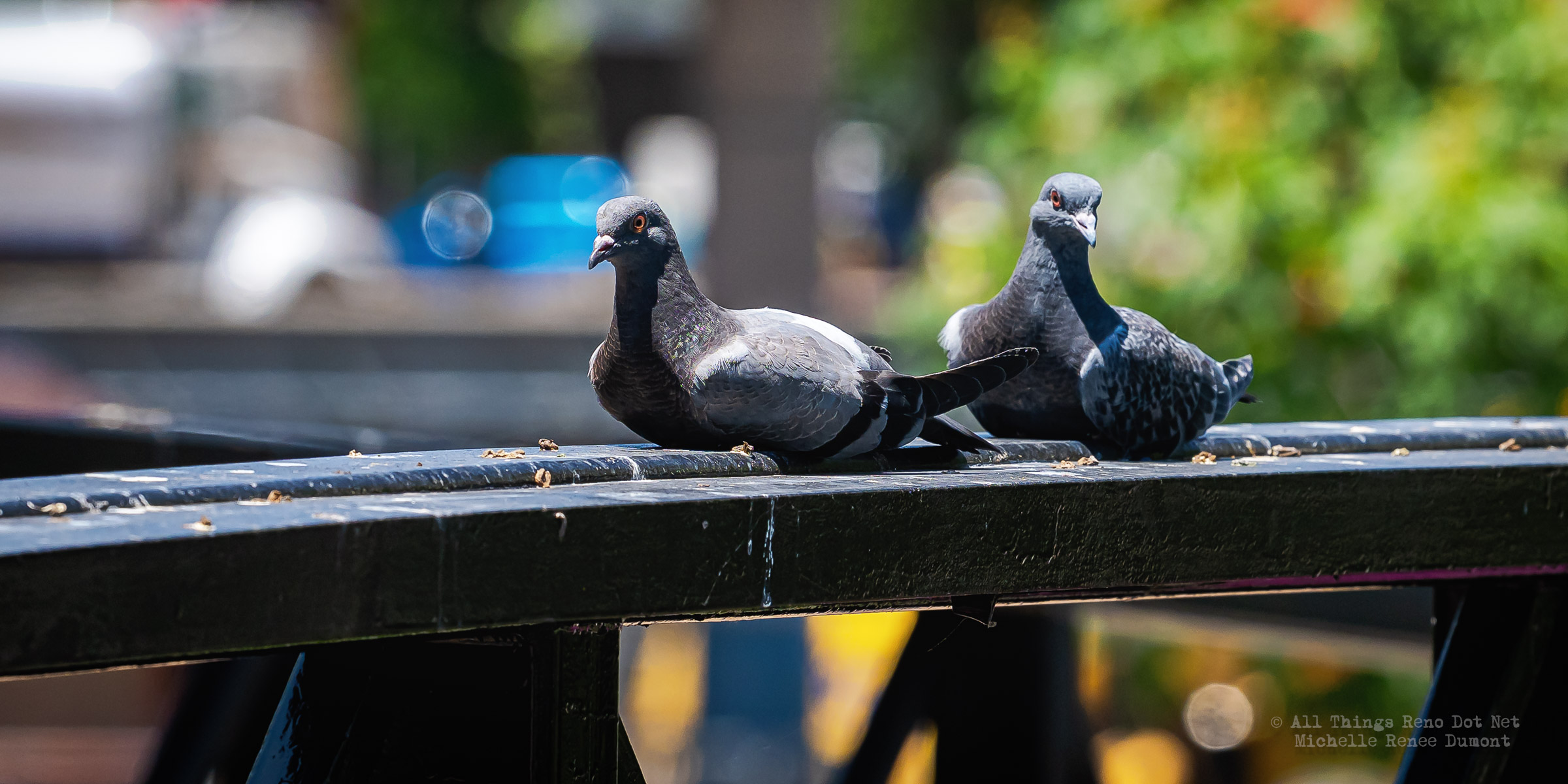 Pigeons chilling out on the pedestrian bridge while a Red Tailed Hawk is on the lookout for a meal above