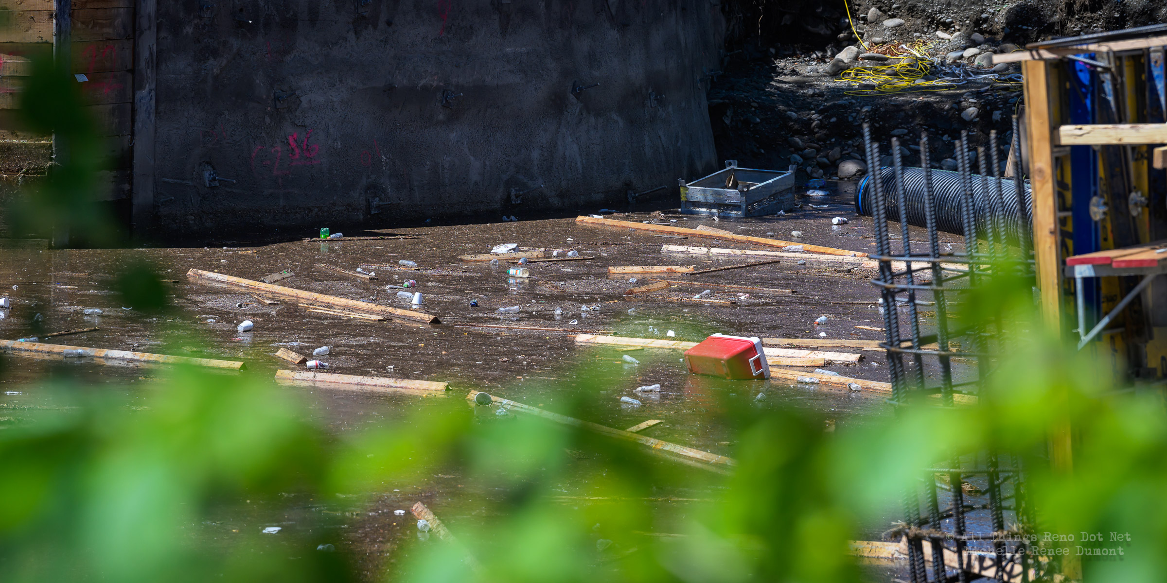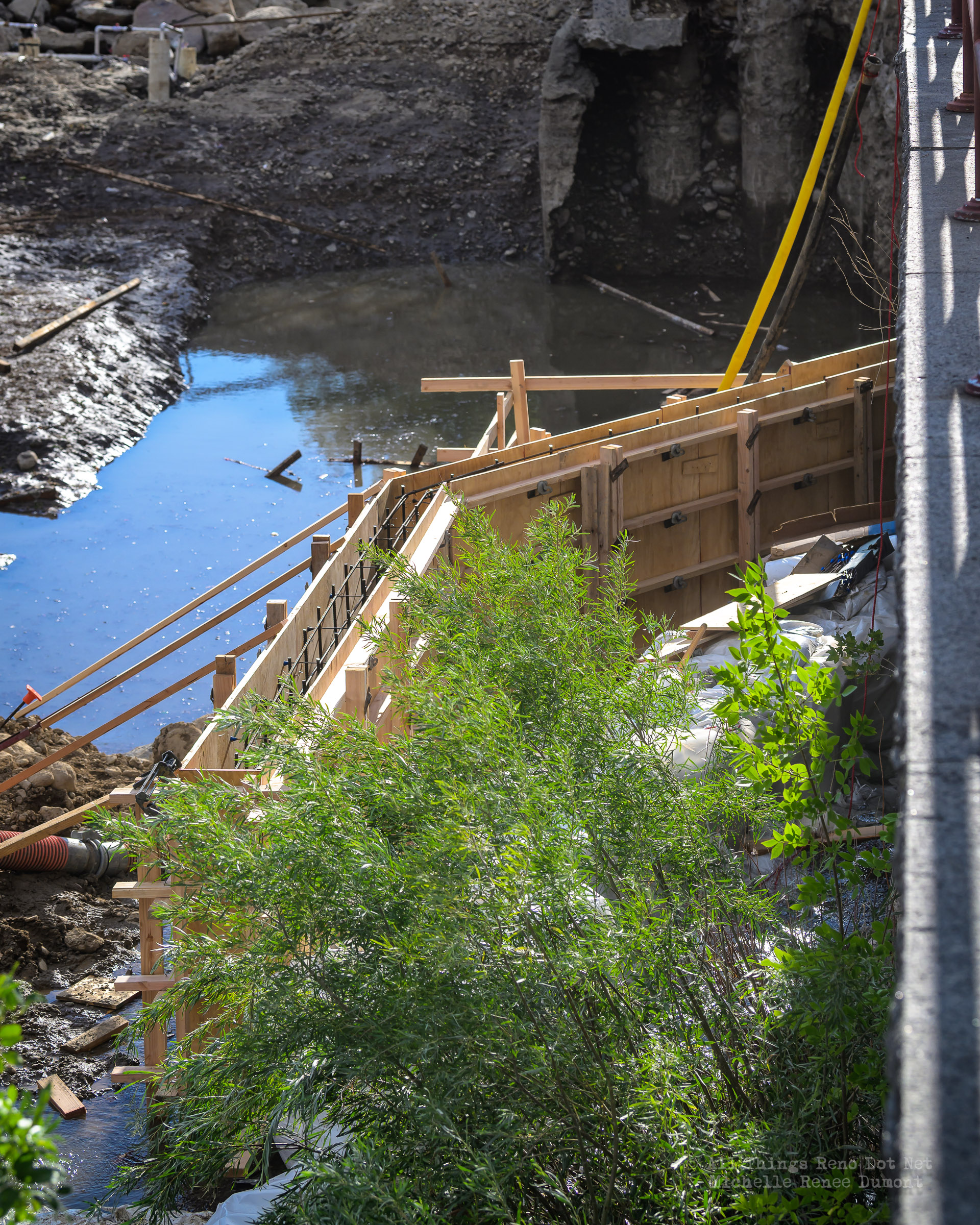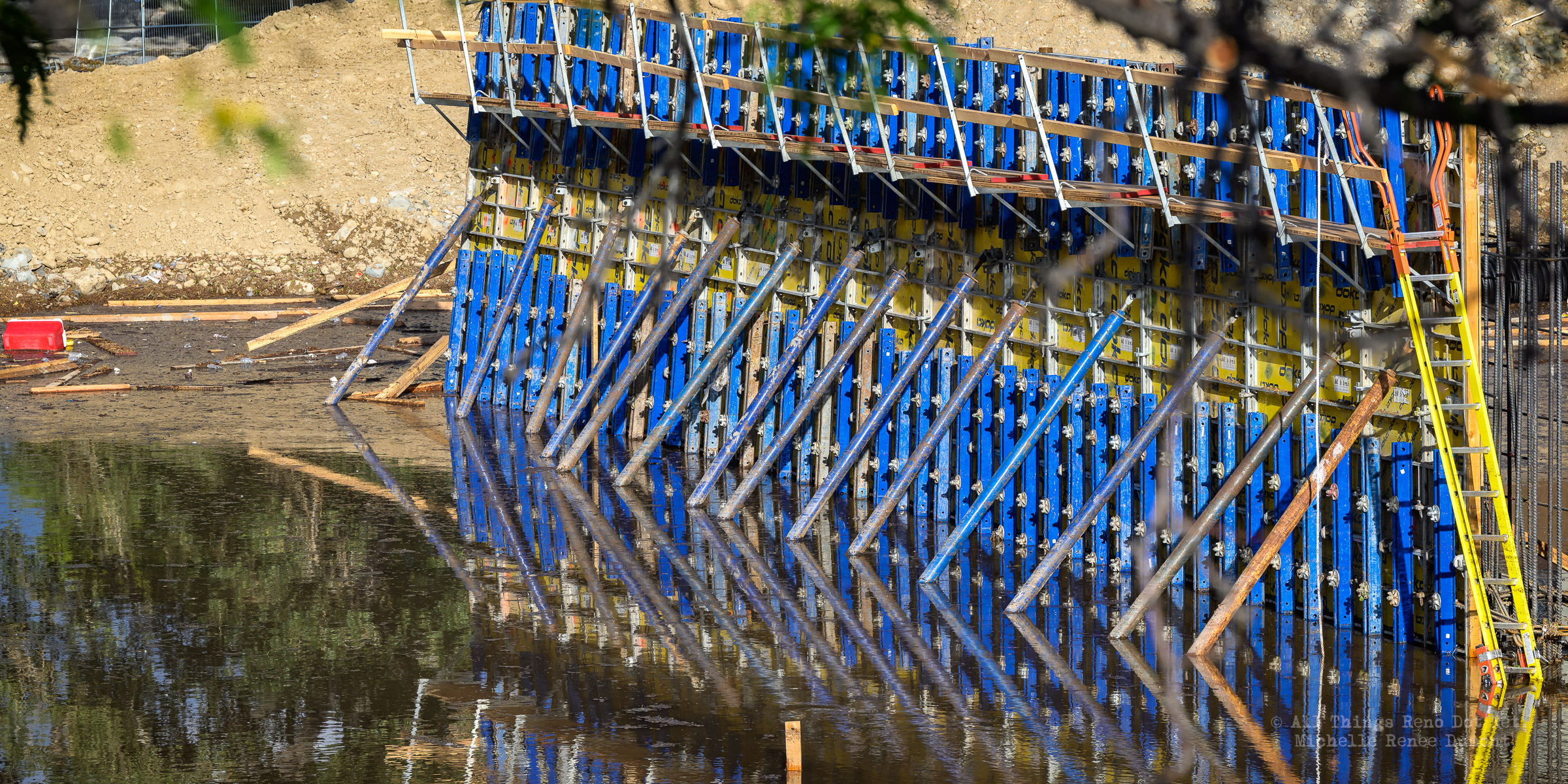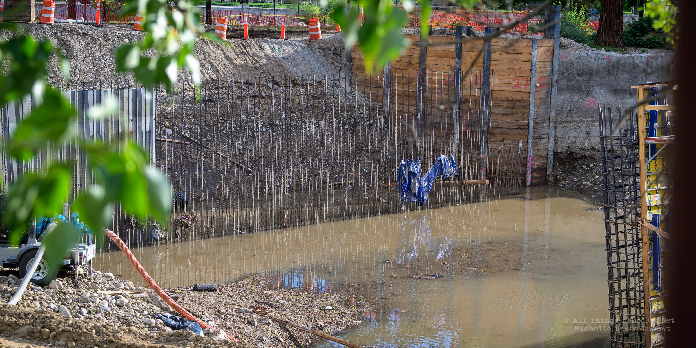 We had a fast moving thunderstorm move through the area last night that caused mud slides and storm drain backups that caused streets and intersections to flood. It also caused havoc with our bridge build site. A storm drain, that normally empties into the river, was being rerouted using a 12 inch pipe around the temporary dam built to protect the build site. The storm was so intense, it overwhelmed both the pipe and the smaller of the two Aqua Dams and caused flood waters to fill the build site. There’s probably 12-15 feet of water in the deepest sections covering all of the newly poured concrete.