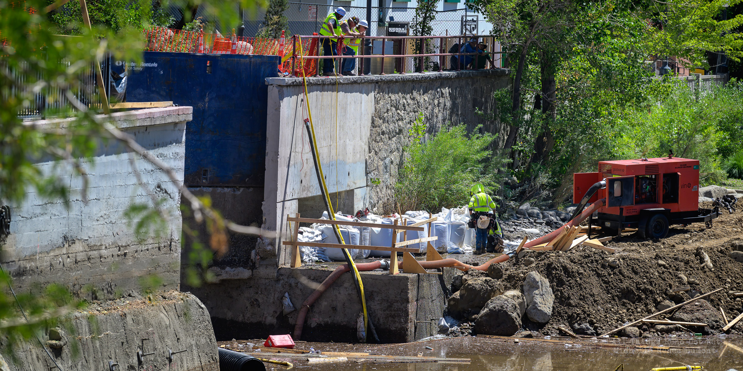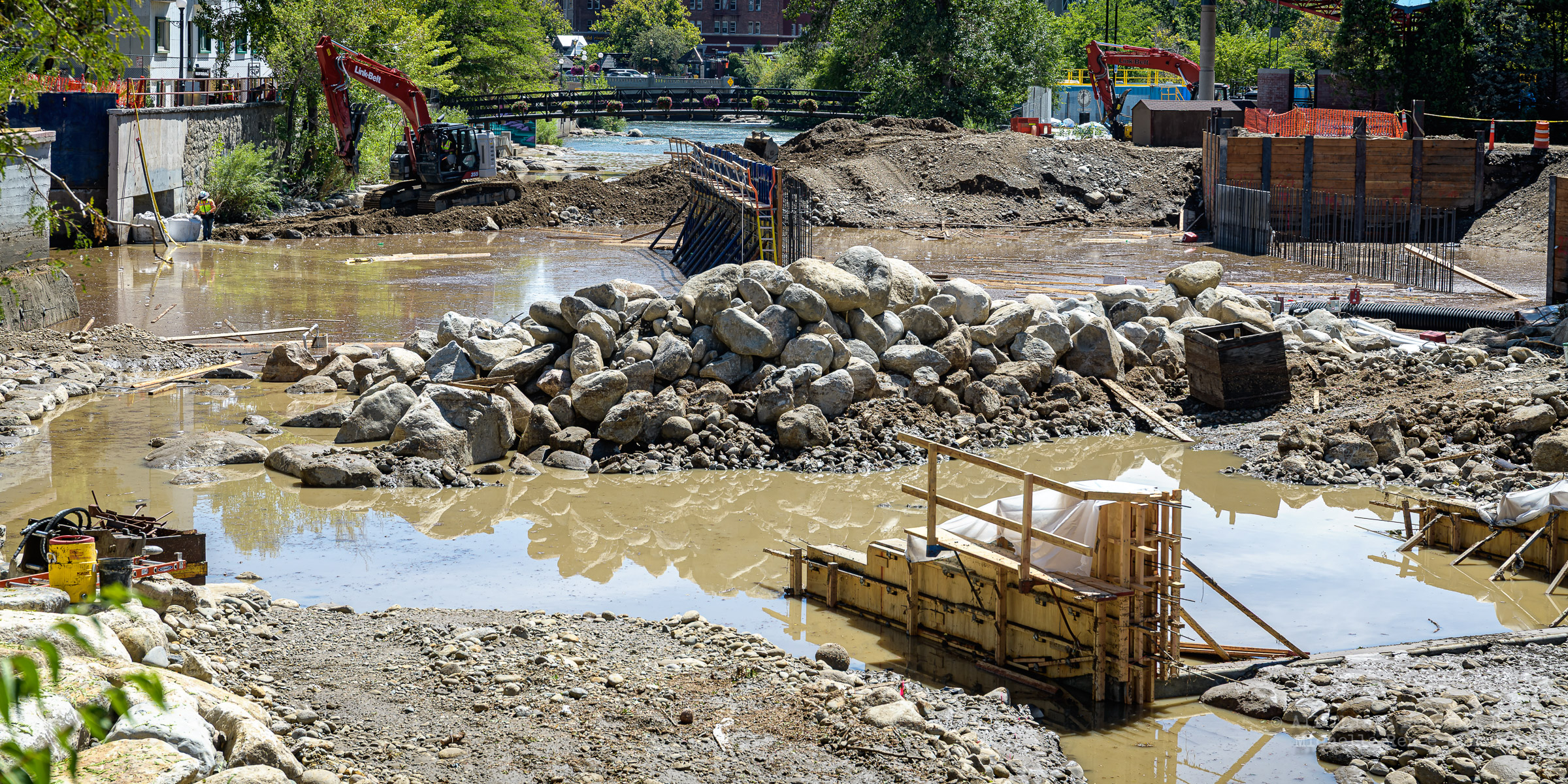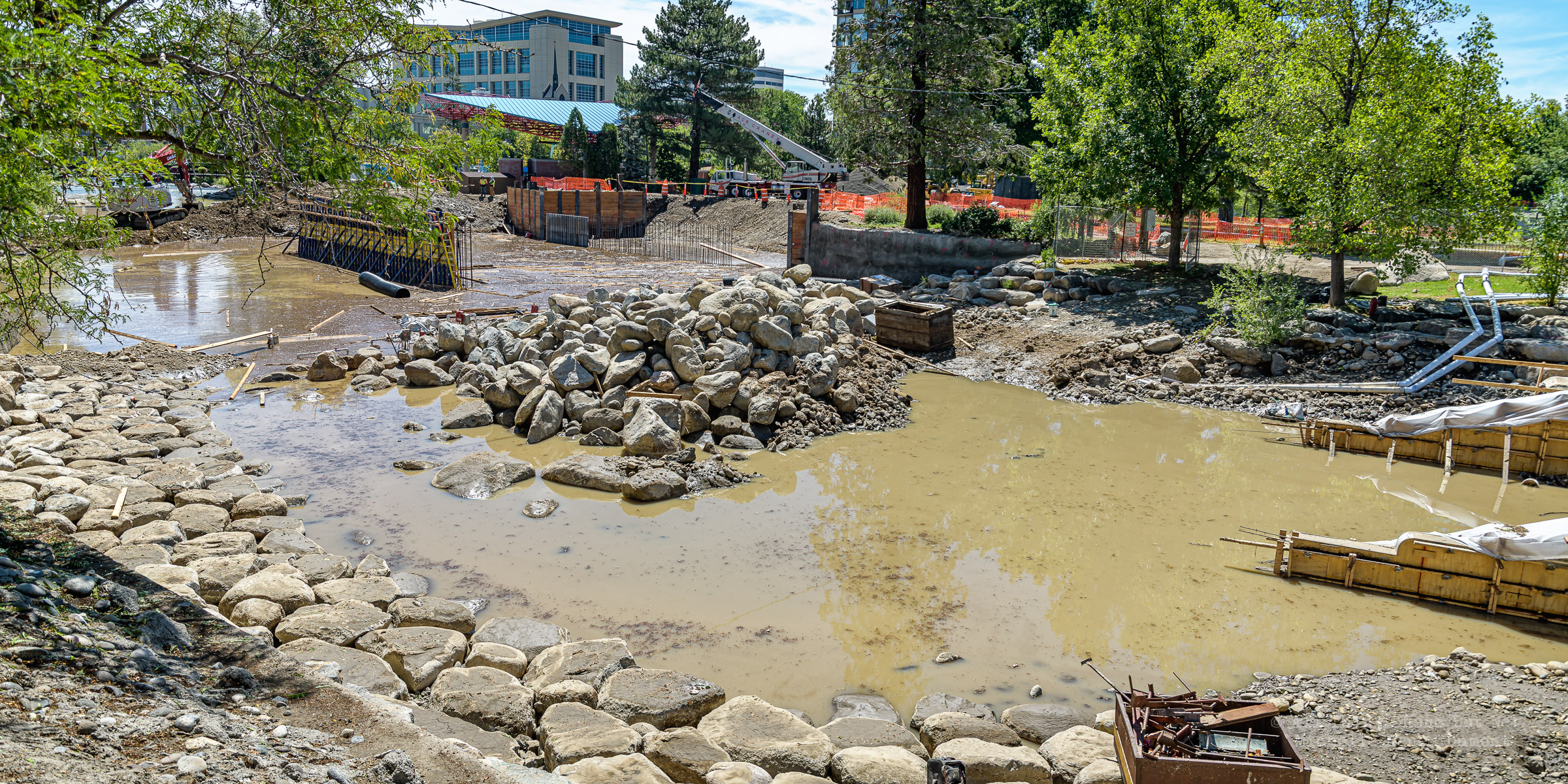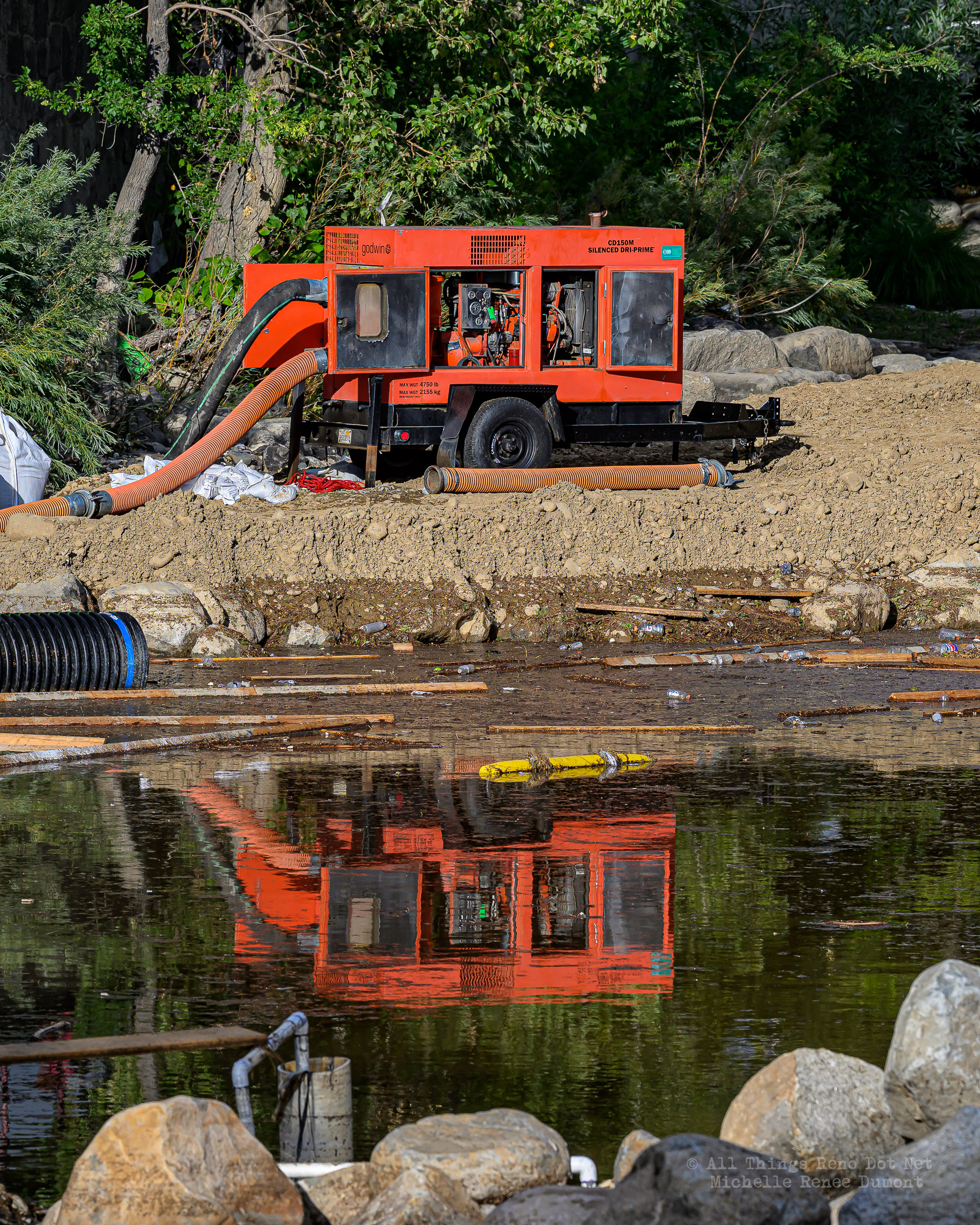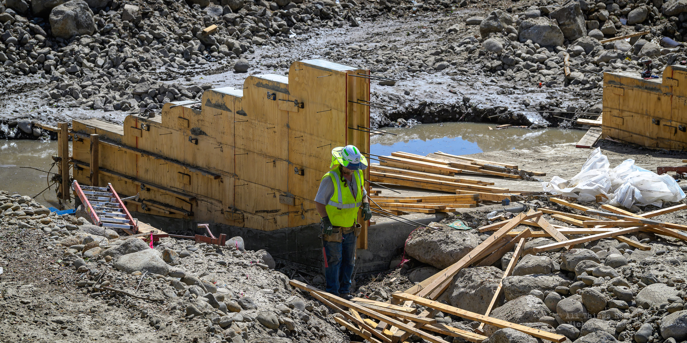 We had a fast moving thunderstorm move through the area last night that caused mud slides and storm drain backups that caused streets and intersections to flood. It also caused havoc with our bridge build site. A storm drain, that normally empties into the river, was being rerouted using a 12 inch pipe around the temporary dam built to protect the build site. The storm was so intense, it overwhelmed both the pipe and the smaller of the two Aqua Dams and caused flood waters to fill the build site. There’s probably 12-15 feet of water in the deepest sections covering all of the newly poured concrete.