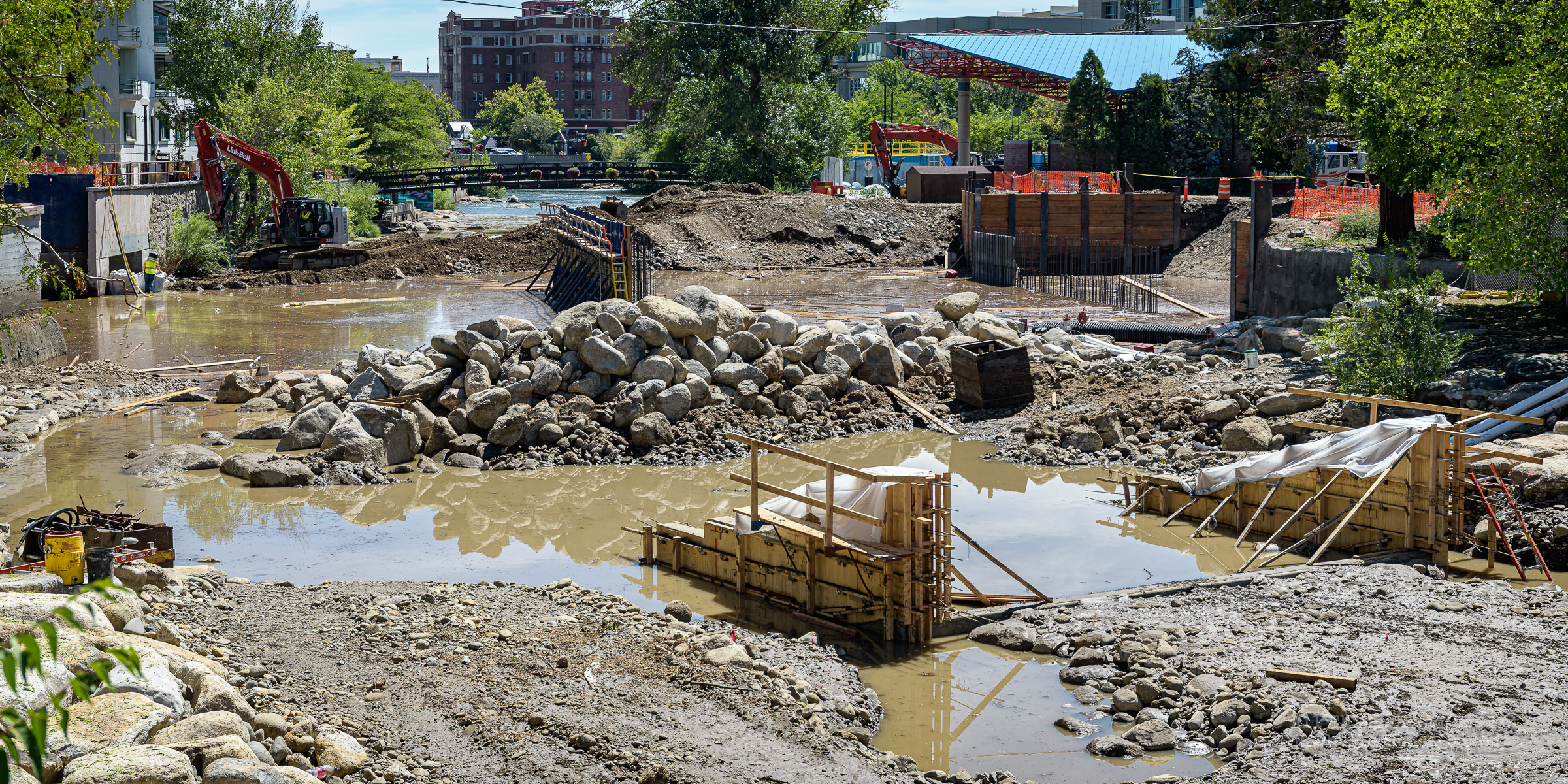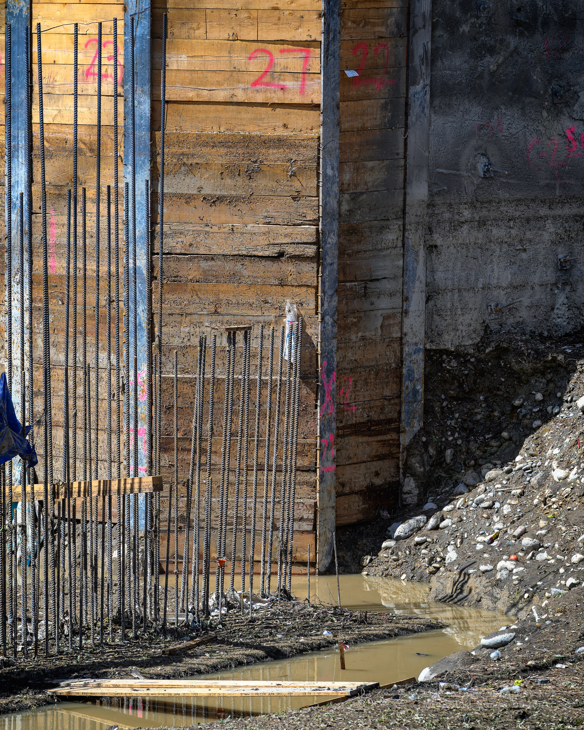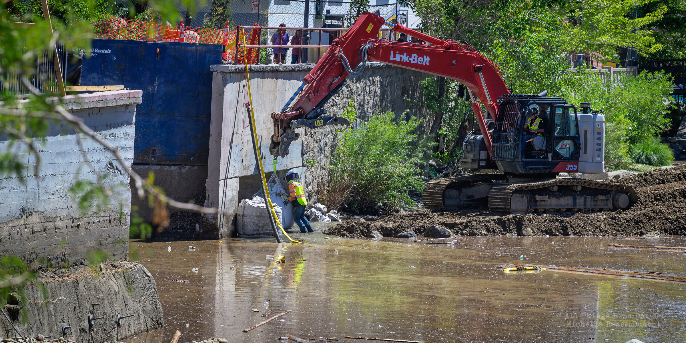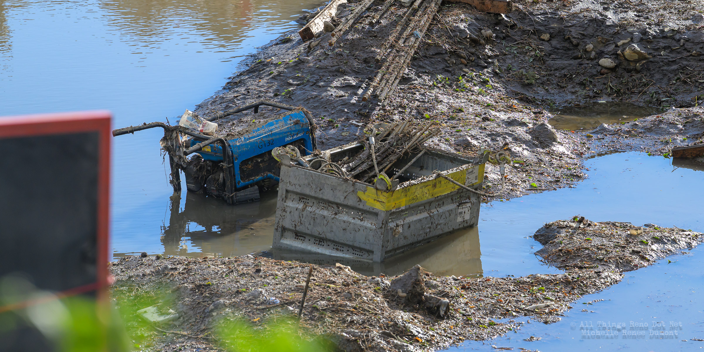 We had a fast moving thunderstorm move through the area last night that caused mud slides and storm drain backups that caused streets and intersections to flood. It also caused havoc with our bridge build site. A storm drain, that normally empties into the river, was being rerouted using a 12 inch pipe around the temporary dam built to protect the build site. The storm was so intense, it overwhelmed both the pipe and the smaller of the two Aqua Dams and caused flood waters to fill the build site. There’s probably 12-15 feet of water in the deepest sections covering all of the newly poured concrete.