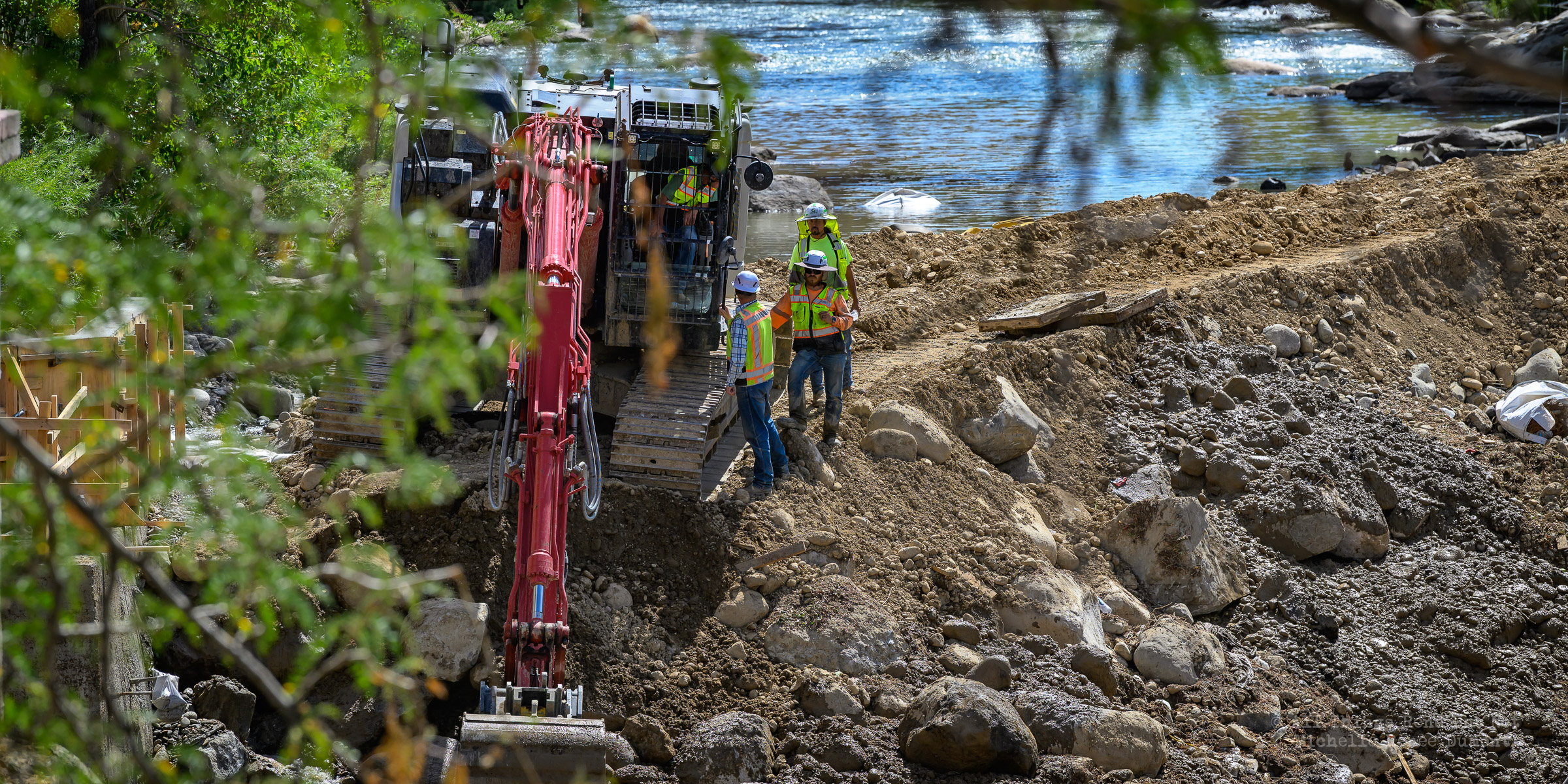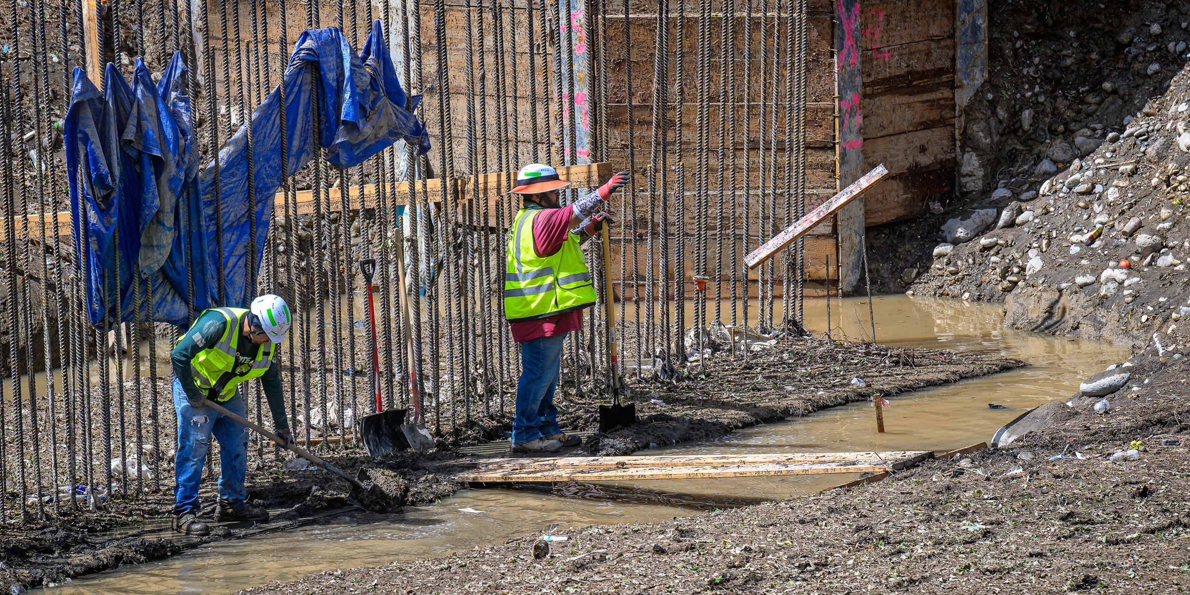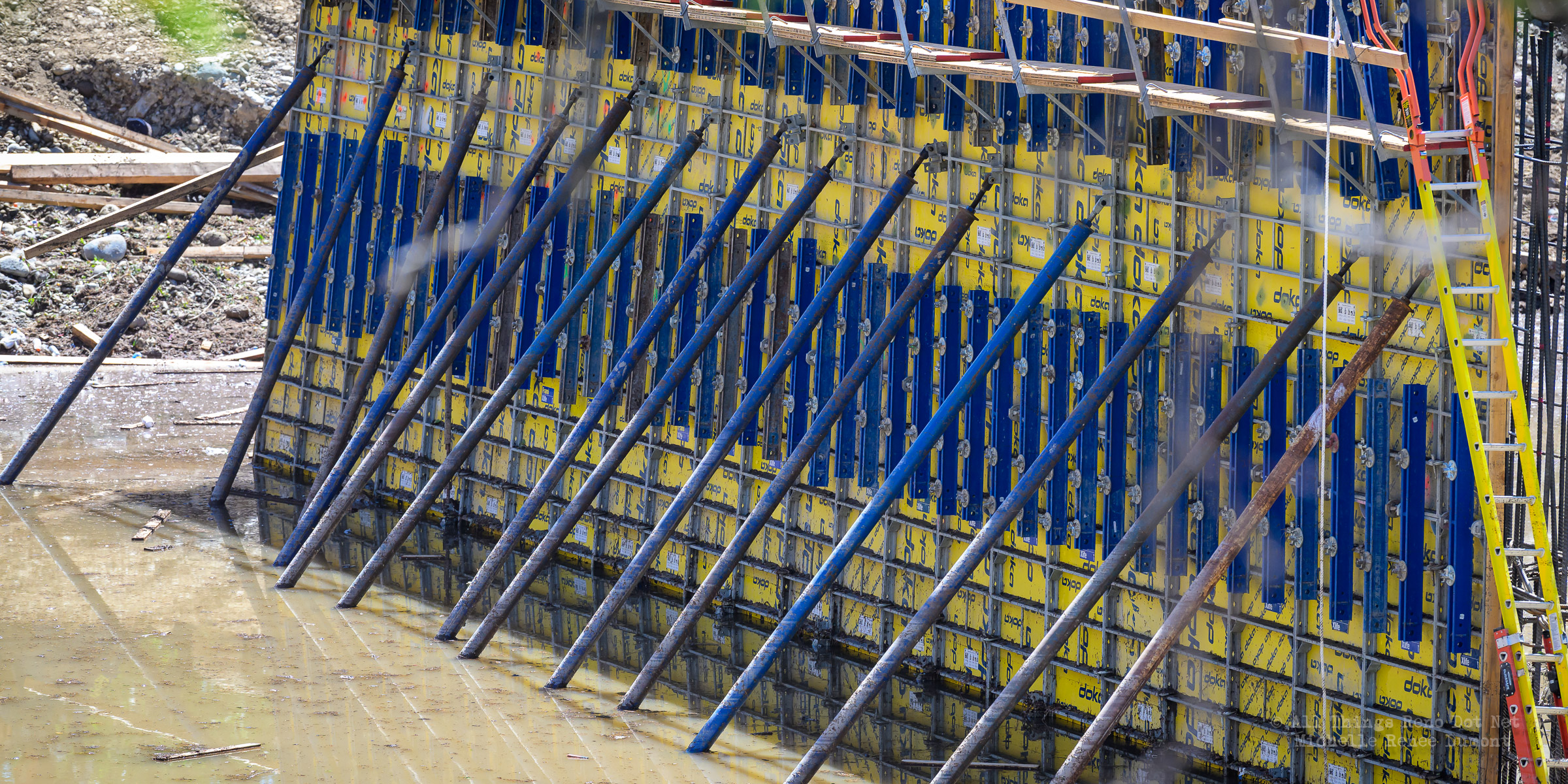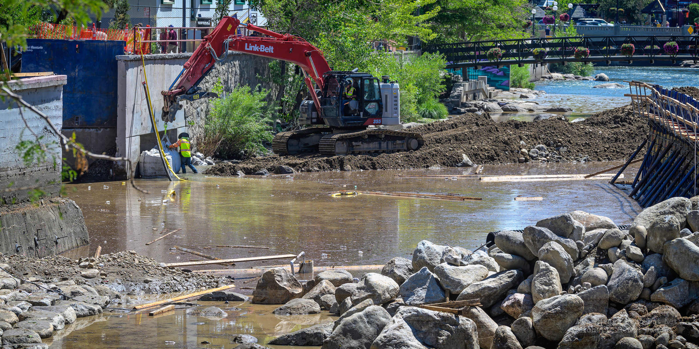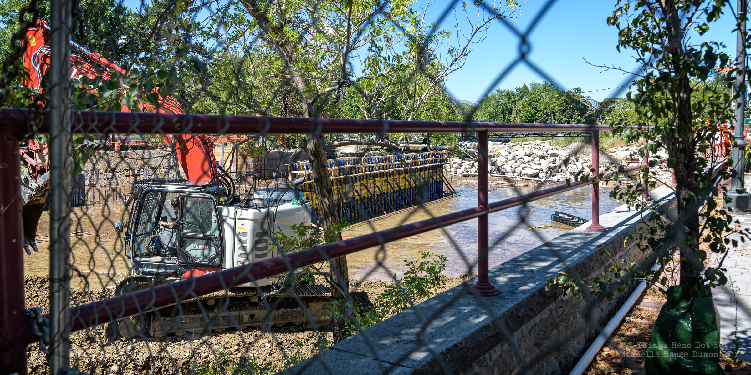 We had a fast moving thunderstorm move through the area last night that caused mud slides and storm drain backups that caused streets and intersections to flood. It also caused havoc with our bridge build site. A storm drain, that normally empties into the river, was being rerouted using a 12 inch pipe around the temporary dam built to protect the build site. The storm was so intense, it overwhelmed both the pipe and the smaller of the two Aqua Dams and caused flood waters to fill the build site. There’s probably 12-15 feet of water in the deepest sections covering all of the newly poured concrete.