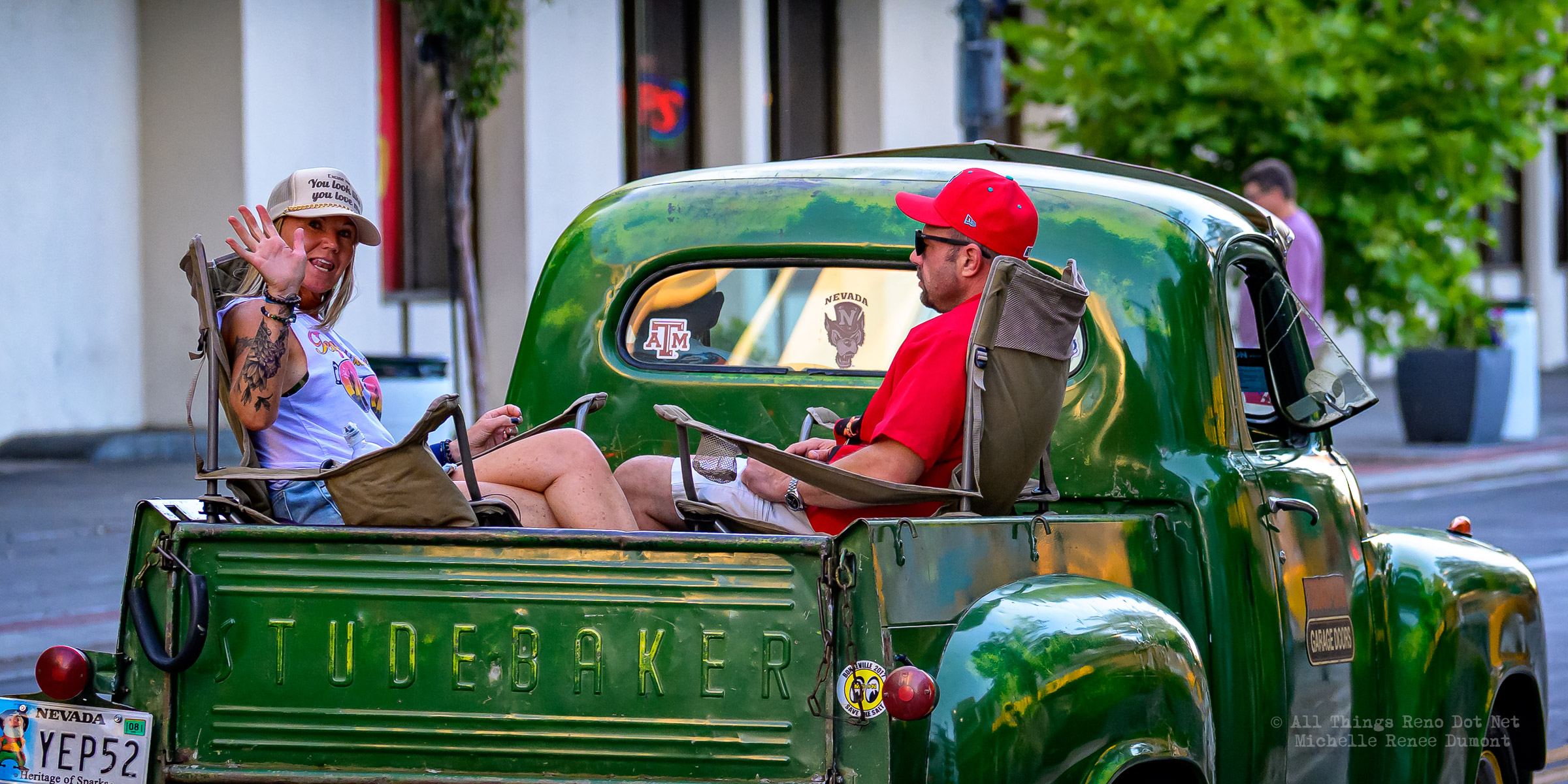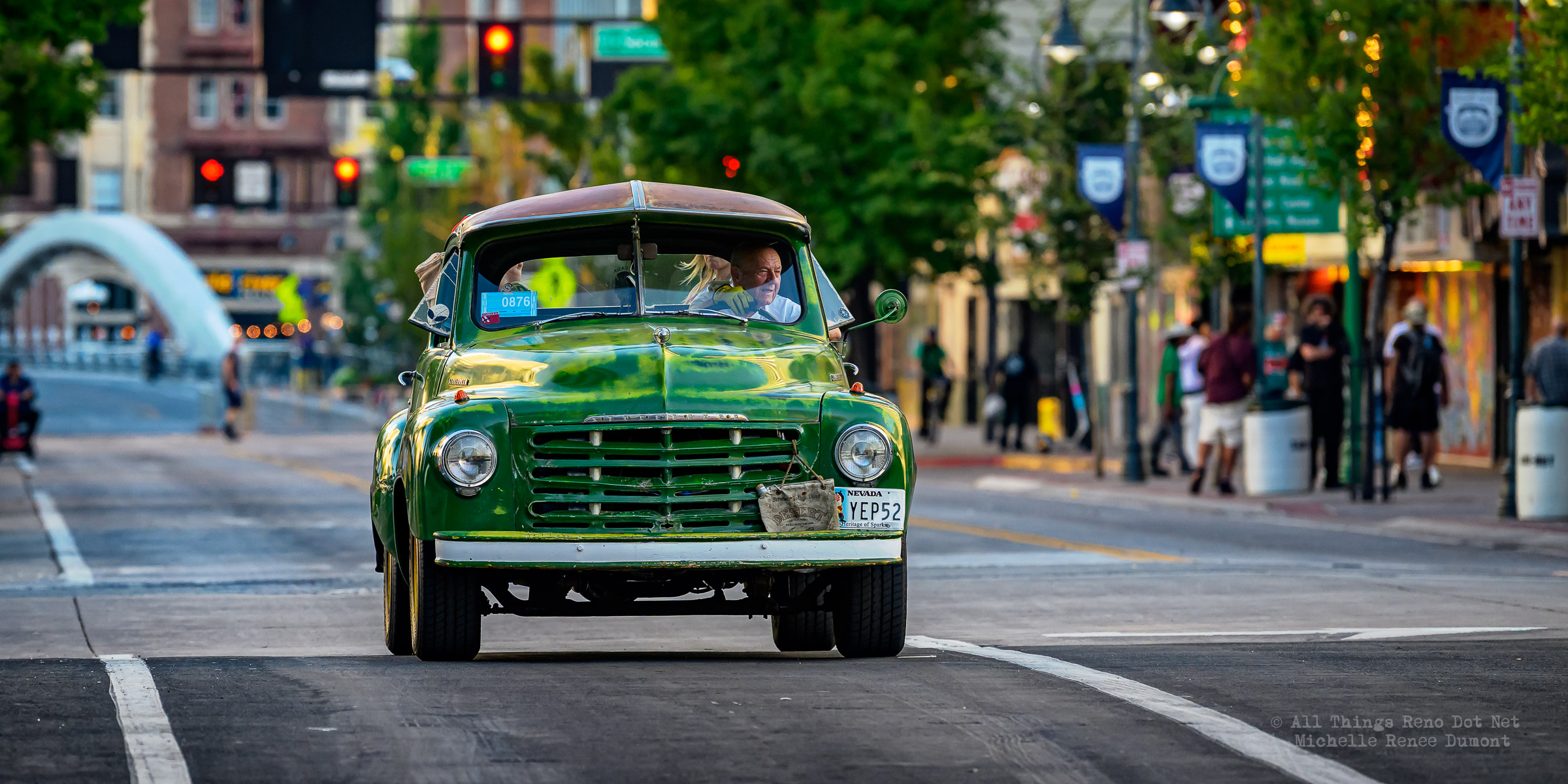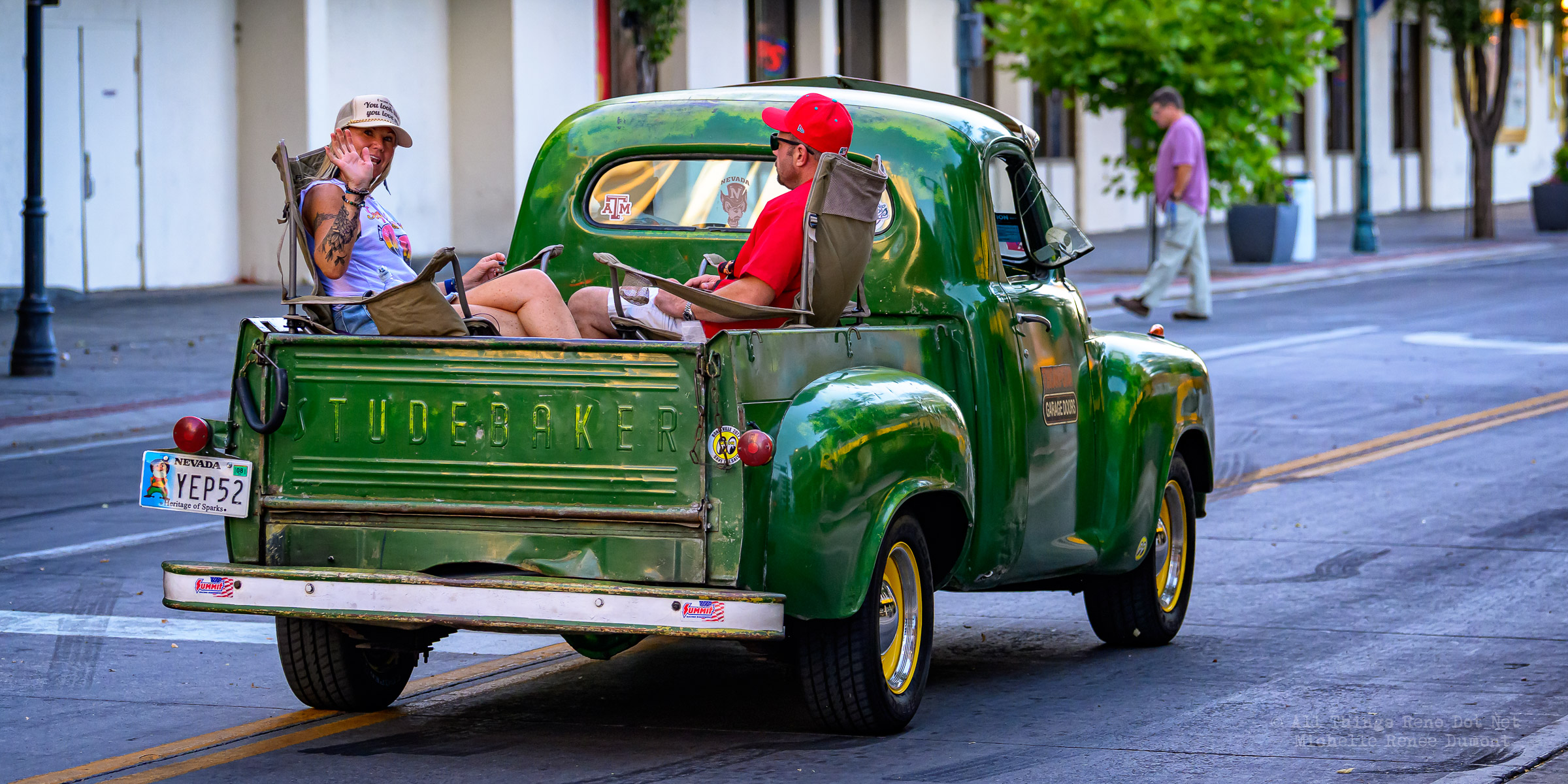 The streets are blocked off and the vendors have their tents ready with merchandise for the crowds that make their way down to city center to enjoy the parade of classic cars down Virginia Street. This guy, driving his classic Studebaker pickup, was just making a test run. The big cruise starts on Wednesday