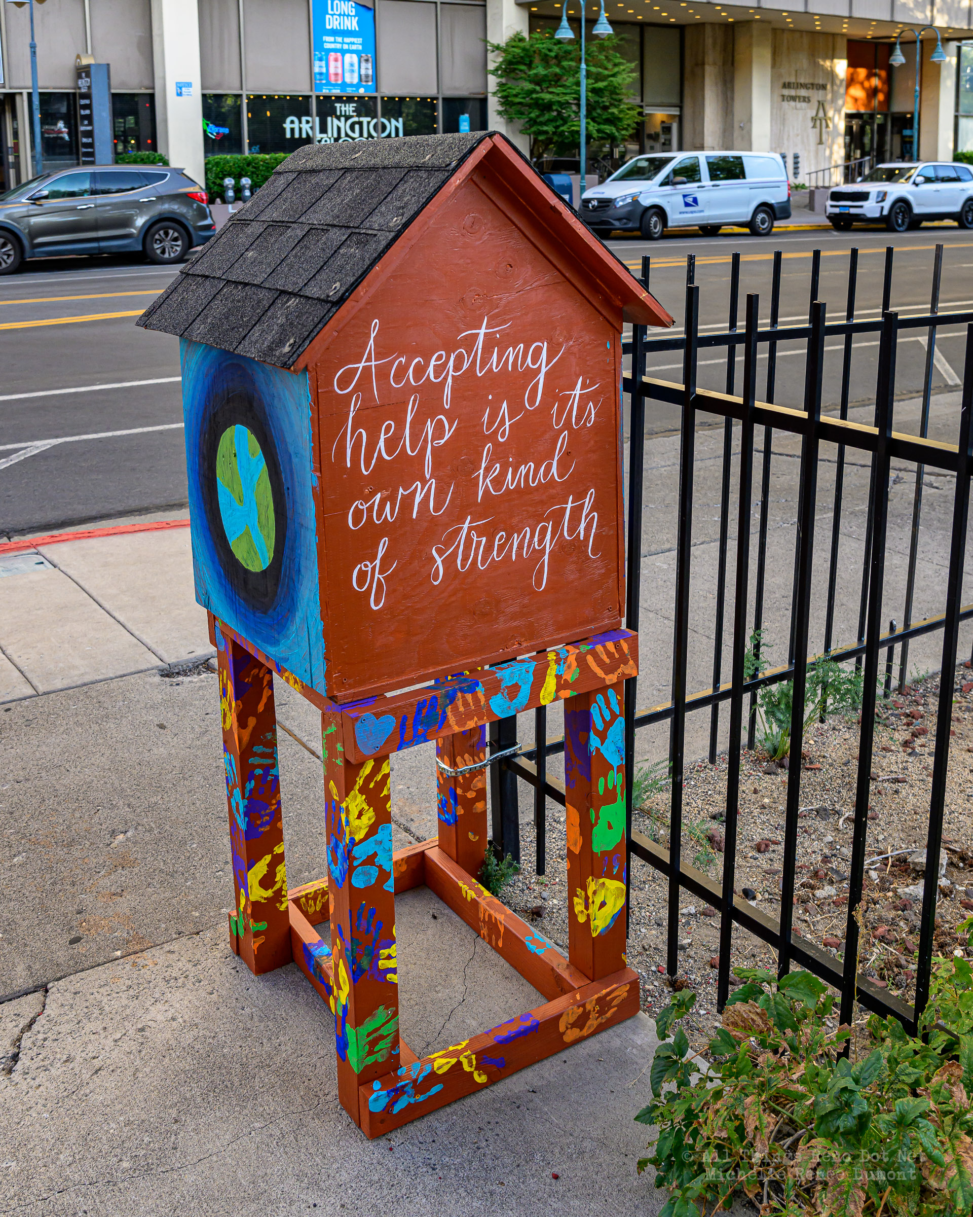 The Karma Box Project is a community based project to provide the homeless their daily needs, such as socks, tooth brushes, snacks, etc. Boxes are scattered in and around the downtown area. This box, which is located outside the Saint Thomas Aquinas Cathedral school grounds, replaces a smaller version of the box that seemed to get vandalized on a regular basis.
