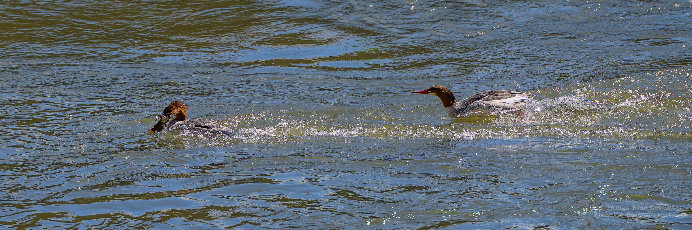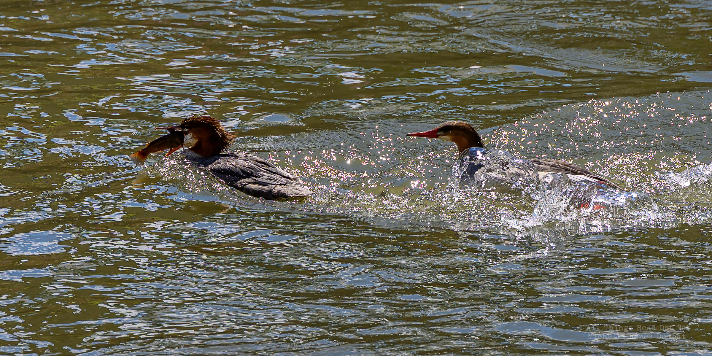 A young female Common Merganser caught herself a small trout and wasn’t interested in sharing her loot with those in pursuit. But she was having difficulty getting her prize catch down her throat. Especially while being pursued.
