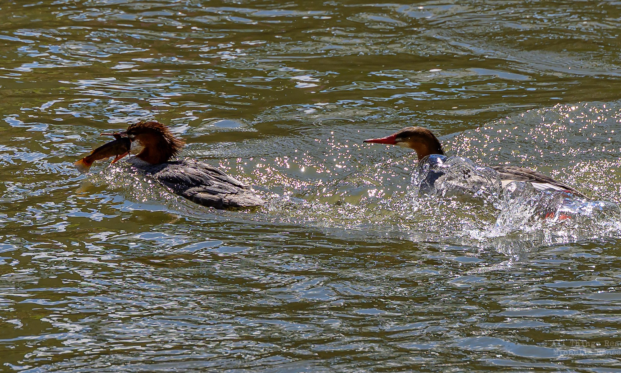A young female Common Merganser caught herself a small trout and wasn’t interested in sharing her loot with those in pursuit. But she was having difficulty getting her prize catch down her throat. Especially while being pursued.