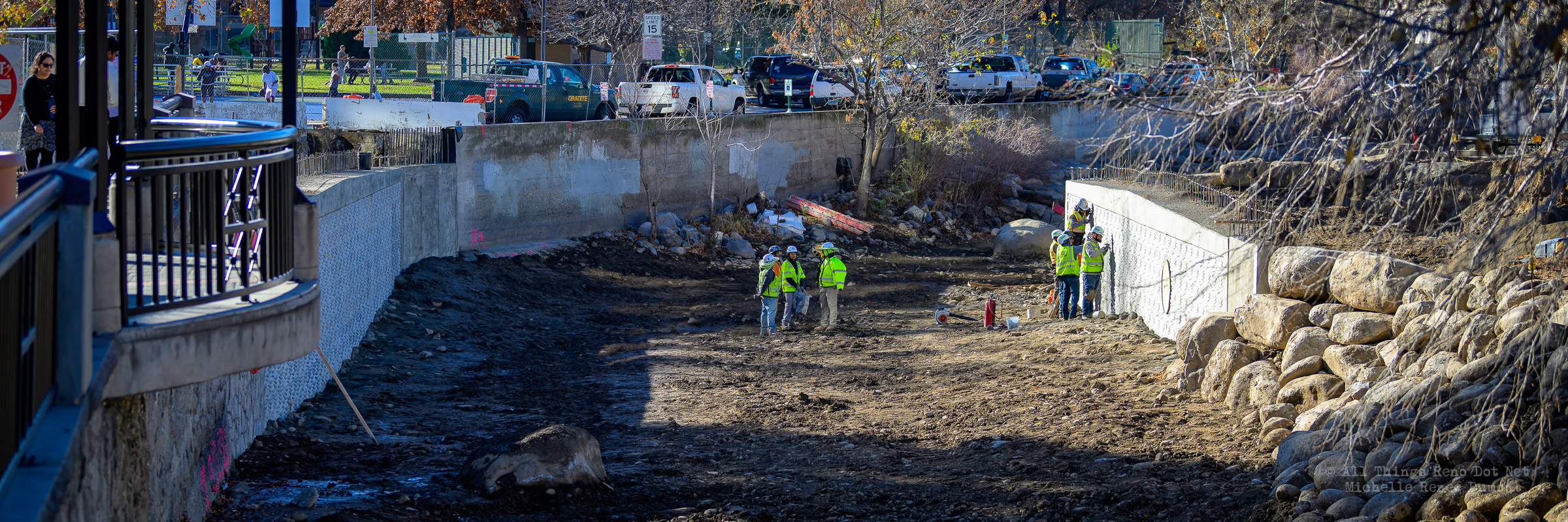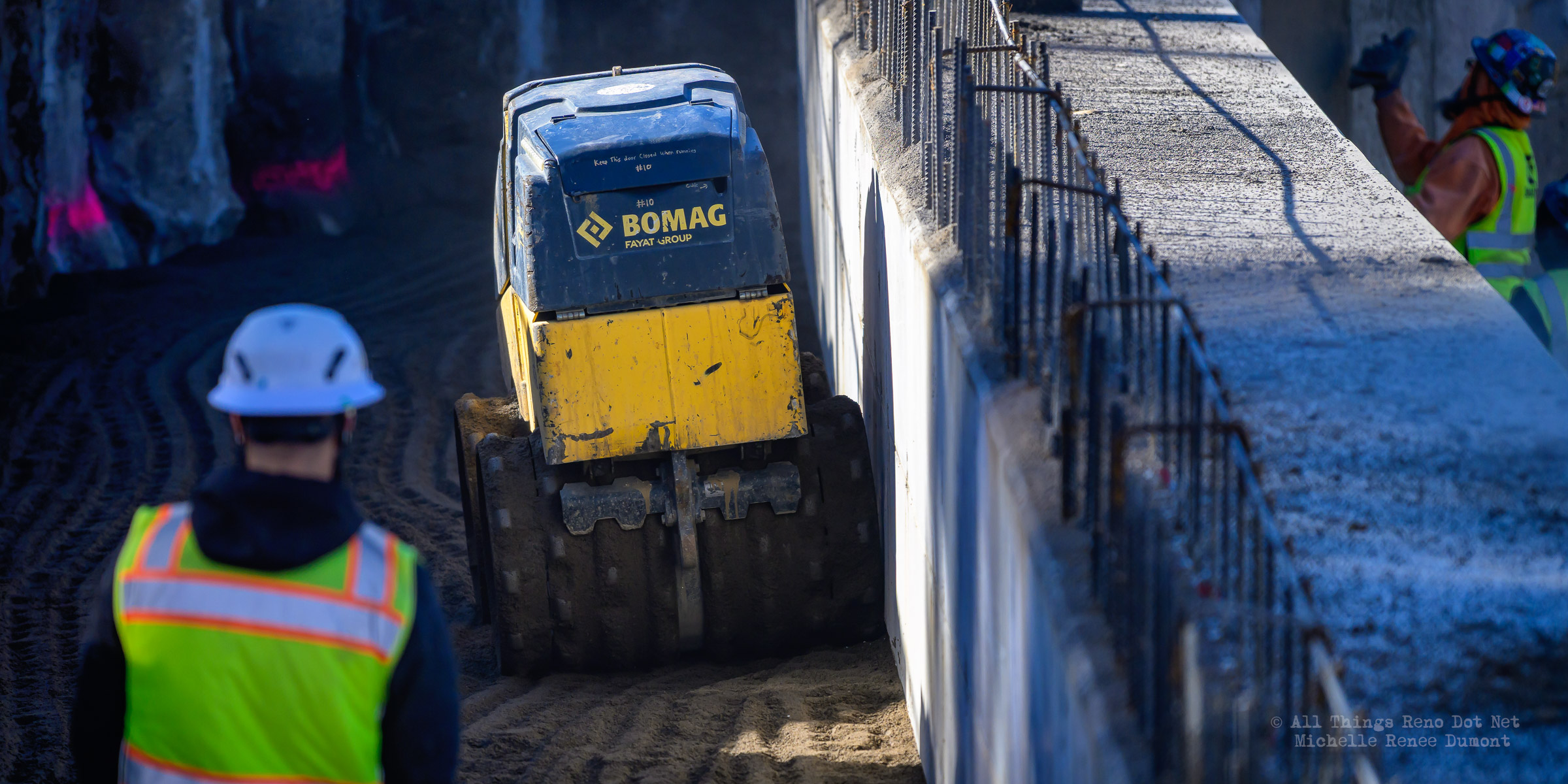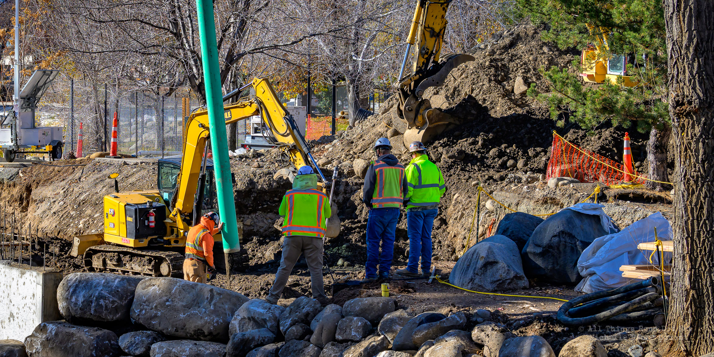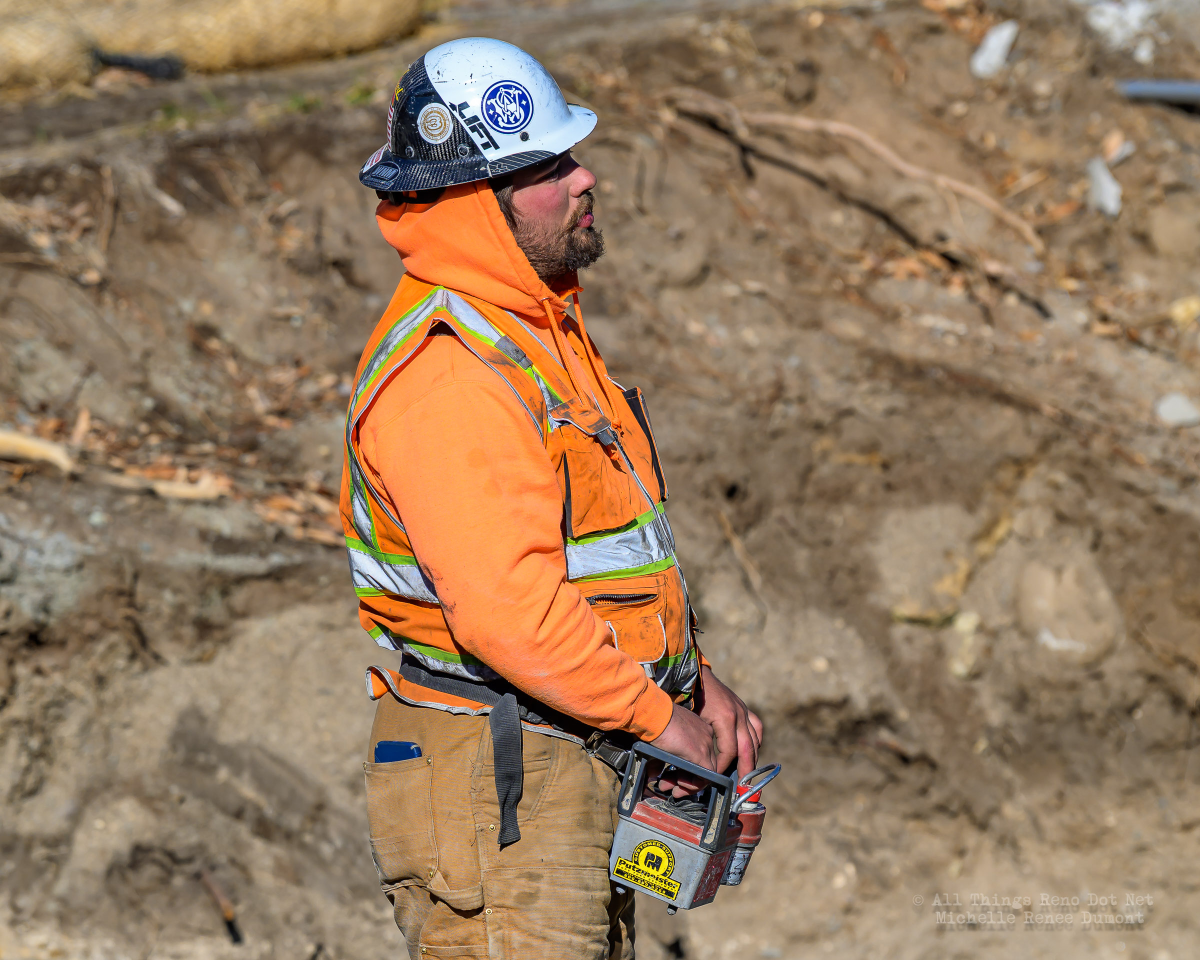 Under the close watchful eye of Supervisors, crews were out on a cold autumn Saturday morning working on back filling the bridge abutments in anticipation of the upcoming scheduled reopening of the river. Some were busy removing any imperfections and/or rough edges in the abutment concrete, while others were moving boulders around like they were pebbles with the Excavator.
